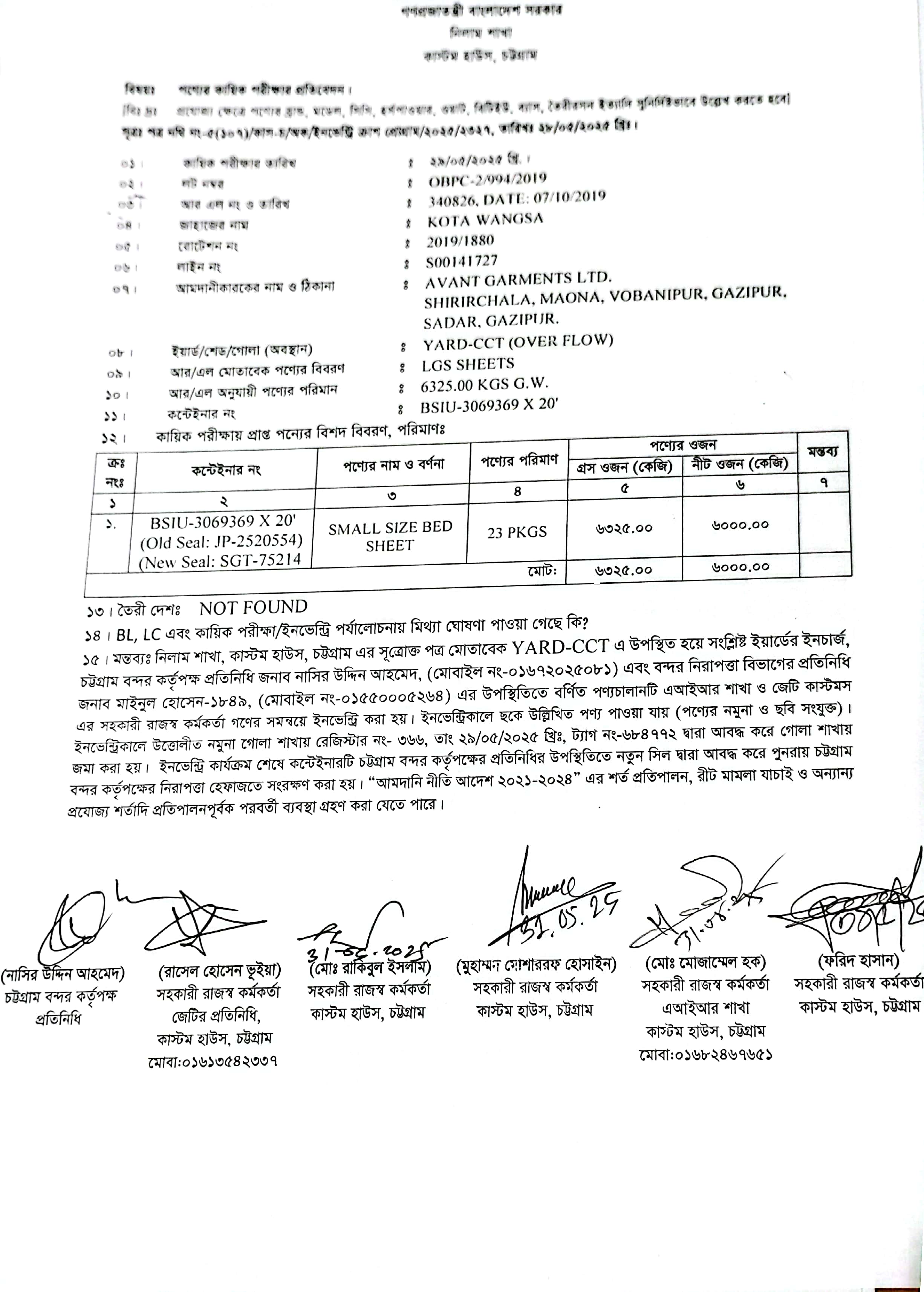 Terms & condition : আমদানি নীতি আদেশ এবং বিদ্যমান অন্যান্য আইন ও বিধি-বিধানের প্রযোজ্য সকল শর্ত পরিপালন এবং প্রযোজ্য ক্ষেত্রে রাসায়নিক পরীক্ষায় পণ্যের সঠিকতা ও ব্যবহার উপযোগিতা থাকা সাপেক্ষে পণ্য ছাড়যোগ্য হবে। যে সকল লটভুক্ত পণ্যচালানে মেয়াদ উত্তীর্ণ/ধ্বসংযোগ্য পণ্য অন্তর্ভুক্ত রয়েছে, সে সকল পণ্যচালানের ক্ষেত্রে মেয়াদ উত্তীর্ণ/ধ্বসংযোগ্য পণ্য ব্যতীত (প্রযোজ্য ক্ষেত্রে) কেবল মেয়াদযুক্ত/নিলামযোগ্য পণ্যসমূহ বিদ্যমান ও প্রযোজ্য সকল আইন ও বিধি-বিধানের প্রযোজ্য সকল শর্ত পরিপালন সাপেক্ষে পণ্য ছাড়যোগ্য হবে। সার্ভার জটিলতা এড়ানোর জন্য আগ্রহী নিলাম ক্রেতাগণকে সরেজমিন পণ্য দেখে নিলামের নির্ধারিত শেষ তারিখ ও সময়ের (৩০/০৯/২০২৫ খ্রি. তারিখ বিকাল ০৪.০০ টা) পূর্বেই বিশেষ ই-নিলামে অংশগ্রহণ করার জন্য অনুরোধ করা যাচ্ছে। কোনরূপ কারণ দর্শানো ব্যতিরেকে কর্তৃপক্ষ যে কোন সময় ও পর্যায়ে যে কোন লট বা সকল লটের নিলাম আংশিক বা সম্পূর্ণ স্থগিত বা বাতিল করার অধিকার সংরক্ষণ করেন।