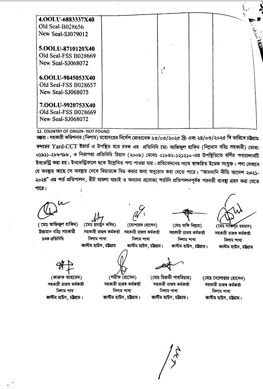 Terms & condition : আমদানি নীতি আদেশ এবং বিদ্যমান অন্যান্য আইন ও বিধি-বিধানের প্রযোজ্য সকল শর্ত পরিপালন এবং প্রযোজ্য ক্ষেত্রে রাসায়নিক পরীক্ষায় পণ্যের সঠিকতা ও ব্যবহার উপযোগিতা থাকা সাপেক্ষে খালাসকালে পণ্যের বর্ণনা এবং ওজন নিশ্চিত করে পণ্য ছাড়যোগ্য হবে। কোন লটভুক্ত পণ্যচালানে মেয়াদ উত্তীর্ণ/ধ্বসংযোগ্য পণ্য অন্তর্ভুক্ত থাকলে, উক্ত পণ্যচালানের ক্ষেত্রে মেয়াদ উত্তীর্ণ/ধ্বসংযোগ্য পণ্য ব্যতীত (প্রযোজ্য ক্ষেত্রে) কেবল মেয়াদযুক্ত/নিলামযোগ্য পণ্যসমূহ বিদ্যমান ও প্রযোজ্য আইন ও বিধি-বিধানের প্রযোজ্য সকল শর্ত পরিপালন সাপেক্ষে পণ্য ছাড়যোগ্য হবে। সার্ভার জটিলতা এড়ানোর জন্য আগ্রহী নিলাম ক্রেতাগণকে সরেজমিন পণ্য দেখে নিলামের নির্ধারিত শেষ তারিখ ও সময়ের পূর্বেই ই-নিলামে অংশগ্রহণ করার জন্য অনুরোধ করা যাচ্ছে। কোনরূপ কারণ দর্শানো ব্যতিরেকে কর্তৃপক্ষ যে কোন সময় ও পর্যায়ে যে কোন লট বা সকল লটের নিলাম আংশিক বা সম্পূর্ণ স্থগিত বা বাতিলের অধিকার সংরক্ষণ করেন।