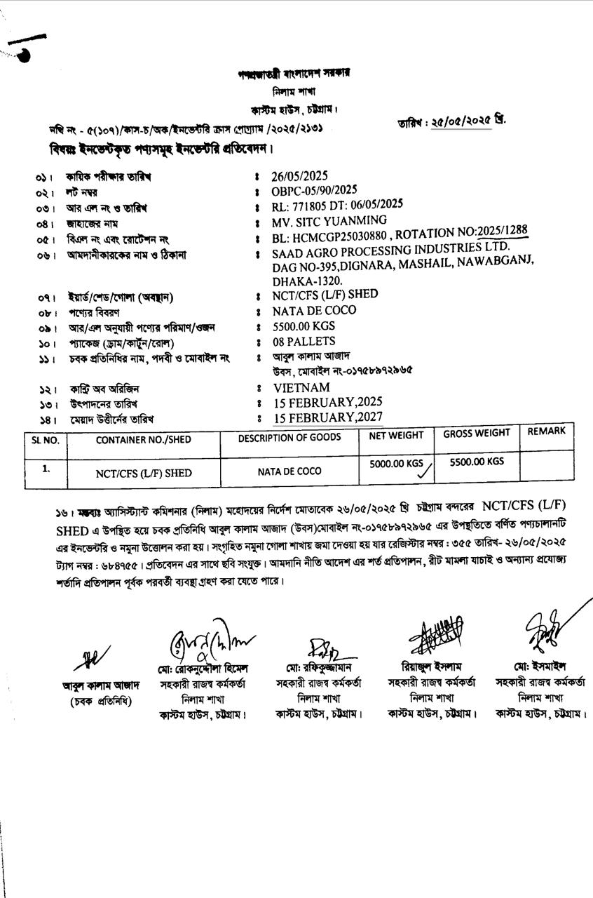 Terms & condition : আমদানি নীতি আদেশ এবং বিদ্যমান অন্যান্য আইন ও বিধি-বিধানের প্রযোজ্য সকল শর্ত পরিপালন এবং প্রযোজ্য ক্ষেত্রে রাসায়নিক পরীক্ষায় পণ্যের সঠিকতা ও ব্যবহার উপযোগিতা থাকা সাপেক্ষে খালাসকালে পণ্যের বর্ণনা এবং ওজন নিশ্চিত করে পণ্য ছাড়যোগ্য হবে। কোন লটভুক্ত পণ্যচালানে মেয়াদ উত্তীর্ণ/ধ্বসংযোগ্য পণ্য অন্তর্ভুক্ত থাকলে, উক্ত পণ্যচালানের ক্ষেত্রে মেয়াদ উত্তীর্ণ/ধ্বসংযোগ্য পণ্য ব্যতীত (প্রযোজ্য ক্ষেত্রে) কেবল মেয়াদযুক্ত/নিলামযোগ্য পণ্যসমূহ বিদ্যমান ও প্রযোজ্য আইন ও বিধি-বিধানের প্রযোজ্য সকল শর্ত পরিপালন সাপেক্ষে পণ্য ছাড়যোগ্য হবে। সার্ভার জটিলতা এড়ানোর জন্য আগ্রহী নিলাম ক্রেতাগণকে সরেজমিন পণ্য দেখে নিলামের নির্ধারিত শেষ তারিখ ও সময়ের পূর্বেই ই-নিলামে অংশগ্রহণ করার জন্য অনুরোধ করা যাচ্ছে। কোনরূপ কারণ দর্শানো ব্যতিরেকে কর্তৃপক্ষ যে কোন সময় ও পর্যায়ে যে কোন লট বা সকল লটের নিলাম আংশিক বা সম্পূর্ণ স্থগিত বা বাতিলের অধিকার সংরক্ষণ করেন।