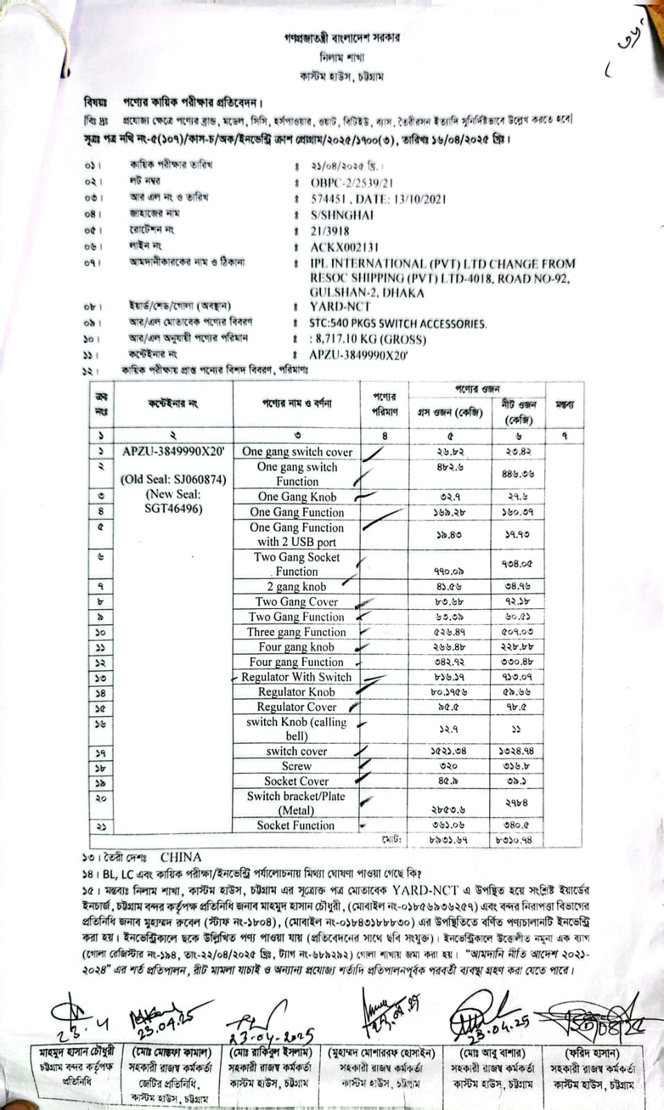 Terms & condition : আমদানি নীতি আদেশ এবং বিদ্যমান অন্যান্য আইন ও বিধি-বিধানের প্রযোজ্য সকল শর্ত পরিপালন এবং প্রযোজ্য ক্ষেত্রে রাসায়নিক পরীক্ষায় পণ্যের সঠিকতা ও ব্যবহার উপযোগিতা থাকা সাপেক্ষে পণ্য ছাড়যোগ্য হবে। যে সকল লটভুক্ত পণ্যচালানে মেয়াদ উত্তীর্ণ/ধ্বসংযোগ্য পণ্য অন্তর্ভুক্ত রয়েছে, সে সকল পণ্যচালানের ক্ষেত্রে মেয়াদ উত্তীর্ণ/ধ্বসংযোগ্য পণ্য ব্যতীত (প্রযোজ্য ক্ষেত্রে) কেবল মেয়াদযুক্ত/নিলামযোগ্য পণ্যসমূহ বিদ্যমান ও প্রযোজ্য সকল আইন ও বিধি-বিধানের প্রযোজ্য সকল শর্ত পরিপালন সাপেক্ষে পণ্য ছাড়যোগ্য হবে। সার্ভার জটিলতা এড়ানোর জন্য আগ্রহী নিলাম ক্রেতাগণকে সরেজমিন পণ্য দেখে নিলামের নির্ধারিত শেষ তারিখ ও সময়ের (৩০/০৯/২০২৫ খ্রি. তারিখ বিকাল ০৪.০০ টা) পূর্বেই বিশেষ ই-নিলামে অংশগ্রহণ করার জন্য অনুরোধ করা যাচ্ছে। কোনরূপ কারণ দর্শানো ব্যতিরেকে কর্তৃপক্ষ যে কোন সময় ও পর্যায়ে যে কোন লট বা সকল লটের নিলাম আংশিক বা সম্পূর্ণ স্থগিত বা বাতিল করার অধিকার সংরক্ষণ করেন।