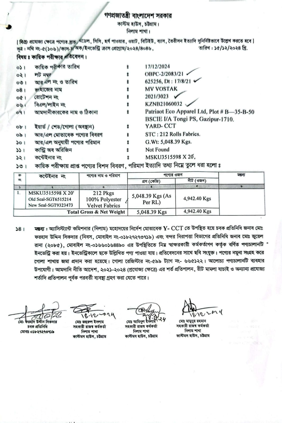 Terms & condition : আমদানি নীতি আদেশ এবং বিদ্যমান অন্যান্য আইন ও বিধি-বিধানের প্রযোজ্য সকল শর্ত পরিপালন এবং প্রযোজ্য ক্ষেত্রে রাসায়নিক পরীক্ষায় পণ্যের সঠিকতা ও ব্যবহার উপযোগিতা থাকা সাপেক্ষে পণ্য ছাড়যোগ্য হবে। যে সকল লটভুক্ত পণ্যচালানে মেয়াদ উত্তীর্ণ/ধ্বসংযোগ্য পণ্য অন্তর্ভুক্ত রয়েছে, সে সকল পণ্যচালানের ক্ষেত্রে মেয়াদ উত্তীর্ণ/ধ্বসংযোগ্য পণ্য ব্যতীত (প্রযোজ্য ক্ষেত্রে) কেবল মেয়াদযুক্ত/নিলামযোগ্য পণ্যসমূহ বিদ্যমান ও প্রযোজ্য সকল আইন ও বিধি-বিধানের প্রযোজ্য সকল শর্ত পরিপালন সাপেক্ষে পণ্য ছাড়যোগ্য হবে। সার্ভার জটিলতা এড়ানোর জন্য আগ্রহী নিলাম ক্রেতাগণকে সরেজমিন পণ্য দেখে নিলামের নির্ধারিত শেষ তারিখ ও সময়ের (৩০/০৯/২০২৫ খ্রি. তারিখ বিকাল ০৪.০০ টা) পূর্বেই বিশেষ ই-নিলামে অংশগ্রহণ করার জন্য অনুরোধ করা যাচ্ছে। কোনরূপ কারণ দর্শানো ব্যতিরেকে কর্তৃপক্ষ যে কোন সময় ও পর্যায়ে যে কোন লট বা সকল লটের নিলাম আংশিক বা সম্পূর্ণ স্থগিত বা বাতিল করার অধিকার সংরক্ষণ করেন।