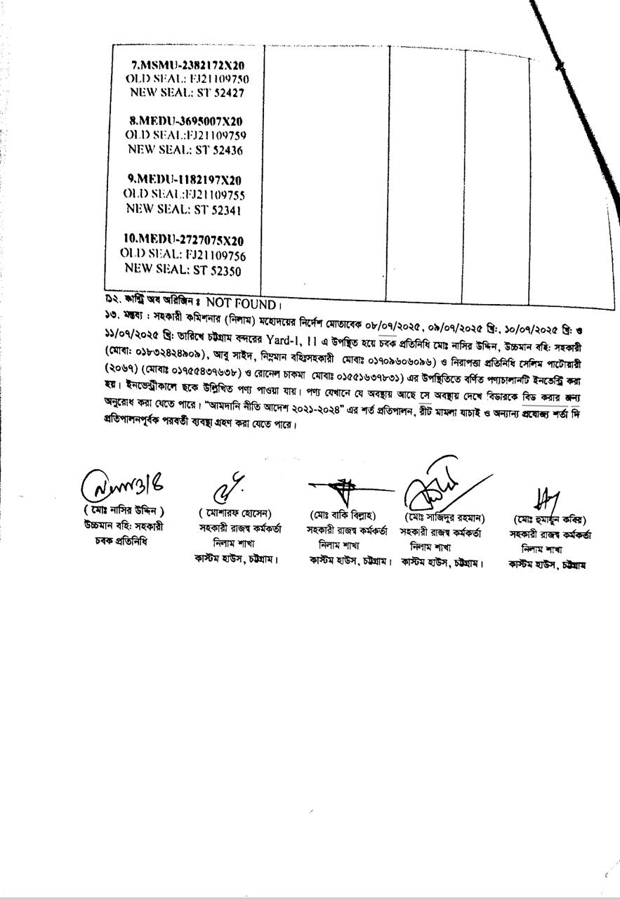 Terms & condition : আমদানি নীতি আদেশ এবং বিদ্যমান অন্যান্য আইন ও বিধি-বিধানের প্রযোজ্য সকল শর্ত পরিপালন এবং প্রযোজ্য ক্ষেত্রে রাসায়নিক পরীক্ষায় পণ্যের সঠিকতা ও ব্যবহার উপযোগিতা থাকা সাপেক্ষে খালাসকালে পণ্যের বর্ণনা এবং ওজন নিশ্চিত করে পণ্য ছাড়যোগ্য হবে। কোন লটভুক্ত পণ্যচালানে মেয়াদ উত্তীর্ণ/ধ্বসংযোগ্য পণ্য অন্তর্ভুক্ত থাকলে, উক্ত পণ্যচালানের ক্ষেত্রে মেয়াদ উত্তীর্ণ/ধ্বসংযোগ্য পণ্য ব্যতীত (প্রযোজ্য ক্ষেত্রে) কেবল মেয়াদযুক্ত/নিলামযোগ্য পণ্যসমূহ বিদ্যমান ও প্রযোজ্য আইন ও বিধি-বিধানের প্রযোজ্য সকল শর্ত পরিপালন সাপেক্ষে পণ্য ছাড়যোগ্য হবে। সার্ভার জটিলতা এড়ানোর জন্য আগ্রহী নিলাম ক্রেতাগণকে সরেজমিন পণ্য দেখে নিলামের নির্ধারিত শেষ তারিখ ও সময়ের পূর্বেই ই-নিলামে অংশগ্রহণ করার জন্য অনুরোধ করা যাচ্ছে। কোনরূপ কারণ দর্শানো ব্যতিরেকে কর্তৃপক্ষ যে কোন সময় ও পর্যায়ে যে কোন লট বা সকল লটের নিলাম আংশিক বা সম্পূর্ণ স্থগিত বা বাতিলের অধিকার সংরক্ষণ করেন।