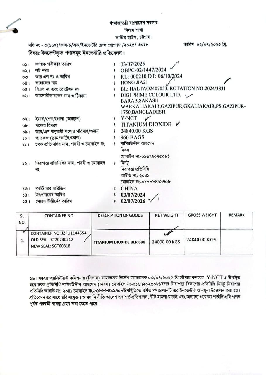 লটের শিরোনাম :Titanium Dioxide BLR 698(Previous Bid: 0 TK)