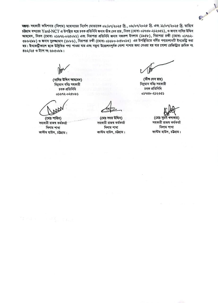 নিলামের পণ্য প্রদর্শনের তারিখ ০২/১১/২০২৫ থেকে ১৩/১১/২০২৫
