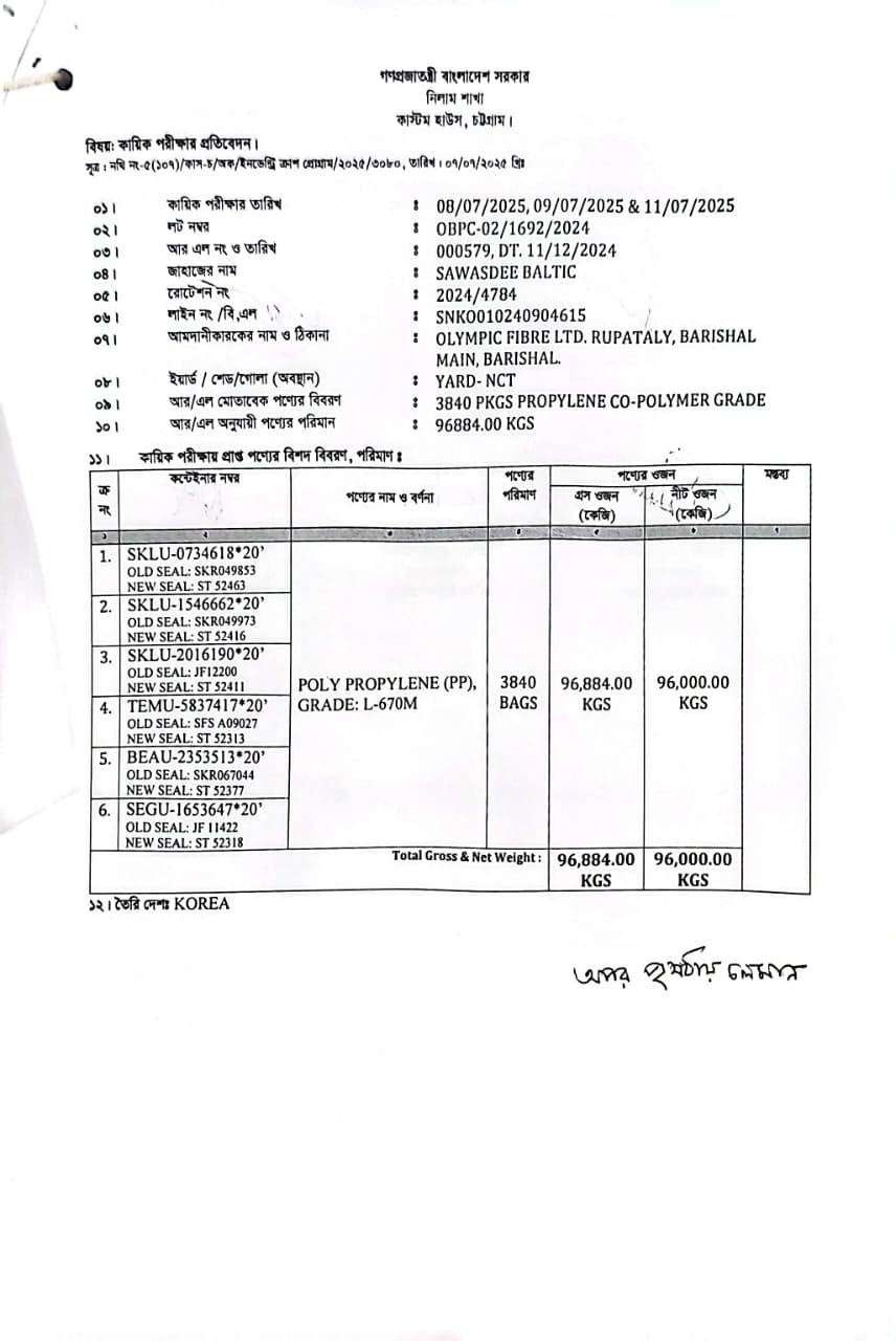 লটের শিরোনাম :Poly Propylene (PP) Grade: L-670M(Previous Bid: 0 TK)