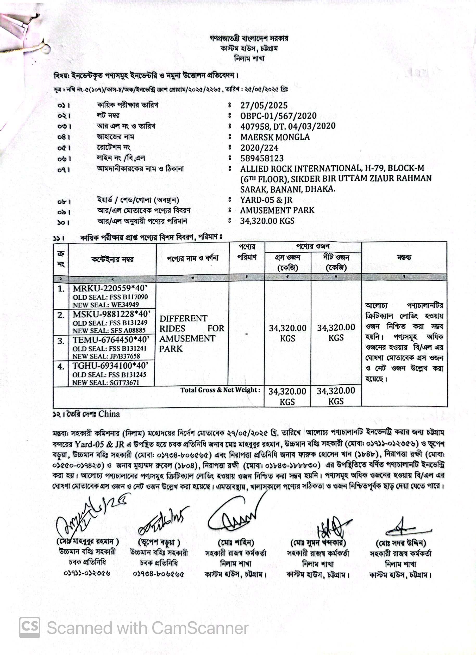 Terms & condition : আমদানি নীতি আদেশ এবং বিদ্যমান অন্যান্য আইন ও বিধি-বিধানের প্রযোজ্য সকল শর্ত পরিপালন এবং প্রযোজ্য ক্ষেত্রে রাসায়নিক পরীক্ষায় পণ্যের সঠিকতা ও ব্যবহার উপযোগিতা থাকা সাপেক্ষে খালাসকালে পণ্যের বর্ণনা এবং ওজন নিশ্চিত করে পণ্য ছাড়যোগ্য হবে। কোন লটভুক্ত পণ্যচালানে মেয়াদ উত্তীর্ণ/ধ্বসংযোগ্য পণ্য অন্তর্ভুক্ত থাকলে, উক্ত পণ্যচালানের ক্ষেত্রে মেয়াদ উত্তীর্ণ/ধ্বসংযোগ্য পণ্য ব্যতীত (প্রযোজ্য ক্ষেত্রে) কেবল মেয়াদযুক্ত/নিলামযোগ্য পণ্যসমূহ বিদ্যমান ও প্রযোজ্য আইন ও বিধি-বিধানের প্রযোজ্য সকল শর্ত পরিপালন সাপেক্ষে পণ্য ছাড়যোগ্য হবে। সার্ভার জটিলতা এড়ানোর জন্য আগ্রহী নিলাম ক্রেতাগণকে সরেজমিন পণ্য দেখে নিলামের নির্ধারিত শেষ তারিখ ও সময়ের (২৭/১১/২০২৫ খ্রি. তারিখ বিকাল ০৪.০০ টা) পূর্বেই বিশেষ ই-নিলামে অংশগ্রহণ করার জন্য অনুরোধ করা যাচ্ছে। কোনরূপ কারণ দর্শানো ব্যতিরেকে কর্তৃপক্ষ যে কোন সময় ও পর্যায়ে যে কোন লট বা সকল লটের নিলাম আংশিক বা সম্পূর্ণ স্থগিত বা বাতিলের অধিকার সংরক্ষণ করেন।