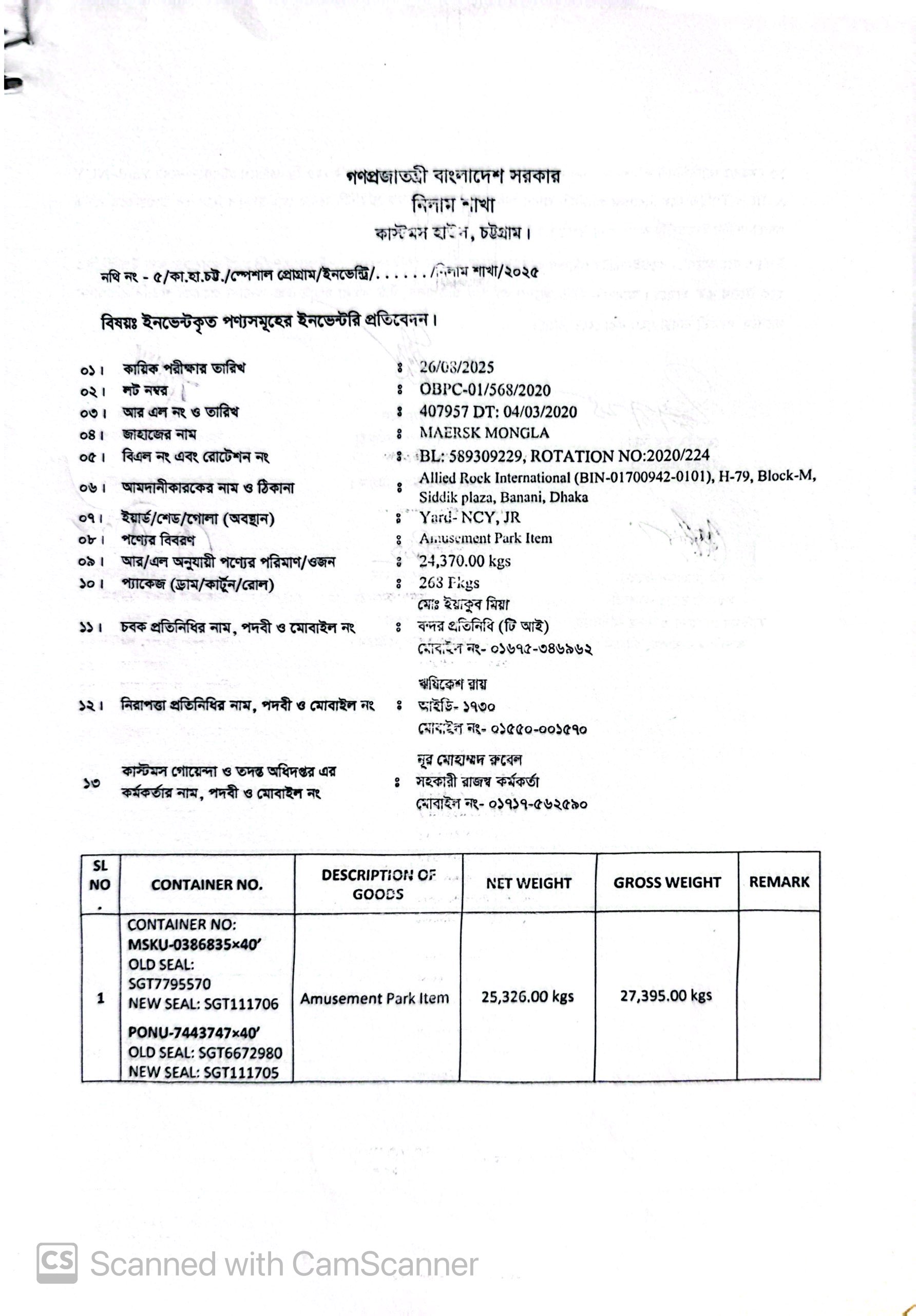 Terms & condition : আমদানি নীতি আদেশ এবং বিদ্যমান অন্যান্য আইন ও বিধি-বিধানের প্রযোজ্য সকল শর্ত পরিপালন এবং প্রযোজ্য ক্ষেত্রে রাসায়নিক পরীক্ষায় পণ্যের সঠিকতা ও ব্যবহার উপযোগিতা থাকা সাপেক্ষে খালাসকালে পণ্যের বর্ণনা এবং ওজন নিশ্চিত করে পণ্য ছাড়যোগ্য হবে। কোন লটভুক্ত পণ্যচালানে মেয়াদ উত্তীর্ণ/ধ্বসংযোগ্য পণ্য অন্তর্ভুক্ত থাকলে, উক্ত পণ্যচালানের ক্ষেত্রে মেয়াদ উত্তীর্ণ/ধ্বসংযোগ্য পণ্য ব্যতীত (প্রযোজ্য ক্ষেত্রে) কেবল মেয়াদযুক্ত/নিলামযোগ্য পণ্যসমূহ বিদ্যমান ও প্রযোজ্য আইন ও বিধি-বিধানের প্রযোজ্য সকল শর্ত পরিপালন সাপেক্ষে পণ্য ছাড়যোগ্য হবে। সার্ভার জটিলতা এড়ানোর জন্য আগ্রহী নিলাম ক্রেতাগণকে সরেজমিন পণ্য দেখে নিলামের নির্ধারিত শেষ তারিখ ও সময়ের (২৭/১১/২০২৫ খ্রি. তারিখ বিকাল ০৪.০০ টা) পূর্বেই বিশেষ ই-নিলামে অংশগ্রহণ করার জন্য অনুরোধ করা যাচ্ছে। কোনরূপ কারণ দর্শানো ব্যতিরেকে কর্তৃপক্ষ যে কোন সময় ও পর্যায়ে যে কোন লট বা সকল লটের নিলাম আংশিক বা সম্পূর্ণ স্থগিত বা বাতিলের অধিকার সংরক্ষণ করেন।