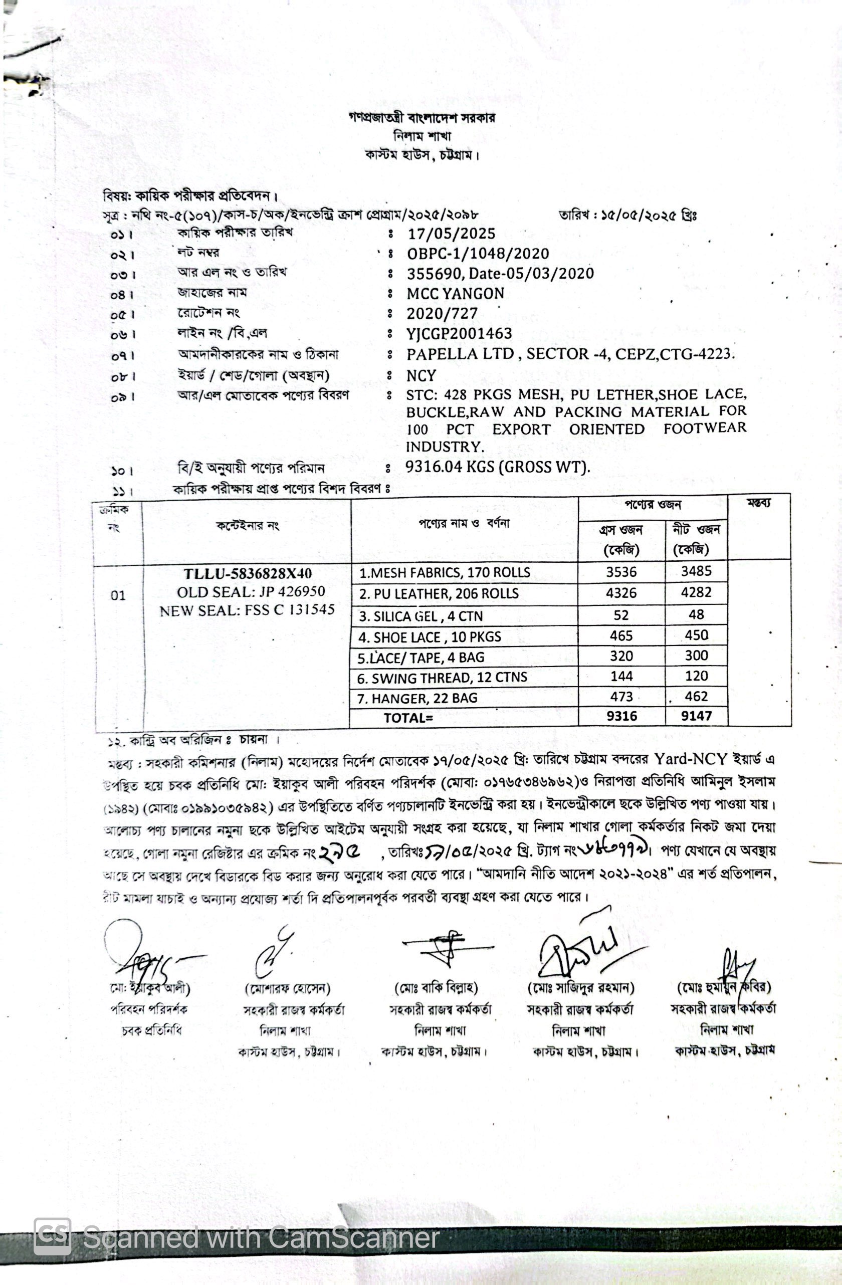 লটের শিরোনাম :(1) Mesh Fabrics, 170 Rolls, G. Wt: 3536 Kgs, N. Wt: 3485 Kgs; (2) PU Leather, 206 Rolls, G. Wt: 4326 Kgs N. Wt: 4282 Kgs; (3) Silica Gel, 4Ctn, G. Wt: 52 Kgs N. Wt: 48 Kgs; (4) Shoe Lace, 10 Pkgs, G.(Previous Bid: 0 TK)