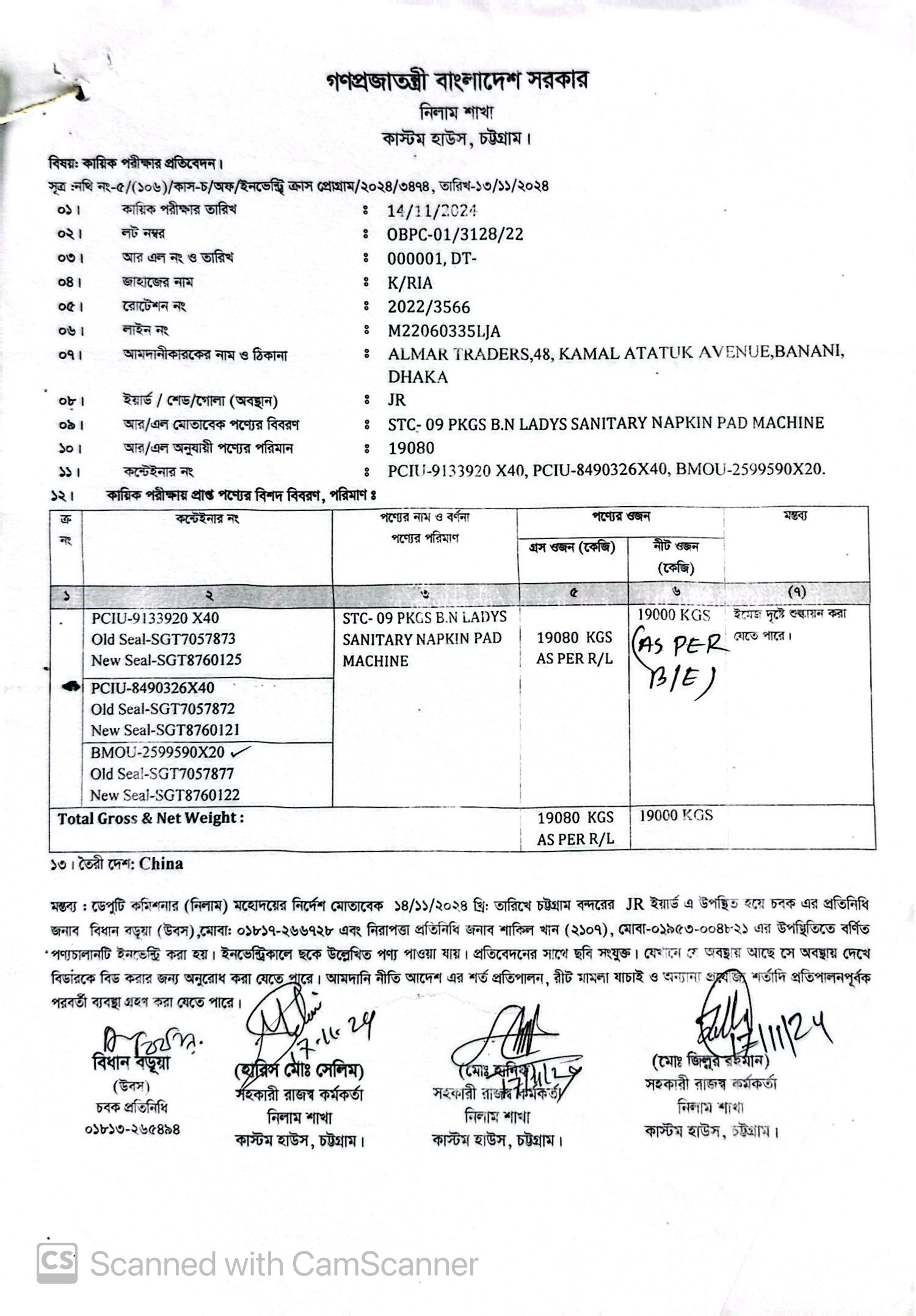 লটের শিরোনাম :09 Pkgs B.N Lady’s Sanitary Napkin Pad Machine(Previous Bid: 0 TK)