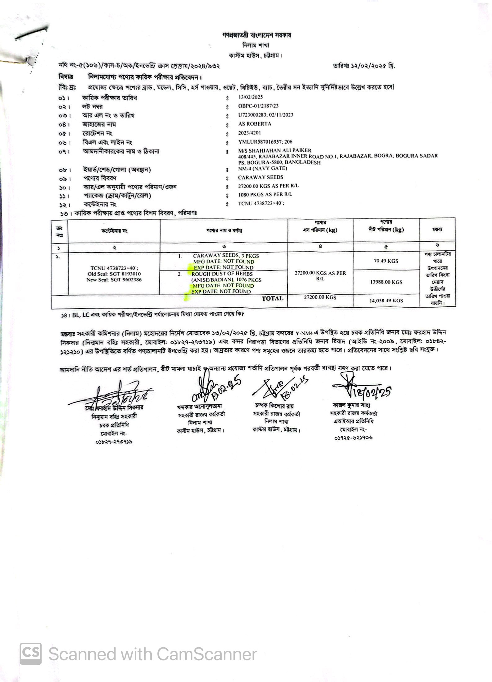 লটের শিরোনাম :(1) Caraway Seeds=70.49 Kgs, (2) Rough Dust of Herbs= 13,988 Kgs(Previous Bid: 0 TK)
