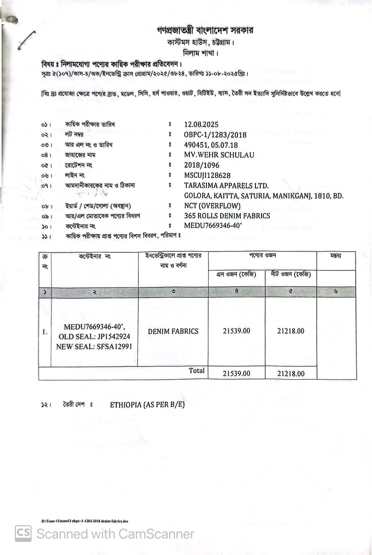 Terms & condition : আমদানি নীতি আদেশ এবং বিদ্যমান অন্যান্য আইন ও বিধি-বিধানের প্রযোজ্য সকল শর্ত পরিপালন এবং প্রযোজ্য ক্ষেত্রে রাসায়নিক পরীক্ষায় পণ্যের সঠিকতা ও ব্যবহার উপযোগিতা থাকা সাপেক্ষে খালাসকালে পণ্যের বর্ণনা এবং ওজন নিশ্চিত করে পণ্য ছাড়যোগ্য হবে। কোন লটভুক্ত পণ্যচালানে মেয়াদ উত্তীর্ণ/ধ্বসংযোগ্য পণ্য অন্তর্ভুক্ত থাকলে, উক্ত পণ্যচালানের ক্ষেত্রে মেয়াদ উত্তীর্ণ/ধ্বসংযোগ্য পণ্য ব্যতীত (প্রযোজ্য ক্ষেত্রে) কেবল মেয়াদযুক্ত/নিলামযোগ্য পণ্যসমূহ বিদ্যমান ও প্রযোজ্য আইন ও বিধি-বিধানের প্রযোজ্য সকল শর্ত পরিপালন সাপেক্ষে পণ্য ছাড়যোগ্য হবে। সার্ভার জটিলতা এড়ানোর জন্য আগ্রহী নিলাম ক্রেতাগণকে সরেজমিন পণ্য দেখে নিলামের নির্ধারিত শেষ তারিখ ও সময়ের (২৭/১১/২০২৫ খ্রি. তারিখ বিকাল ০৪.০০ টা) পূর্বেই বিশেষ ই-নিলামে অংশগ্রহণ করার জন্য অনুরোধ করা যাচ্ছে। কোনরূপ কারণ দর্শানো ব্যতিরেকে কর্তৃপক্ষ যে কোন সময় ও পর্যায়ে যে কোন লট বা সকল লটের নিলাম আংশিক বা সম্পূর্ণ স্থগিত বা বাতিলের অধিকার সংরক্ষণ করেন।