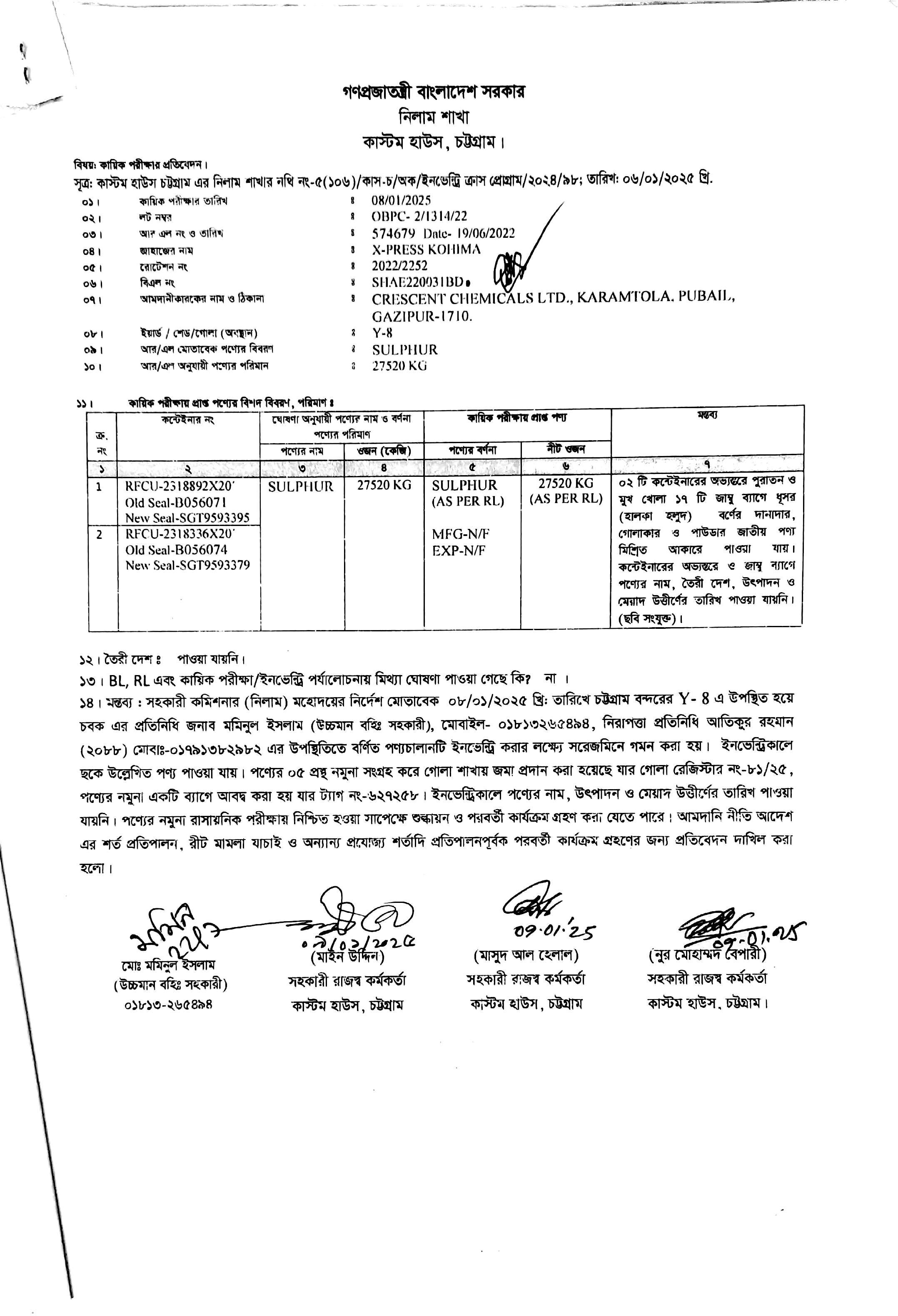 Terms & condition : আমদানি নীতি আদেশ এবং বিদ্যমান অন্যান্য আইন ও বিধি-বিধানের প্রযোজ্য সকল শর্ত পরিপালন এবং প্রযোজ্য ক্ষেত্রে রাসায়নিক পরীক্ষায় পণ্যের সঠিকতা ও ব্যবহার উপযোগিতা থাকা সাপেক্ষে খালাসকালে পণ্যের বর্ণনা এবং ওজন নিশ্চিত করে পণ্য ছাড়যোগ্য হবে। কোন লটভুক্ত পণ্যচালানে মেয়াদ উত্তীর্ণ/ধ্বসংযোগ্য পণ্য অন্তর্ভুক্ত থাকলে, উক্ত পণ্যচালানের ক্ষেত্রে মেয়াদ উত্তীর্ণ/ধ্বসংযোগ্য পণ্য ব্যতীত (প্রযোজ্য ক্ষেত্রে) কেবল মেয়াদযুক্ত/নিলামযোগ্য পণ্যসমূহ বিদ্যমান ও প্রযোজ্য আইন ও বিধি-বিধানের প্রযোজ্য সকল শর্ত পরিপালন সাপেক্ষে পণ্য ছাড়যোগ্য হবে। সার্ভার জটিলতা এড়ানোর জন্য আগ্রহী নিলাম ক্রেতাগণকে সরেজমিন পণ্য দেখে নিলামের নির্ধারিত শেষ তারিখ ও সময়ের (২৪/১২/২০২৫ খ্রি. তারিখ দুপুর ০২.০০ টা) পূর্বেই বিশেষ ই-নিলামে অংশগ্রহণ করার জন্য অনুরোধ করা যাচ্ছে। কোনরূপ কারণ দর্শানো ব্যতিরেকে কর্তৃপক্ষ যে কোন সময় ও পর্যায়ে যে কোন লট বা সকল লটের নিলাম আংশিক বা সম্পূর্ণ স্থগিত বা বাতিলের অধিকার সংরক্ষণ করেন।