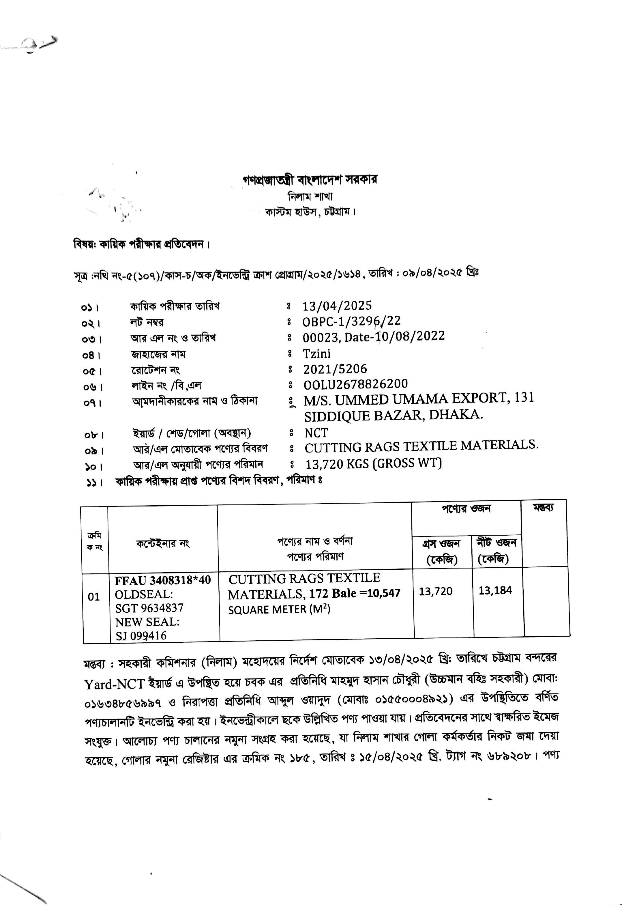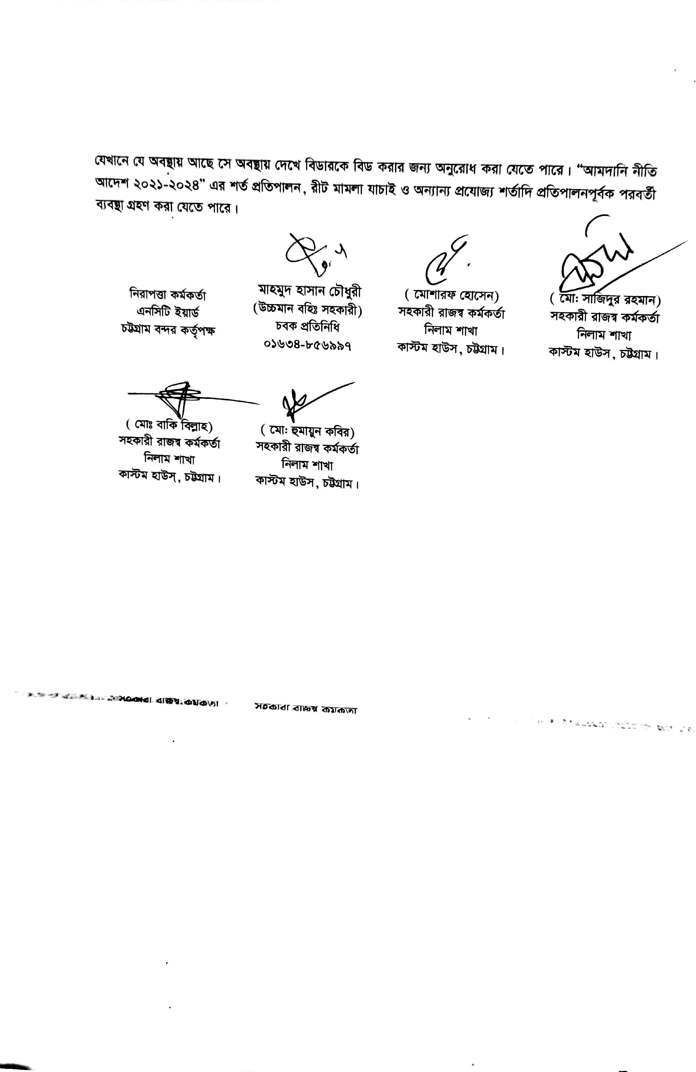 Terms & condition : আমদানি নীতি আদেশ এবং বিদ্যমান অন্যান্য আইন ও বিধি-বিধানের প্রযোজ্য সকল শর্ত পরিপালন এবং প্রযোজ্য ক্ষেত্রে রাসায়নিক পরীক্ষায় পণ্যের সঠিকতা ও ব্যবহার উপযোগিতা থাকা সাপেক্ষে খালাসকালে পণ্যের বর্ণনা এবং ওজন নিশ্চিত করে পণ্য ছাড়যোগ্য হবে। কোন লটভুক্ত পণ্যচালানে মেয়াদ উত্তীর্ণ/ধ্বসংযোগ্য পণ্য অন্তর্ভুক্ত থাকলে, উক্ত পণ্যচালানের ক্ষেত্রে মেয়াদ উত্তীর্ণ/ধ্বসংযোগ্য পণ্য ব্যতীত (প্রযোজ্য ক্ষেত্রে) কেবল মেয়াদযুক্ত/নিলামযোগ্য পণ্যসমূহ বিদ্যমান ও প্রযোজ্য আইন ও বিধি-বিধানের প্রযোজ্য সকল শর্ত পরিপালন সাপেক্ষে পণ্য ছাড়যোগ্য হবে। সার্ভার জটিলতা এড়ানোর জন্য আগ্রহী নিলাম ক্রেতাগণকে সরেজমিন পণ্য দেখে নিলামের নির্ধারিত শেষ তারিখ ও সময়ের (২৪/১২/২০২৫ খ্রি. তারিখ দুপুর ০২.০০ টা) পূর্বেই বিশেষ ই-নিলামে অংশগ্রহণ করার জন্য অনুরোধ করা যাচ্ছে। কোনরূপ কারণ দর্শানো ব্যতিরেকে কর্তৃপক্ষ যে কোন সময় ও পর্যায়ে যে কোন লট বা সকল লটের নিলাম আংশিক বা সম্পূর্ণ স্থগিত বা বাতিলের অধিকার সংরক্ষণ করেন।