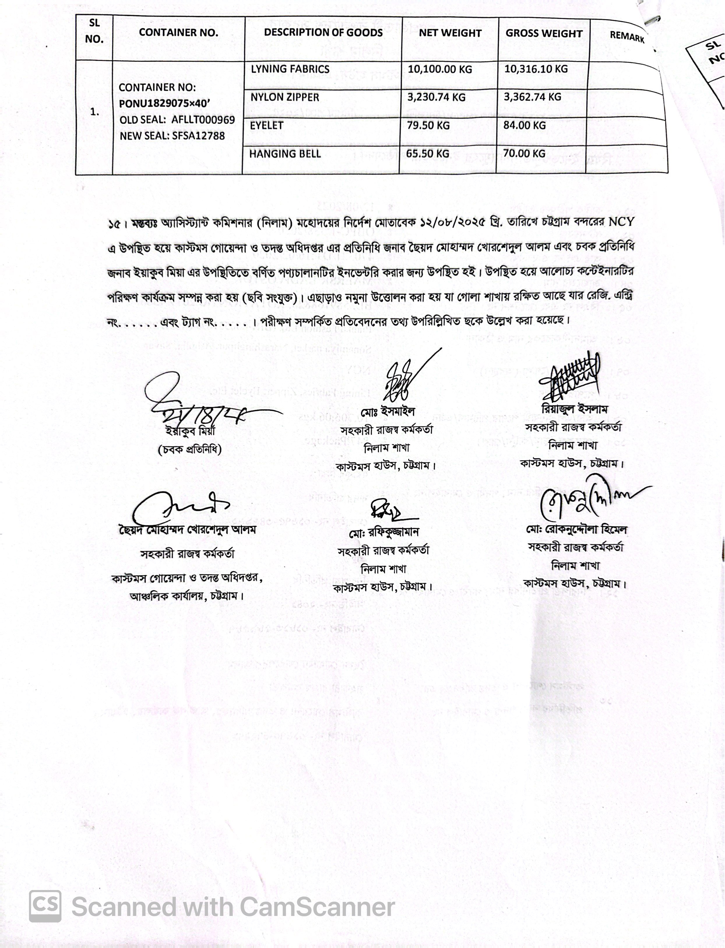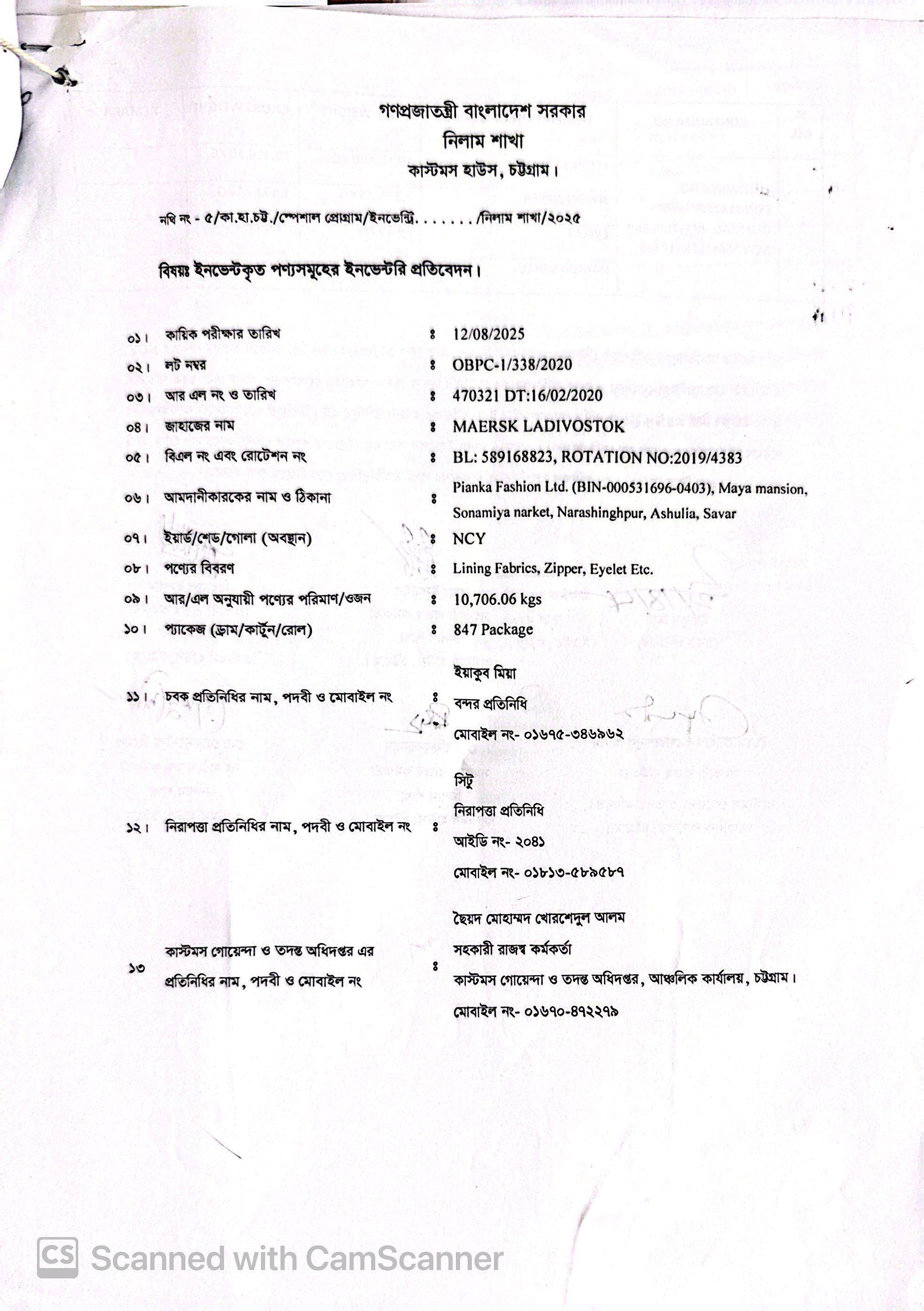 Terms & condition : আমদানি নীতি আদেশ এবং বিদ্যমান অন্যান্য আইন ও বিধি-বিধানের প্রযোজ্য সকল শর্ত পরিপালন এবং প্রযোজ্য ক্ষেত্রে রাসায়নিক পরীক্ষায় পণ্যের সঠিকতা ও ব্যবহার উপযোগিতা থাকা সাপেক্ষে খালাসকালে পণ্যের বর্ণনা এবং ওজন নিশ্চিত করে পণ্য ছাড়যোগ্য হবে। কোন লটভুক্ত পণ্যচালানে মেয়াদ উত্তীর্ণ/ধ্বসংযোগ্য পণ্য অন্তর্ভুক্ত থাকলে, উক্ত পণ্যচালানের ক্ষেত্রে মেয়াদ উত্তীর্ণ/ধ্বসংযোগ্য পণ্য ব্যতীত (প্রযোজ্য ক্ষেত্রে) কেবল মেয়াদযুক্ত/নিলামযোগ্য পণ্যসমূহ বিদ্যমান ও প্রযোজ্য আইন ও বিধি-বিধানের প্রযোজ্য সকল শর্ত পরিপালন সাপেক্ষে পণ্য ছাড়যোগ্য হবে। সার্ভার জটিলতা এড়ানোর জন্য আগ্রহী নিলাম ক্রেতাগণকে সরেজমিন পণ্য দেখে নিলামের নির্ধারিত শেষ তারিখ ও সময়ের (২৪/১২/২০২৫ খ্রি. তারিখ দুপুর ০২.০০ টা) পূর্বেই বিশেষ ই-নিলামে অংশগ্রহণ করার জন্য অনুরোধ করা যাচ্ছে। কোনরূপ কারণ দর্শানো ব্যতিরেকে কর্তৃপক্ষ যে কোন সময় ও পর্যায়ে যে কোন লট বা সকল লটের নিলাম আংশিক বা সম্পূর্ণ স্থগিত বা বাতিলের অধিকার সংরক্ষণ করেন।