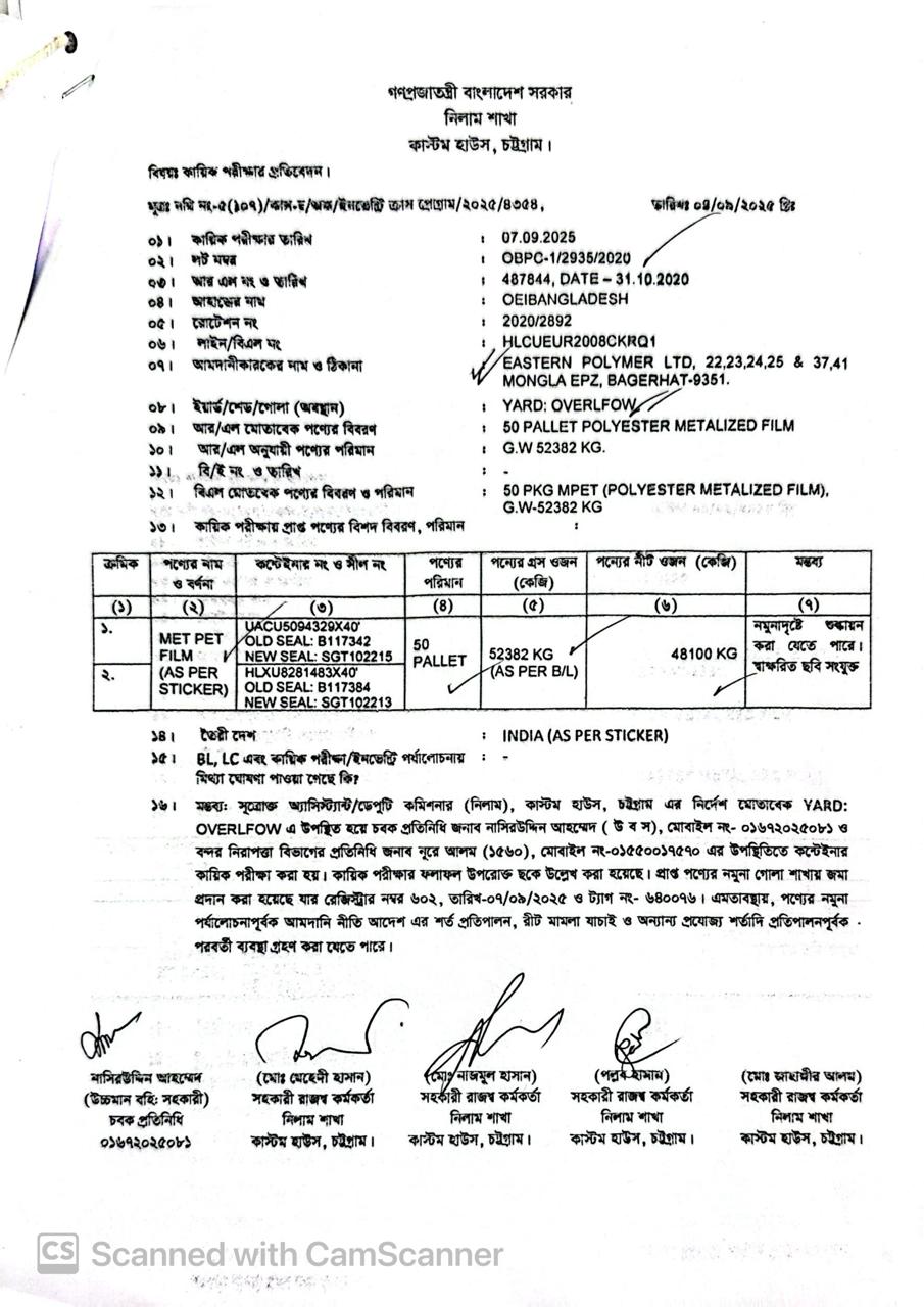 লটের শিরোনাম :MPET Film (As per sticker)(Previous Bid: 0 TK)