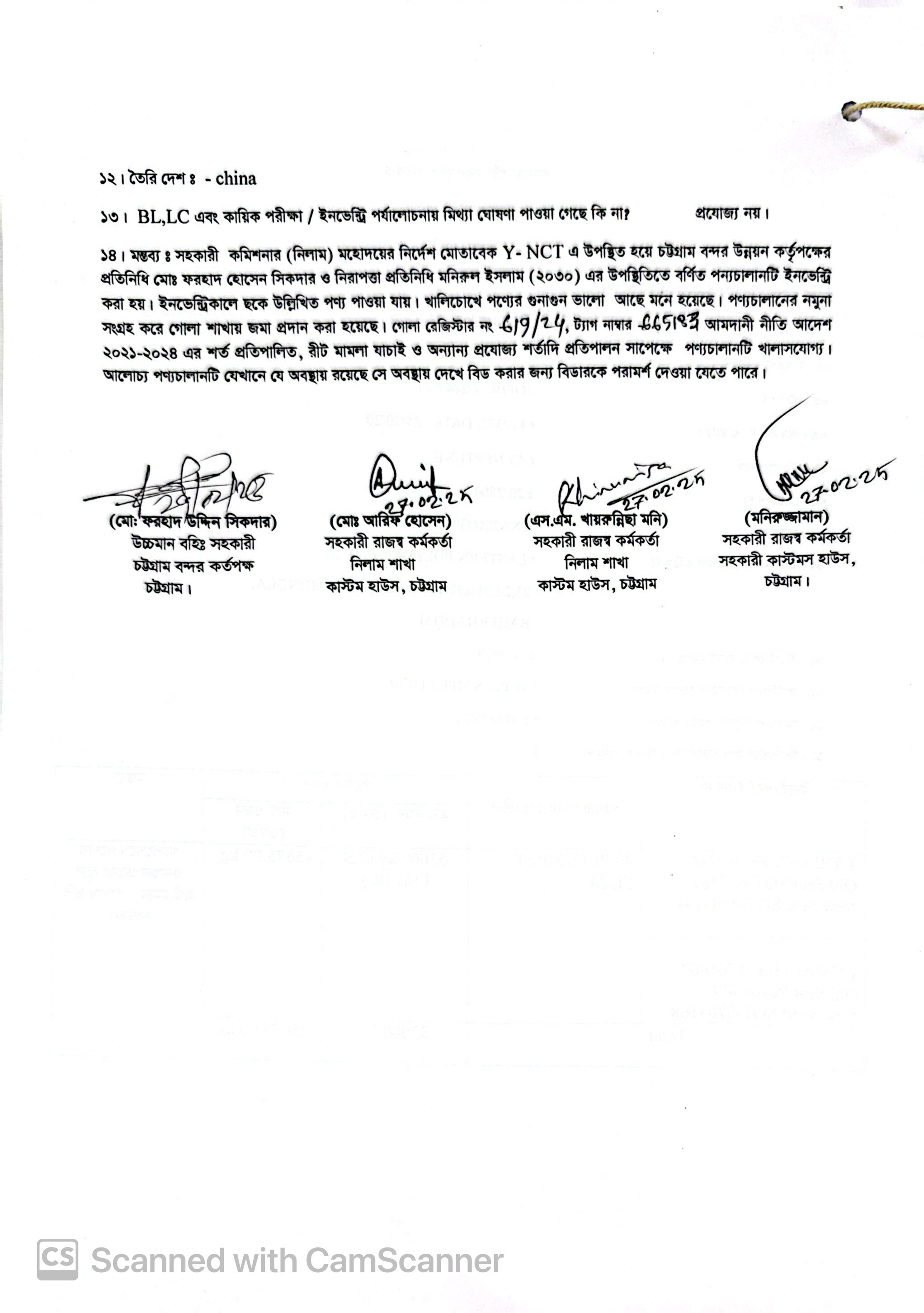 Terms & condition : আমদানি নীতি আদেশ এবং বিদ্যমান অন্যান্য আইন ও বিধি-বিধানের প্রযোজ্য সকল শর্ত পরিপালন এবং প্রযোজ্য ক্ষেত্রে রাসায়নিক পরীক্ষায় পণ্যের সঠিকতা ও ব্যবহার উপযোগিতা থাকা সাপেক্ষে খালাসকালে পণ্যের বর্ণনা এবং ওজন নিশ্চিত করে পণ্য ছাড়যোগ্য হবে। কোন লটভুক্ত পণ্যচালানে মেয়াদ উত্তীর্ণ/ধ্বসংযোগ্য পণ্য অন্তর্ভুক্ত থাকলে, উক্ত পণ্যচালানের ক্ষেত্রে মেয়াদ উত্তীর্ণ/ধ্বসংযোগ্য পণ্য ব্যতীত (প্রযোজ্য ক্ষেত্রে) কেবল মেয়াদযুক্ত/নিলামযোগ্য পণ্যসমূহ বিদ্যমান ও প্রযোজ্য আইন ও বিধি-বিধানের প্রযোজ্য সকল শর্ত পরিপালন সাপেক্ষে পণ্য ছাড়যোগ্য হবে। সার্ভার জটিলতা এড়ানোর জন্য আগ্রহী নিলাম ক্রেতাগণকে সরেজমিন পণ্য দেখে নিলামের নির্ধারিত শেষ তারিখ ও সময়ের (২৪/১২/২০২৫ খ্রি. তারিখ দুপুর ০২.০০ টা) পূর্বেই বিশেষ ই-নিলামে অংশগ্রহণ করার জন্য অনুরোধ করা যাচ্ছে। কোনরূপ কারণ দর্শানো ব্যতিরেকে কর্তৃপক্ষ যে কোন সময় ও পর্যায়ে যে কোন লট বা সকল লটের নিলাম আংশিক বা সম্পূর্ণ স্থগিত বা বাতিলের অধিকার সংরক্ষণ করেন।