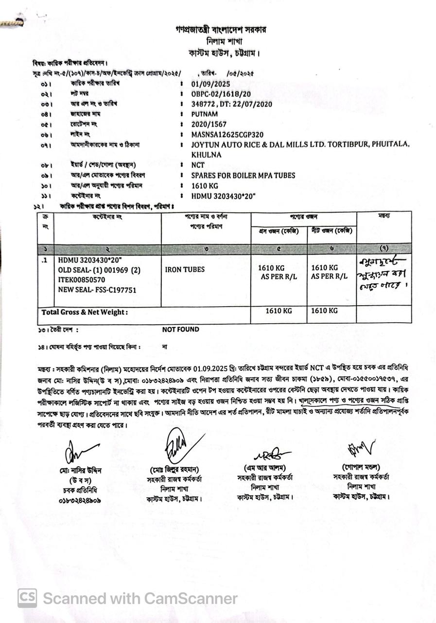 Terms & condition : আমদানি নীতি আদেশ এবং বিদ্যমান অন্যান্য আইন ও বিধি-বিধানের প্রযোজ্য সকল শর্ত পরিপালন এবং প্রযোজ্য ক্ষেত্রে রাসায়নিক পরীক্ষায় পণ্যের সঠিকতা ও ব্যবহার উপযোগিতা থাকা সাপেক্ষে খালাসকালে পণ্যের বর্ণনা এবং ওজন নিশ্চিত করে পণ্য ছাড়যোগ্য হবে। কোন লটভুক্ত পণ্যচালানে মেয়াদ উত্তীর্ণ/ধ্বসংযোগ্য পণ্য অন্তর্ভুক্ত থাকলে, উক্ত পণ্যচালানের ক্ষেত্রে মেয়াদ উত্তীর্ণ/ধ্বসংযোগ্য পণ্য ব্যতীত (প্রযোজ্য ক্ষেত্রে) কেবল মেয়াদযুক্ত/নিলামযোগ্য পণ্যসমূহ বিদ্যমান ও প্রযোজ্য আইন ও বিধি-বিধানের প্রযোজ্য সকল শর্ত পরিপালন সাপেক্ষে পণ্য ছাড়যোগ্য হবে। সার্ভার জটিলতা এড়ানোর জন্য আগ্রহী নিলাম ক্রেতাগণকে সরেজমিন পণ্য দেখে নিলামের নির্ধারিত শেষ তারিখ ও সময়ের (২৪/১২/২০২৫ খ্রি. তারিখ দুপুর ০২.০০ টা) পূর্বেই বিশেষ ই-নিলামে অংশগ্রহণ করার জন্য অনুরোধ করা যাচ্ছে। কোনরূপ কারণ দর্শানো ব্যতিরেকে কর্তৃপক্ষ যে কোন সময় ও পর্যায়ে যে কোন লট বা সকল লটের নিলাম আংশিক বা সম্পূর্ণ স্থগিত বা বাতিলের অধিকার সংরক্ষণ করেন।