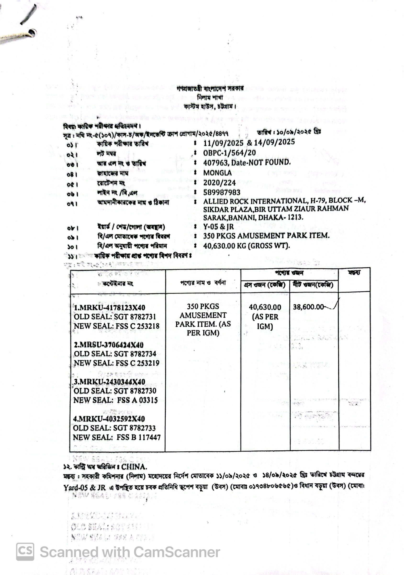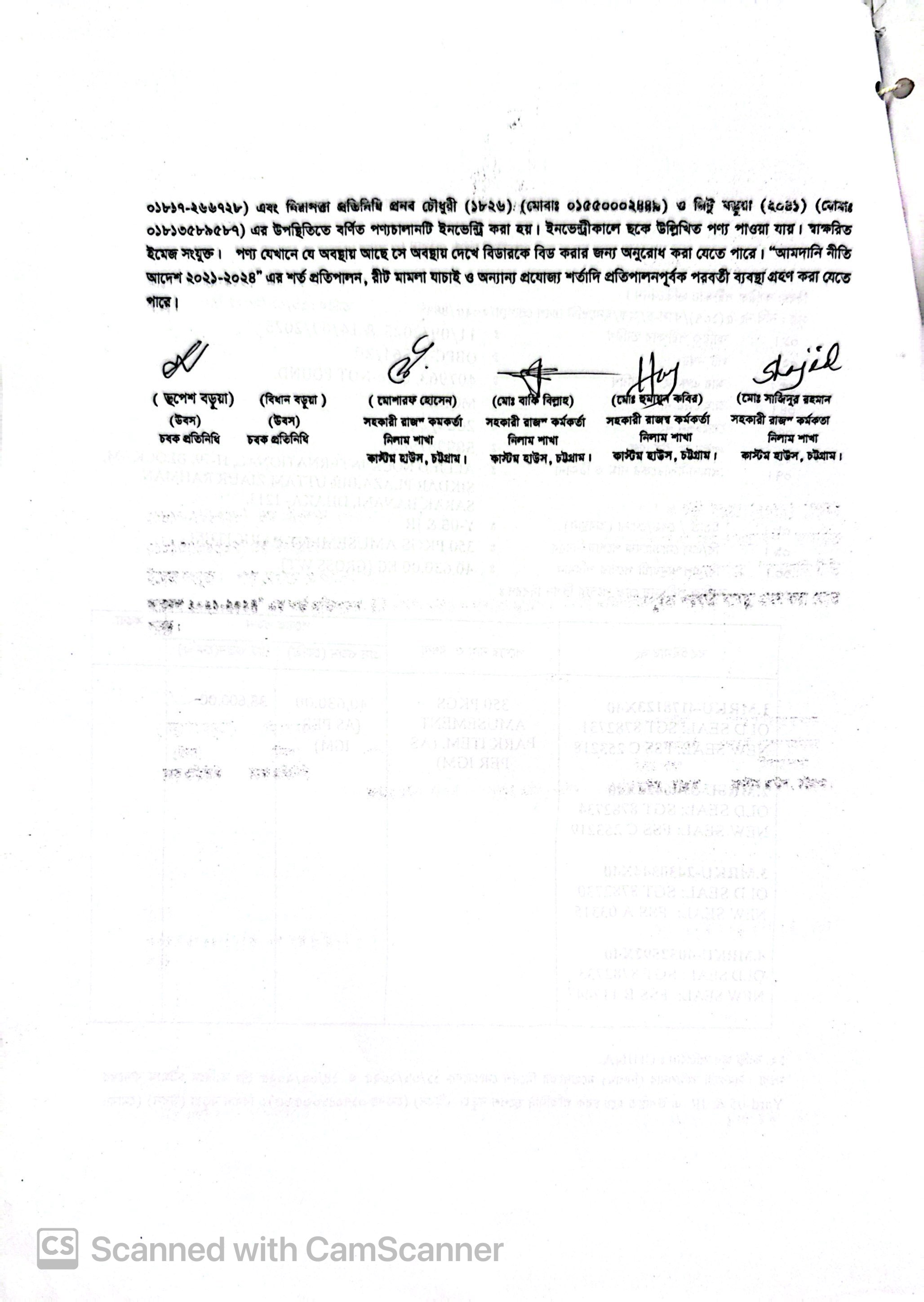 Terms & condition : আমদানি নীতি আদেশ এবং বিদ্যমান অন্যান্য আইন ও বিধি-বিধানের প্রযোজ্য সকল শর্ত পরিপালন এবং প্রযোজ্য ক্ষেত্রে রাসায়নিক পরীক্ষায় পণ্যের সঠিকতা ও ব্যবহার উপযোগিতা থাকা সাপেক্ষে খালাসকালে পণ্যের বর্ণনা এবং ওজন নিশ্চিত করে পণ্য ছাড়যোগ্য হবে। কোন লটভুক্ত পণ্যচালানে মেয়াদ উত্তীর্ণ/ধ্বসংযোগ্য পণ্য অন্তর্ভুক্ত থাকলে, উক্ত পণ্যচালানের ক্ষেত্রে মেয়াদ উত্তীর্ণ/ধ্বসংযোগ্য পণ্য ব্যতীত (প্রযোজ্য ক্ষেত্রে) কেবল মেয়াদযুক্ত/নিলামযোগ্য পণ্যসমূহ বিদ্যমান ও প্রযোজ্য আইন ও বিধি-বিধানের প্রযোজ্য সকল শর্ত পরিপালন সাপেক্ষে পণ্য ছাড়যোগ্য হবে। সার্ভার জটিলতা এড়ানোর জন্য আগ্রহী নিলাম ক্রেতাগণকে সরেজমিন পণ্য দেখে নিলামের নির্ধারিত শেষ তারিখ ও সময়ের (২৪/১২/২০২৫ খ্রি. তারিখ দুপুর ০২.০০ টা) পূর্বেই বিশেষ ই-নিলামে অংশগ্রহণ করার জন্য অনুরোধ করা যাচ্ছে। কোনরূপ কারণ দর্শানো ব্যতিরেকে কর্তৃপক্ষ যে কোন সময় ও পর্যায়ে যে কোন লট বা সকল লটের নিলাম আংশিক বা সম্পূর্ণ স্থগিত বা বাতিলের অধিকার সংরক্ষণ করেন।