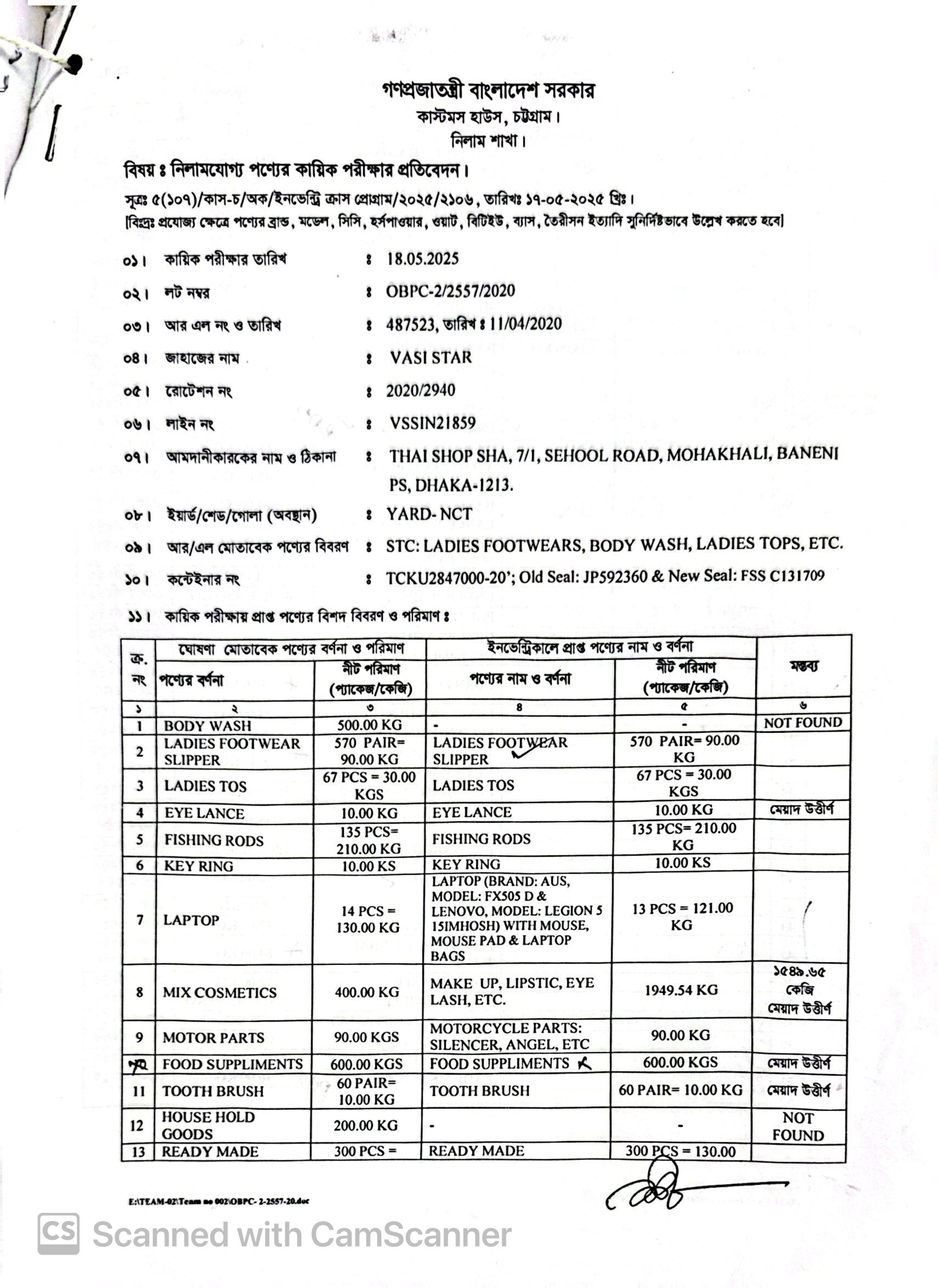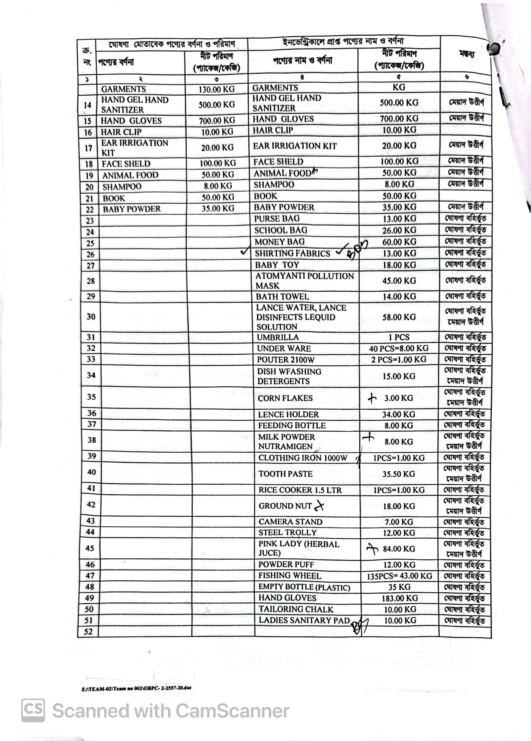 Auctionable: (2) Ladies Footwear Slipper 570 Pair= 90 Kgs; (3) Ladies Tos 67 Pcs= 30 Kgs; (5) Fishing Rods 135 Pcs= 210 Kgs; (6) Key Ring= 10 Kgs; (7) Laptop (Brand ASUS, Model: FX505D & Lenovo, Model: LEGION 5 15IMHOSH With Mouse, Mouse Pad & Laptop Bags 13 Pcs= 121 Kgs; (8) Make UP, Lipstick, Eye Lash, Etc.= 399.89 Kgs; (9) Motor Cycle Parts: Silencer, Angel etc.= 90 Kgs; (13) Ready Made Garments 300 Pcs= 130 Kgs; (16) Hair Clip= 10 Kgs; (21) Book= 50 Kgs; (23) Purse Bag= 13 Kgs: (24) School Bag= 26 Kgs; (25) Money Bag=60 Kgs; (26) Shirting Fabrics= 13 Kgs; (27) Baby Toy= 18 Kgs; (28) Atomyanti Pollution Mask= 45 Kgs; (29) Bath Towel= 14 Kgs; (31) Umbrella 1 Pcs; (32) Under Ware 40 Pcs=8 Kgs; (33) Router 2100w 2 Pcs= 1 Kg; (36) Lence Holder= 34 Kgs; (37) Feeding Bottle= 8 Kgs; (39) Clothing Iron 1000w 1 Pcs= 1 Kg; (41) Rice Cooker 1.5 Ltr 1 Pcs = 1 Kgs; (43) Camera Stand= 7 Kgs; (44) Steel Trolly= 12 Kgs; (46) Powder Puff= 12 Kgs; (47) Fishing Wheel 135 Pcs= 43 Kgs; (48) Empty Bottle (Plastic)= 35 Kgs; (49) Hand Gloves= 183 Kgs; (50) Tailoring Chalk= 10 Kgs; (51) Ladies Sanitary Pad= 10 Kgs, Total= 1,696 Kgs. Destroyable: (4) Eye Lance= 10 Kgs; (8) Make UP, Lipstick, Eye Lash, Etc.= 1549.65 Kgs; (10) Food Supplements= 600 Kgs; (11) Tooth Brush 60 Pair= 10 Kgs; (14) Hand Gel Hand Sanitizer= 500 Kgs; (15) Hand Gloves= 700 Kgs; (17) Ear Irrigation Kit= 20 Kgs; (18) Face Sheld= 100 Kgs; (19) Animal Food= 50 Kgs; (20) Shampoo= 8 Kgs; (22) Baby Powder= 35 Kgs; (30) Lance Water, Lance Disinfects Liquid Solution= 58 Kgs; (34) Dish Washing Detergents= 15 Kgs; (35) Corn Flakes= 3 Kgs; (38) Milk Powder Nutramigen= 8 Kgs; (40) Tooth Paste= 35.50 Kgs; (42) Ground Nut= 18 Kgs; (45) Pink Lady (Herbal Juice)= 84 Kgs, Total= 3,804 Kgs (5,500 Kgs পণ্যের মধ্যে 1,696 Kgs নিলামযোগ্য অবশিষ্ট 3,804 Kgs পণ্য মেয়াদ উত্তীর্ণ বিধায় ধ্বংসযোগ্য) |