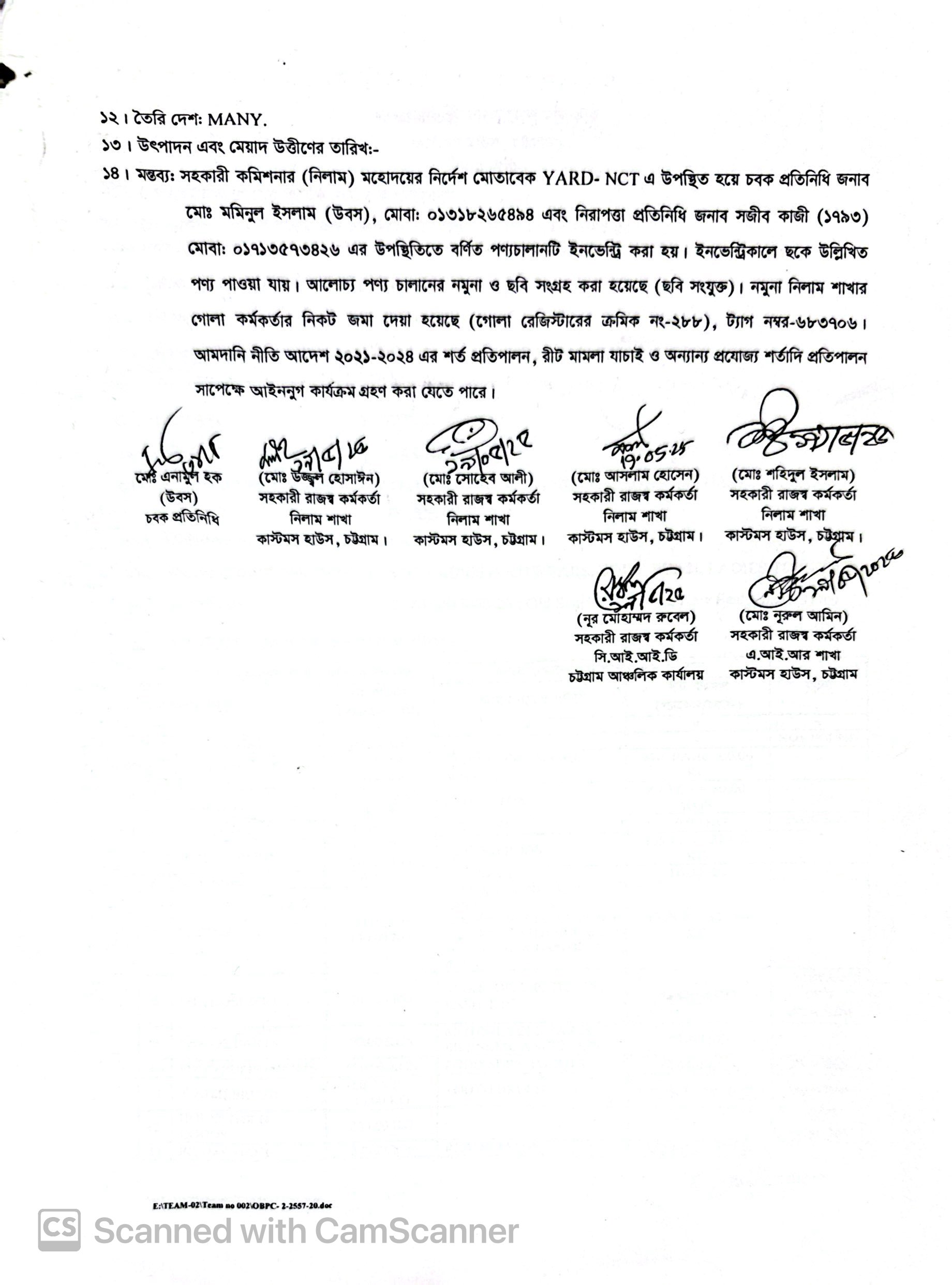 Terms & condition : আমদানি নীতি আদেশ এবং বিদ্যমান অন্যান্য আইন ও বিধি-বিধানের প্রযোজ্য সকল শর্ত পরিপালন এবং প্রযোজ্য ক্ষেত্রে রাসায়নিক পরীক্ষায় পণ্যের সঠিকতা ও ব্যবহার উপযোগিতা থাকা সাপেক্ষে খালাসকালে পণ্যের বর্ণনা এবং ওজন নিশ্চিত করে পণ্য ছাড়যোগ্য হবে। কোন লটভুক্ত পণ্যচালানে মেয়াদ উত্তীর্ণ/ধ্বসংযোগ্য পণ্য অন্তর্ভুক্ত থাকলে, উক্ত পণ্যচালানের ক্ষেত্রে মেয়াদ উত্তীর্ণ/ধ্বসংযোগ্য পণ্য ব্যতীত (প্রযোজ্য ক্ষেত্রে) কেবল মেয়াদযুক্ত/নিলামযোগ্য পণ্যসমূহ বিদ্যমান ও প্রযোজ্য আইন ও বিধি-বিধানের প্রযোজ্য সকল শর্ত পরিপালন সাপেক্ষে পণ্য ছাড়যোগ্য হবে। সার্ভার জটিলতা এড়ানোর জন্য আগ্রহী নিলাম ক্রেতাগণকে সরেজমিন পণ্য দেখে নিলামের নির্ধারিত শেষ তারিখ ও সময়ের (২৪/১২/২০২৫ খ্রি. তারিখ দুপুর ০২.০০ টা) পূর্বেই বিশেষ ই-নিলামে অংশগ্রহণ করার জন্য অনুরোধ করা যাচ্ছে। কোনরূপ কারণ দর্শানো ব্যতিরেকে কর্তৃপক্ষ যে কোন সময় ও পর্যায়ে যে কোন লট বা সকল লটের নিলাম আংশিক বা সম্পূর্ণ স্থগিত বা বাতিলের অধিকার সংরক্ষণ করেন।