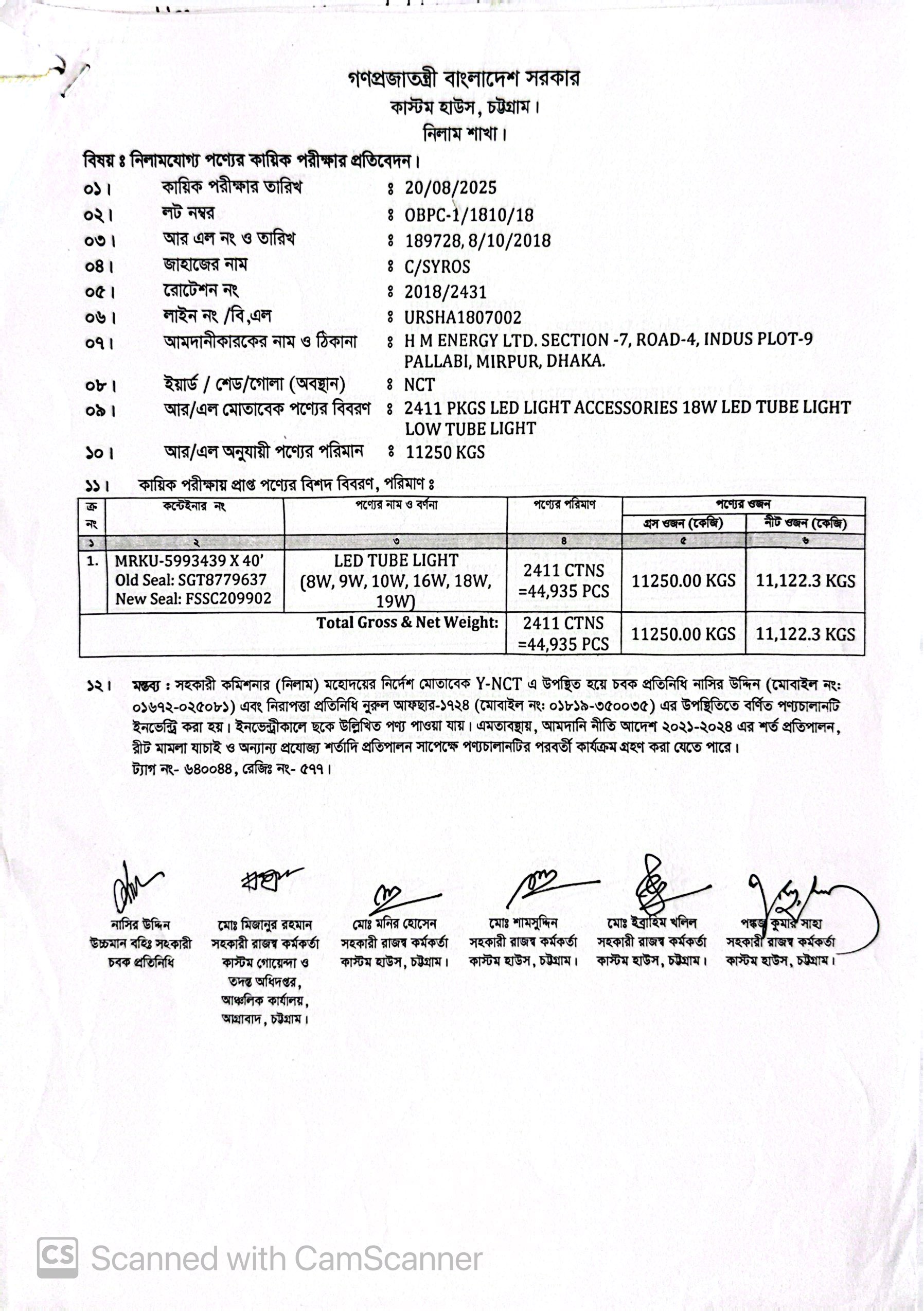 Terms & condition : আমদানি নীতি আদেশ এবং বিদ্যমান অন্যান্য আইন ও বিধি-বিধানের প্রযোজ্য সকল শর্ত পরিপালন এবং প্রযোজ্য ক্ষেত্রে রাসায়নিক পরীক্ষায় পণ্যের সঠিকতা ও ব্যবহার উপযোগিতা থাকা সাপেক্ষে খালাসকালে পণ্যের বর্ণনা এবং ওজন নিশ্চিত করে পণ্য ছাড়যোগ্য হবে। কোন লটভুক্ত পণ্যচালানে মেয়াদ উত্তীর্ণ/ধ্বসংযোগ্য পণ্য অন্তর্ভুক্ত থাকলে, উক্ত পণ্যচালানের ক্ষেত্রে মেয়াদ উত্তীর্ণ/ধ্বসংযোগ্য পণ্য ব্যতীত (প্রযোজ্য ক্ষেত্রে) কেবল মেয়াদযুক্ত/নিলামযোগ্য পণ্যসমূহ বিদ্যমান ও প্রযোজ্য আইন ও বিধি-বিধানের প্রযোজ্য সকল শর্ত পরিপালন সাপেক্ষে পণ্য ছাড়যোগ্য হবে। সার্ভার জটিলতা এড়ানোর জন্য আগ্রহী নিলাম ক্রেতাগণকে সরেজমিন পণ্য দেখে নিলামের নির্ধারিত শেষ তারিখ ও সময়ের (২৪/১২/২০২৫ খ্রি. তারিখ দুপুর ০২.০০ টা) পূর্বেই বিশেষ ই-নিলামে অংশগ্রহণ করার জন্য অনুরোধ করা যাচ্ছে। কোনরূপ কারণ দর্শানো ব্যতিরেকে কর্তৃপক্ষ যে কোন সময় ও পর্যায়ে যে কোন লট বা সকল লটের নিলাম আংশিক বা সম্পূর্ণ স্থগিত বা বাতিলের অধিকার সংরক্ষণ করেন।