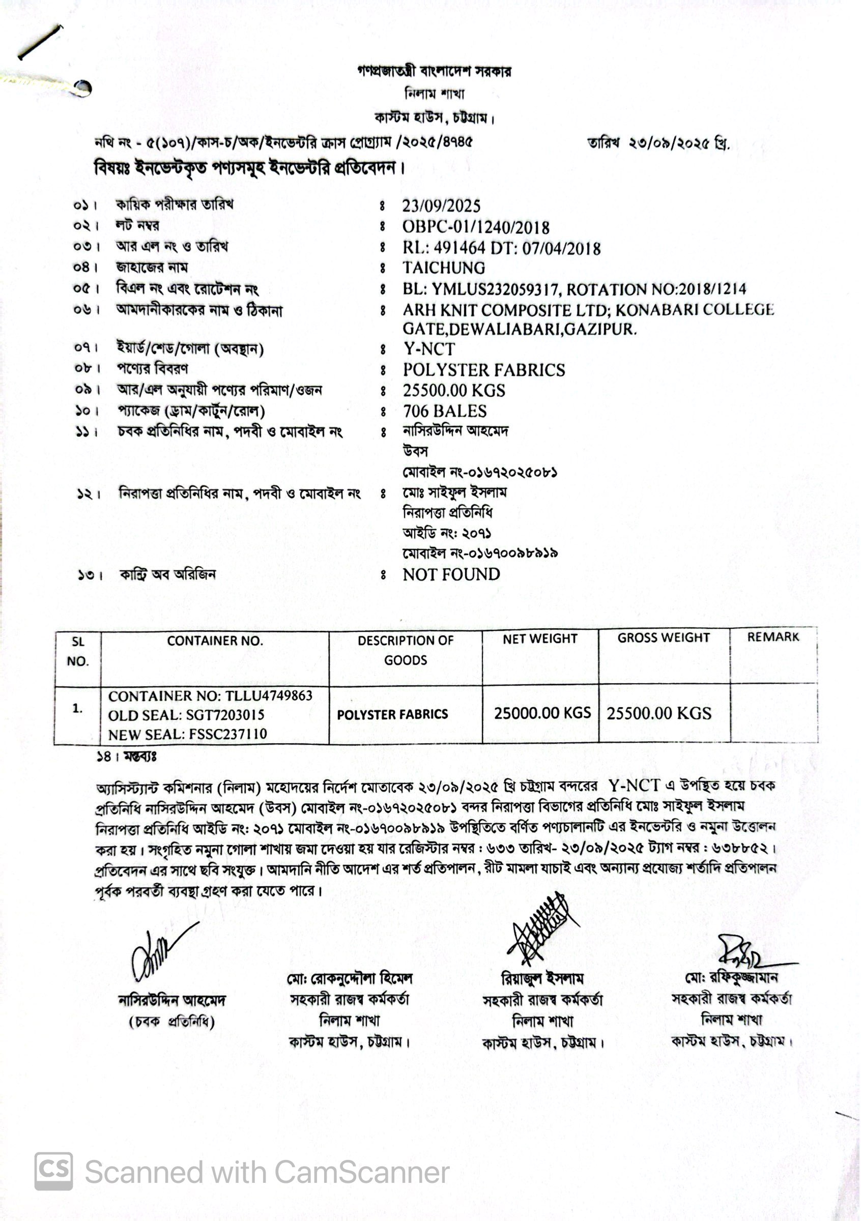 Terms & condition : আমদানি নীতি আদেশ এবং বিদ্যমান অন্যান্য আইন ও বিধি-বিধানের প্রযোজ্য সকল শর্ত পরিপালন এবং প্রযোজ্য ক্ষেত্রে রাসায়নিক পরীক্ষায় পণ্যের সঠিকতা ও ব্যবহার উপযোগিতা থাকা সাপেক্ষে খালাসকালে পণ্যের বর্ণনা এবং ওজন নিশ্চিত করে পণ্য ছাড়যোগ্য হবে। কোন লটভুক্ত পণ্যচালানে মেয়াদ উত্তীর্ণ/ধ্বসংযোগ্য পণ্য অন্তর্ভুক্ত থাকলে, উক্ত পণ্যচালানের ক্ষেত্রে মেয়াদ উত্তীর্ণ/ধ্বসংযোগ্য পণ্য ব্যতীত (প্রযোজ্য ক্ষেত্রে) কেবল মেয়াদযুক্ত/নিলামযোগ্য পণ্যসমূহ বিদ্যমান ও প্রযোজ্য আইন ও বিধি-বিধানের প্রযোজ্য সকল শর্ত পরিপালন সাপেক্ষে পণ্য ছাড়যোগ্য হবে। সার্ভার জটিলতা এড়ানোর জন্য আগ্রহী নিলাম ক্রেতাগণকে সরেজমিন পণ্য দেখে নিলামের নির্ধারিত শেষ তারিখ ও সময়ের (২৪/১২/২০২৫ খ্রি. তারিখ দুপুর ০২.০০ টা) পূর্বেই বিশেষ ই-নিলামে অংশগ্রহণ করার জন্য অনুরোধ করা যাচ্ছে। কোনরূপ কারণ দর্শানো ব্যতিরেকে কর্তৃপক্ষ যে কোন সময় ও পর্যায়ে যে কোন লট বা সকল লটের নিলাম আংশিক বা সম্পূর্ণ স্থগিত বা বাতিলের অধিকার সংরক্ষণ করেন।
