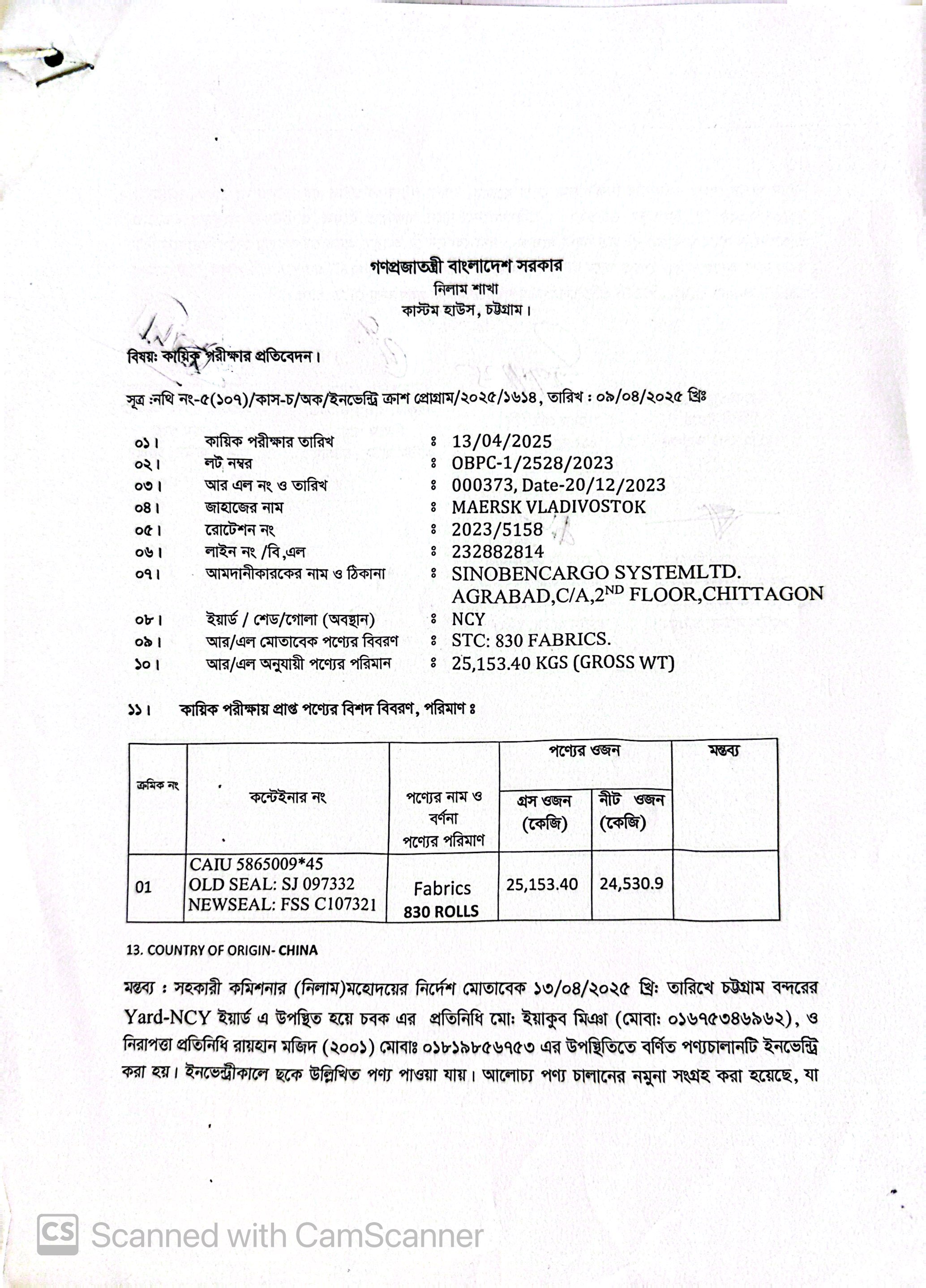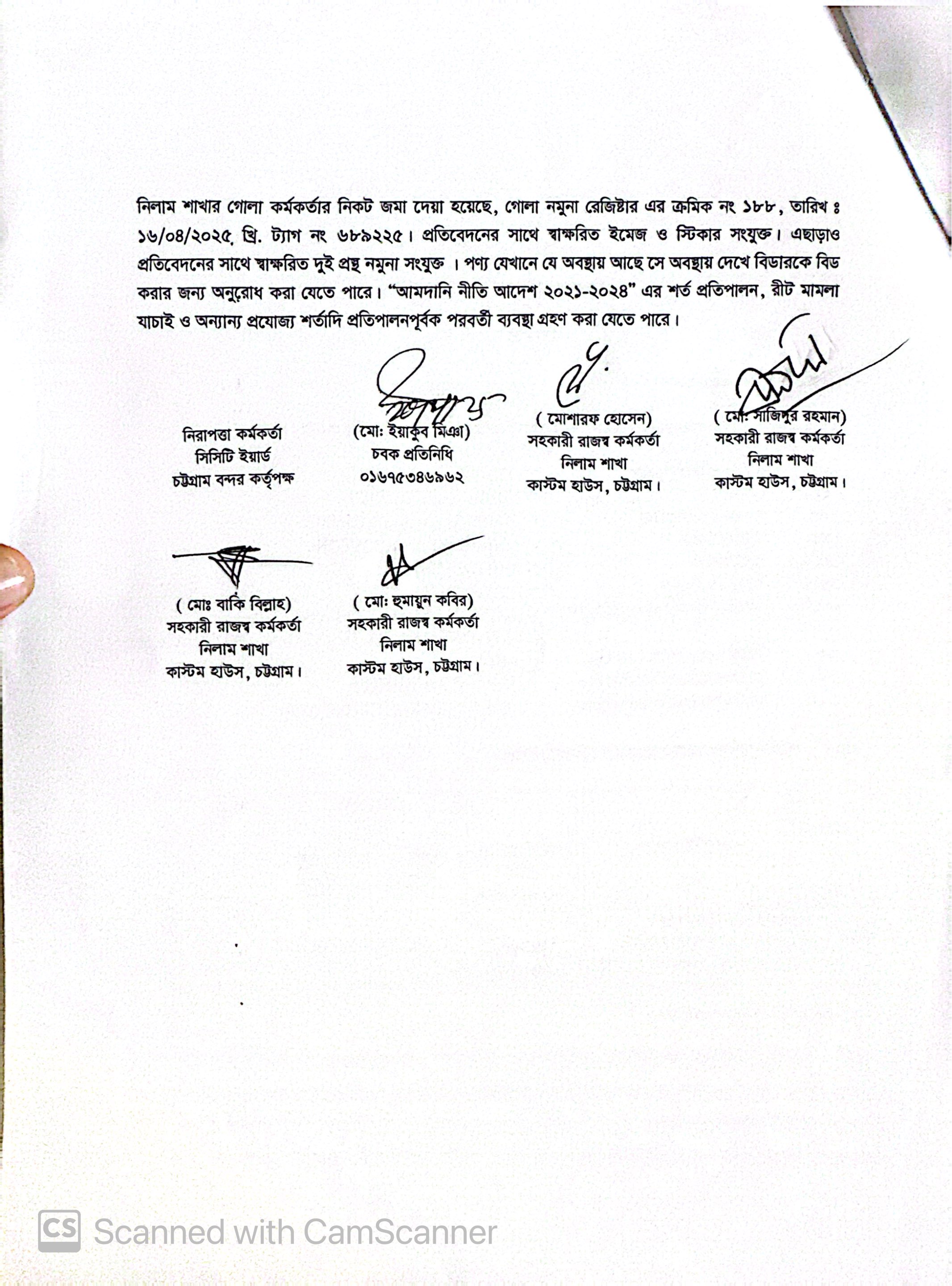 Terms & condition : আমদানি নীতি আদেশ এবং বিদ্যমান অন্যান্য আইন ও বিধি-বিধানের প্রযোজ্য সকল শর্ত পরিপালন এবং প্রযোজ্য ক্ষেত্রে রাসায়নিক পরীক্ষায় পণ্যের সঠিকতা ও ব্যবহার উপযোগিতা থাকা সাপেক্ষে খালাসকালে পণ্যের বর্ণনা এবং ওজন নিশ্চিত করে পণ্য ছাড়যোগ্য হবে। কোন লটভুক্ত পণ্যচালানে মেয়াদ উত্তীর্ণ/ধ্বসংযোগ্য পণ্য অন্তর্ভুক্ত থাকলে, উক্ত পণ্যচালানের ক্ষেত্রে মেয়াদ উত্তীর্ণ/ধ্বসংযোগ্য পণ্য ব্যতীত (প্রযোজ্য ক্ষেত্রে) কেবল মেয়াদযুক্ত/নিলামযোগ্য পণ্যসমূহ বিদ্যমান ও প্রযোজ্য আইন ও বিধি-বিধানের প্রযোজ্য সকল শর্ত পরিপালন সাপেক্ষে পণ্য ছাড়যোগ্য হবে। সার্ভার জটিলতা এড়ানোর জন্য আগ্রহী নিলাম ক্রেতাগণকে সরেজমিন পণ্য দেখে নিলামের নির্ধারিত শেষ তারিখ ও সময়ের (২৪/১২/২০২৫ খ্রি. তারিখ দুপুর ০২.০০ টা) পূর্বেই বিশেষ ই-নিলামে অংশগ্রহণ করার জন্য অনুরোধ করা যাচ্ছে। কোনরূপ কারণ দর্শানো ব্যতিরেকে কর্তৃপক্ষ যে কোন সময় ও পর্যায়ে যে কোন লট বা সকল লটের নিলাম আংশিক বা সম্পূর্ণ স্থগিত বা বাতিলের অধিকার সংরক্ষণ করেন।