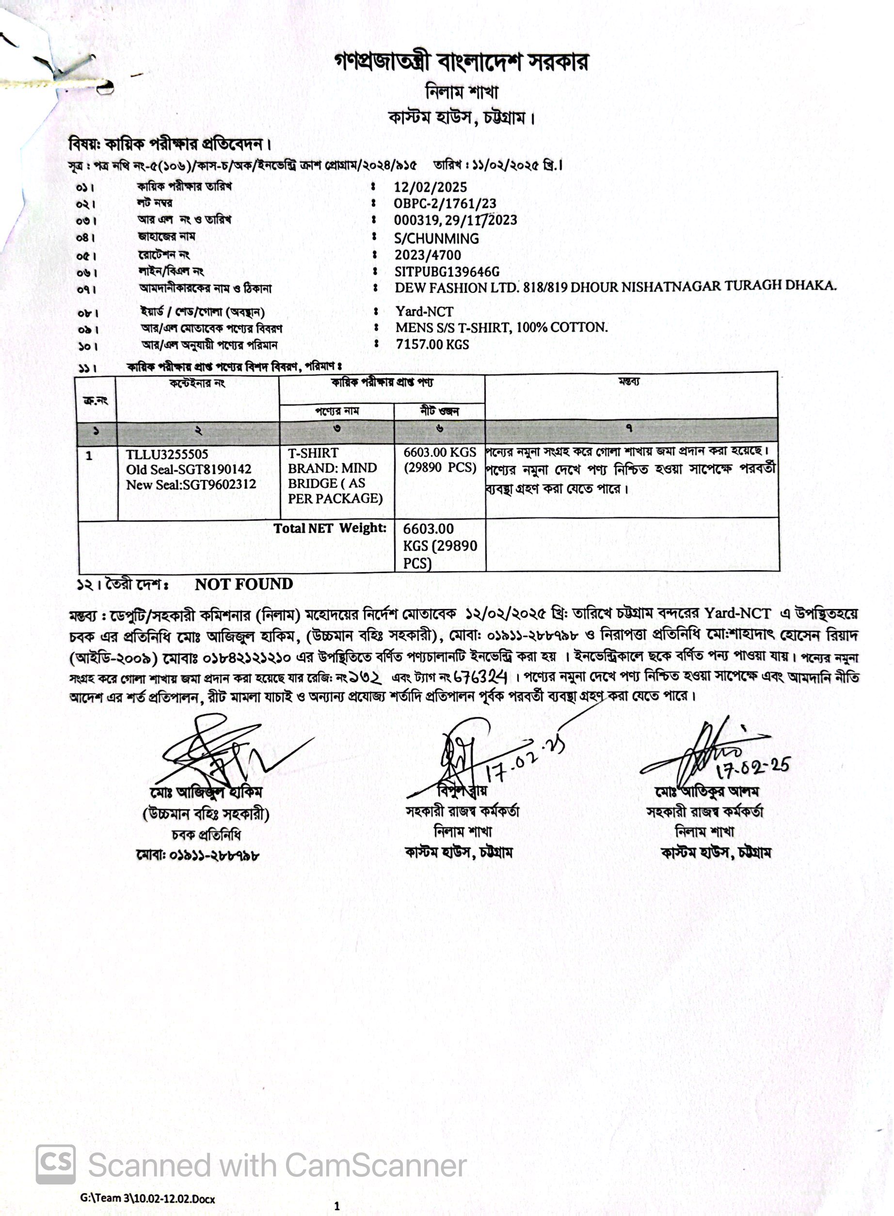 Terms & condition : আমদানি নীতি আদেশ এবং বিদ্যমান অন্যান্য আইন ও বিধি-বিধানের প্রযোজ্য সকল শর্ত পরিপালন এবং প্রযোজ্য ক্ষেত্রে রাসায়নিক পরীক্ষায় পণ্যের সঠিকতা ও ব্যবহার উপযোগিতা থাকা সাপেক্ষে খালাসকালে পণ্যের বর্ণনা এবং ওজন নিশ্চিত করে পণ্য ছাড়যোগ্য হবে। কোন লটভুক্ত পণ্যচালানে মেয়াদ উত্তীর্ণ/ধ্বসংযোগ্য পণ্য অন্তর্ভুক্ত থাকলে, উক্ত পণ্যচালানের ক্ষেত্রে মেয়াদ উত্তীর্ণ/ধ্বসংযোগ্য পণ্য ব্যতীত (প্রযোজ্য ক্ষেত্রে) কেবল মেয়াদযুক্ত/নিলামযোগ্য পণ্যসমূহ বিদ্যমান ও প্রযোজ্য আইন ও বিধি-বিধানের প্রযোজ্য সকল শর্ত পরিপালন সাপেক্ষে পণ্য ছাড়যোগ্য হবে। সার্ভার জটিলতা এড়ানোর জন্য আগ্রহী নিলাম ক্রেতাগণকে সরেজমিন পণ্য দেখে নিলামের নির্ধারিত শেষ তারিখ ও সময়ের (২৪/১২/২০২৫ খ্রি. তারিখ দুপুর ০২.০০ টা) পূর্বেই বিশেষ ই-নিলামে অংশগ্রহণ করার জন্য অনুরোধ করা যাচ্ছে। কোনরূপ কারণ দর্শানো ব্যতিরেকে কর্তৃপক্ষ যে কোন সময় ও পর্যায়ে যে কোন লট বা সকল লটের নিলাম আংশিক বা সম্পূর্ণ স্থগিত বা বাতিলের অধিকার সংরক্ষণ করেন।