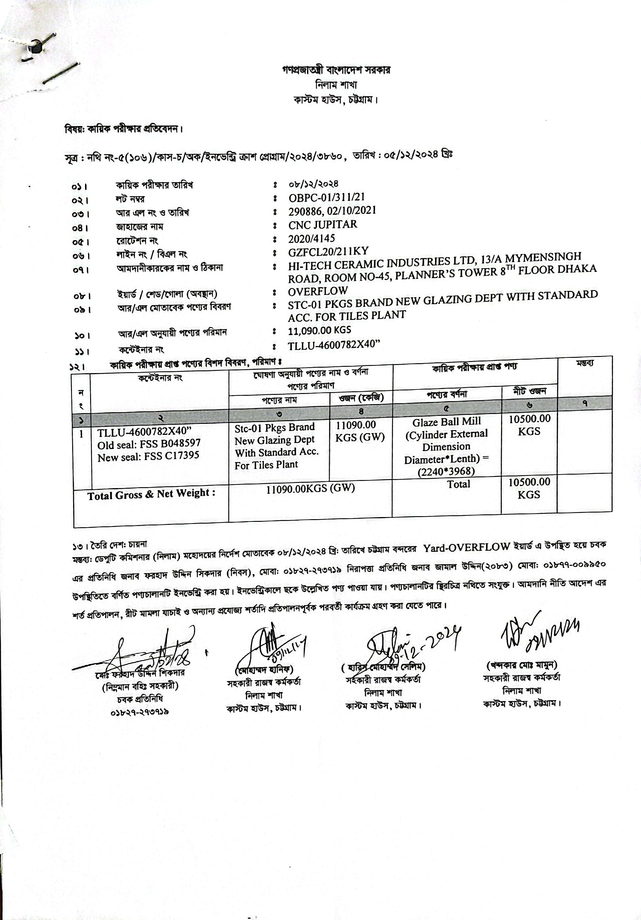 লটের শিরোনাম :Brand New Glazing Dept with Standard Acc. For Tiles Plant [Glaze Ball Mill (Cylinder External Dimension Diameter*Length)=(2240*3968)](Previous Bid: 0 TK)
