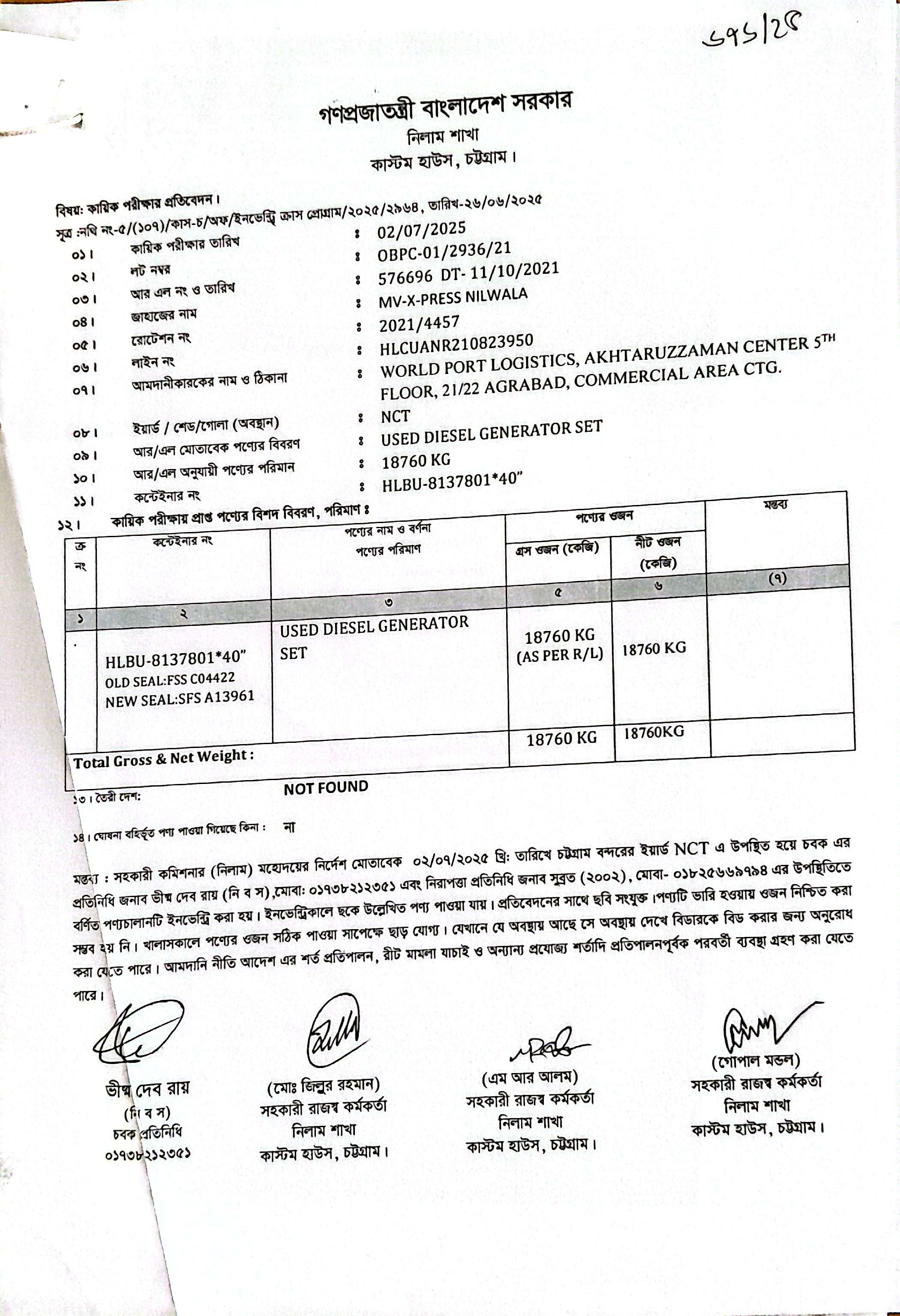 লটের শিরোনাম :Used Diesel Generator Set(Previous Bid: 0 TK)