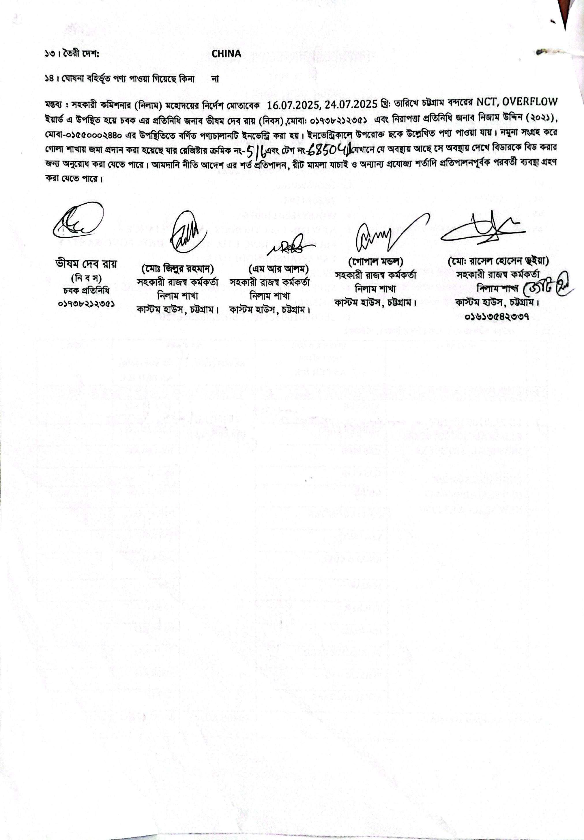 Terms & condition : আমদানি নীতি আদেশ এবং বিদ্যমান অন্যান্য আইন ও বিধি-বিধানের প্রযোজ্য সকল শর্ত পরিপালন এবং প্রযোজ্য ক্ষেত্রে রাসায়নিক পরীক্ষায় পণ্যের সঠিকতা ও ব্যবহার উপযোগিতা থাকা সাপেক্ষে খালাসকালে পণ্যের বর্ণনা এবং ওজন নিশ্চিত করে পণ্য ছাড়যোগ্য হবে। কোন লটভুক্ত পণ্যচালানে মেয়াদ উত্তীর্ণ/ধ্বসংযোগ্য পণ্য অন্তর্ভুক্ত থাকলে, উক্ত পণ্যচালানের ক্ষেত্রে মেয়াদ উত্তীর্ণ/ধ্বসংযোগ্য পণ্য ব্যতীত (প্রযোজ্য ক্ষেত্রে) কেবল মেয়াদযুক্ত/নিলামযোগ্য পণ্যসমূহ বিদ্যমান ও প্রযোজ্য আইন ও বিধি-বিধানের প্রযোজ্য সকল শর্ত পরিপালন সাপেক্ষে পণ্য ছাড়যোগ্য হবে। সার্ভার জটিলতা এড়ানোর জন্য আগ্রহী নিলাম ক্রেতাগণকে সরেজমিন পণ্য দেখে নিলামের নির্ধারিত শেষ তারিখ ও সময়ের (২৪/১২/২০২৫ খ্রি. তারিখ দুপুর ০২.০০ টা) পূর্বেই বিশেষ ই-নিলামে অংশগ্রহণ করার জন্য অনুরোধ করা যাচ্ছে। কোনরূপ কারণ দর্শানো ব্যতিরেকে কর্তৃপক্ষ যে কোন সময় ও পর্যায়ে যে কোন লট বা সকল লটের নিলাম আংশিক বা সম্পূর্ণ স্থগিত বা বাতিলের অধিকার সংরক্ষণ করেন।