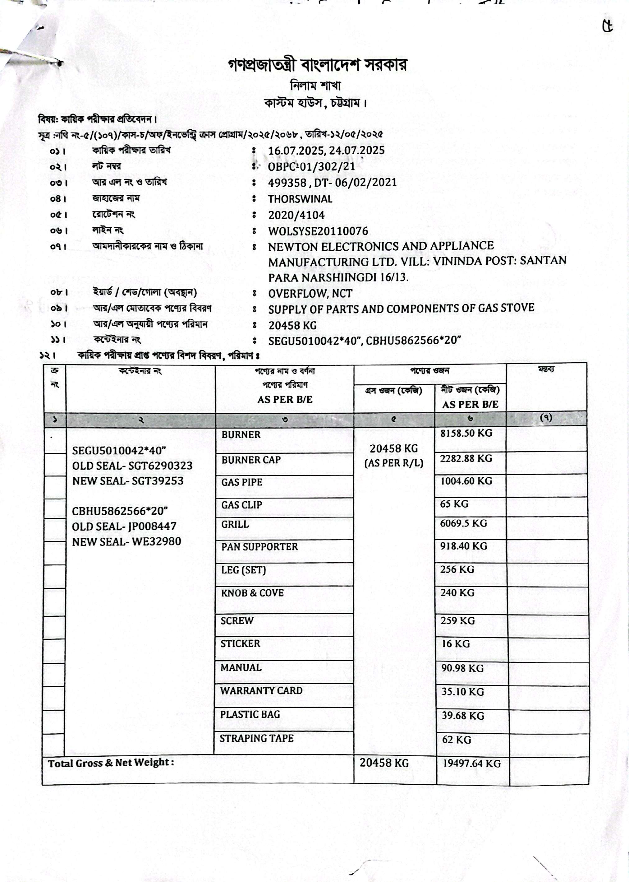 লটের শিরোনাম :(1) Burner 8158.50 Kgs; (2) Burner Cap 2282.88 Kgs; (3) Gas Pipe 1004.60 Kgs; (4) Gas Clip 65 Kgs; (5) Grill 6069.5 Kgs; (6) Pan Supporter 918.40 Kgs; (7) LEG (Set) 256 Kgs; (8) Knob & Cove 240 Kgs; ((Previous Bid: 0 TK)