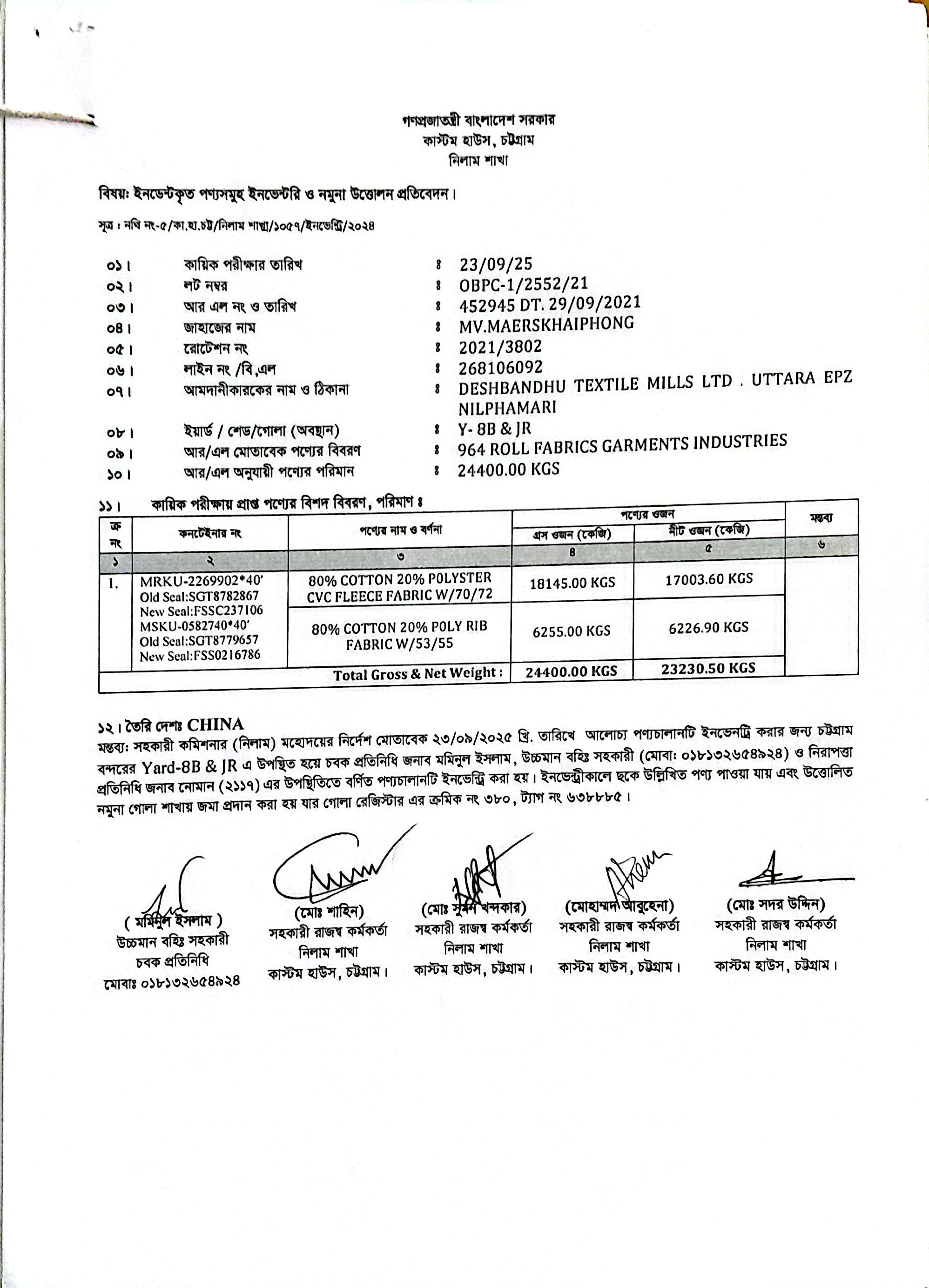 লটের শিরোনাম :(1) Fleece Fabrics 17,003.60 Kgs; (2) RIB Fabrics 6226.90 Kgs(Previous Bid: 0 TK)