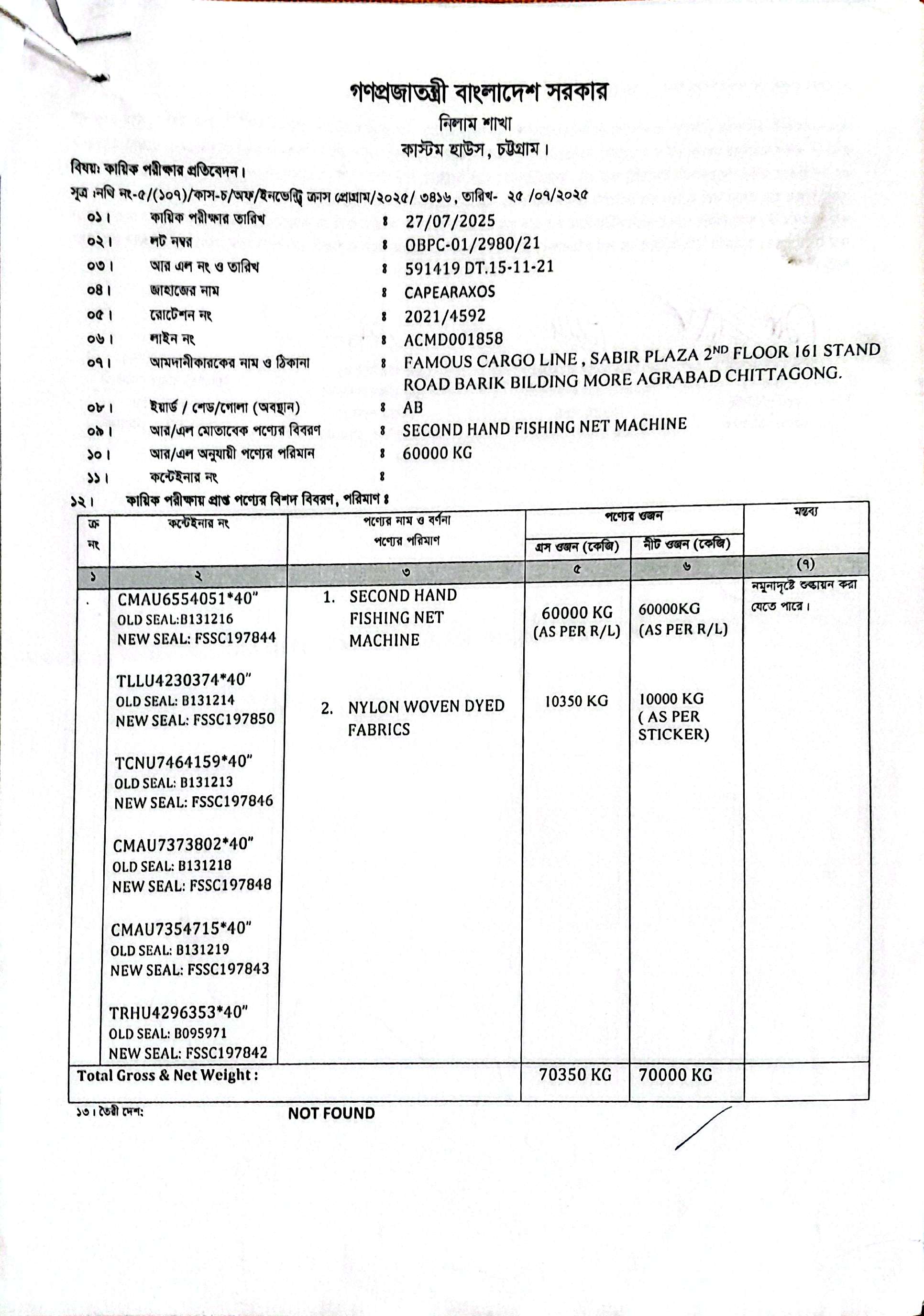 লটের শিরোনাম :(1) Second Hand Finishing Net Machine 60,000 Kgs; (2) Nylon Woven Dyed Fabrics 10,000 Kgs(Previous Bid: 0 TK)