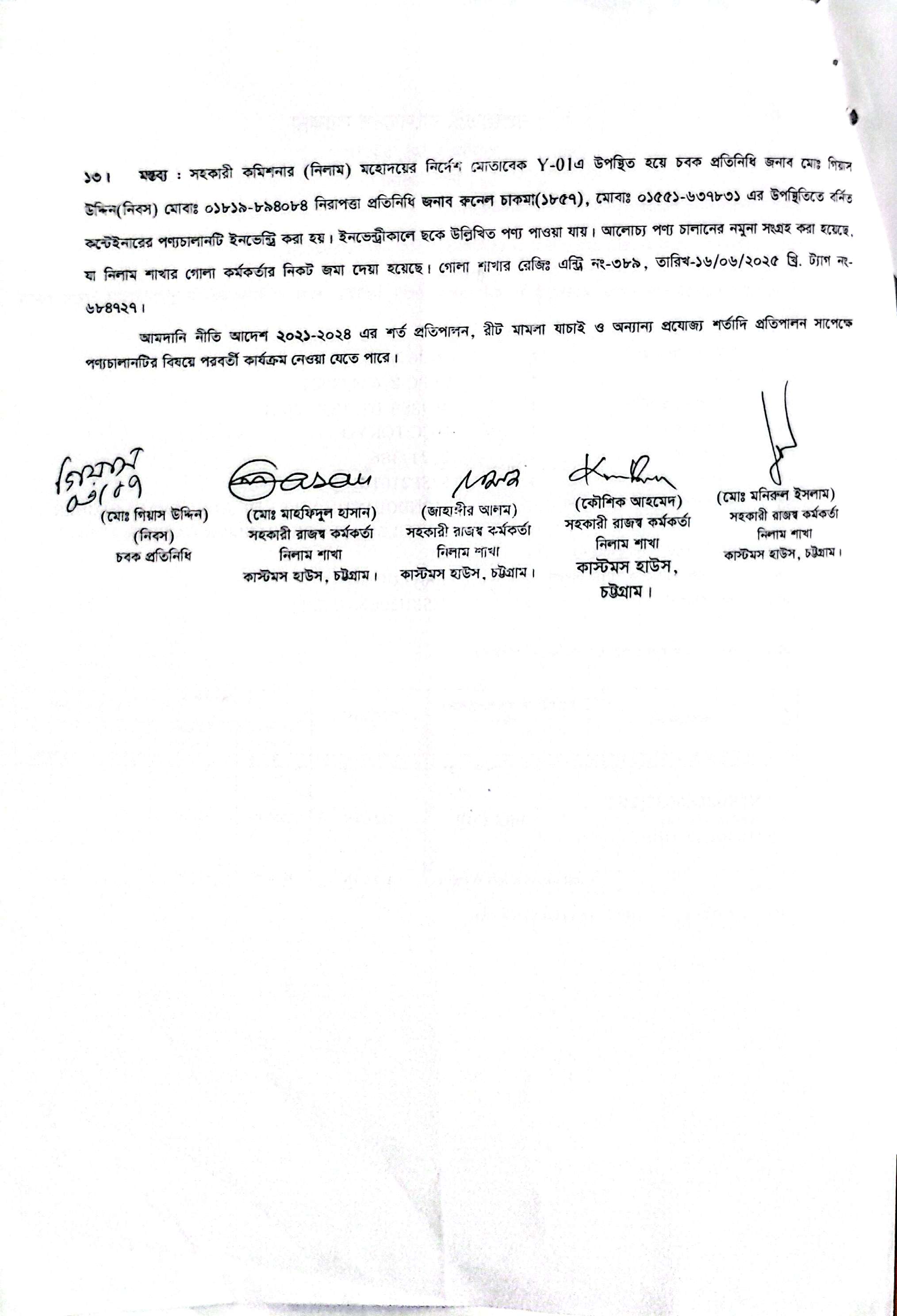 Terms & condition : আমদানি নীতি আদেশ এবং বিদ্যমান অন্যান্য আইন ও বিধি-বিধানের প্রযোজ্য সকল শর্ত পরিপালন এবং প্রযোজ্য ক্ষেত্রে রাসায়নিক পরীক্ষায় পণ্যের সঠিকতা ও ব্যবহার উপযোগিতা থাকা সাপেক্ষে খালাসকালে পণ্যের বর্ণনা এবং ওজন নিশ্চিত করে পণ্য ছাড়যোগ্য হবে। কোন লটভুক্ত পণ্যচালানে মেয়াদ উত্তীর্ণ/ধ্বসংযোগ্য পণ্য অন্তর্ভুক্ত থাকলে, উক্ত পণ্যচালানের ক্ষেত্রে মেয়াদ উত্তীর্ণ/ধ্বসংযোগ্য পণ্য ব্যতীত (প্রযোজ্য ক্ষেত্রে) কেবল মেয়াদযুক্ত/নিলামযোগ্য পণ্যসমূহ বিদ্যমান ও প্রযোজ্য আইন ও বিধি-বিধানের প্রযোজ্য সকল শর্ত পরিপালন সাপেক্ষে পণ্য ছাড়যোগ্য হবে। সার্ভার জটিলতা এড়ানোর জন্য আগ্রহী নিলাম ক্রেতাগণকে সরেজমিন পণ্য দেখে নিলামের নির্ধারিত শেষ তারিখ ও সময়ের (২৪/১২/২০২৫ খ্রি. তারিখ দুপুর ০২.০০ টা) পূর্বেই বিশেষ ই-নিলামে অংশগ্রহণ করার জন্য অনুরোধ করা যাচ্ছে। কোনরূপ কারণ দর্শানো ব্যতিরেকে কর্তৃপক্ষ যে কোন সময় ও পর্যায়ে যে কোন লট বা সকল লটের নিলাম আংশিক বা সম্পূর্ণ স্থগিত বা বাতিলের অধিকার সংরক্ষণ করেন।