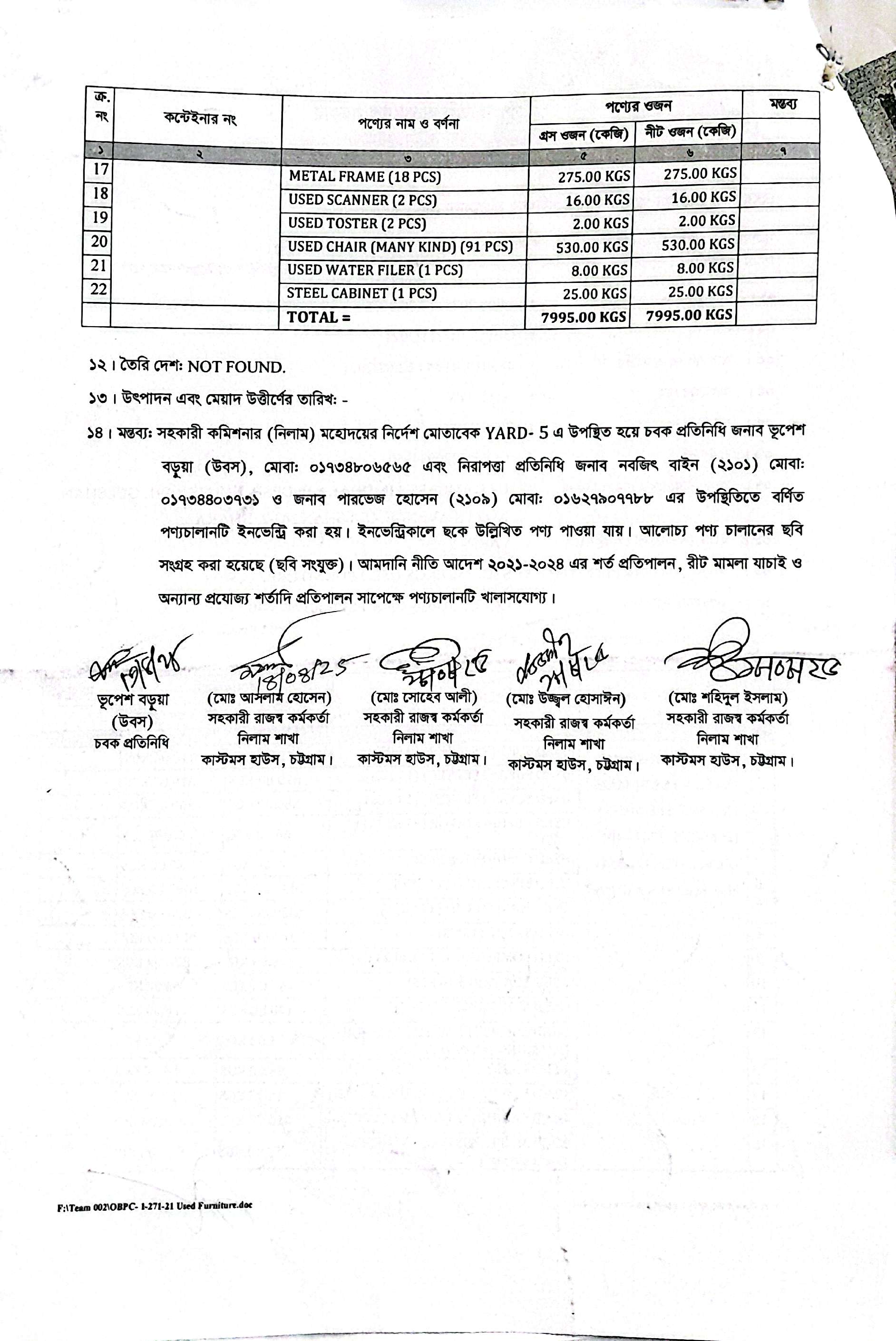 Terms & condition : আমদানি নীতি আদেশ এবং বিদ্যমান অন্যান্য আইন ও বিধি-বিধানের প্রযোজ্য সকল শর্ত পরিপালন এবং প্রযোজ্য ক্ষেত্রে রাসায়নিক পরীক্ষায় পণ্যের সঠিকতা ও ব্যবহার উপযোগিতা থাকা সাপেক্ষে খালাসকালে পণ্যের বর্ণনা এবং ওজন নিশ্চিত করে পণ্য ছাড়যোগ্য হবে। কোন লটভুক্ত পণ্যচালানে মেয়াদ উত্তীর্ণ/ধ্বসংযোগ্য পণ্য অন্তর্ভুক্ত থাকলে, উক্ত পণ্যচালানের ক্ষেত্রে মেয়াদ উত্তীর্ণ/ধ্বসংযোগ্য পণ্য ব্যতীত (প্রযোজ্য ক্ষেত্রে) কেবল মেয়াদযুক্ত/নিলামযোগ্য পণ্যসমূহ বিদ্যমান ও প্রযোজ্য আইন ও বিধি-বিধানের প্রযোজ্য সকল শর্ত পরিপালন সাপেক্ষে পণ্য ছাড়যোগ্য হবে। সার্ভার জটিলতা এড়ানোর জন্য আগ্রহী নিলাম ক্রেতাগণকে সরেজমিন পণ্য দেখে নিলামের নির্ধারিত শেষ তারিখ ও সময়ের (২৪/১২/২০২৫ খ্রি. তারিখ দুপুর ০২.০০ টা) পূর্বেই বিশেষ ই-নিলামে অংশগ্রহণ করার জন্য অনুরোধ করা যাচ্ছে। কোনরূপ কারণ দর্শানো ব্যতিরেকে কর্তৃপক্ষ যে কোন সময় ও পর্যায়ে যে কোন লট বা সকল লটের নিলাম আংশিক বা সম্পূর্ণ স্থগিত বা বাতিলের অধিকার সংরক্ষণ করেন।