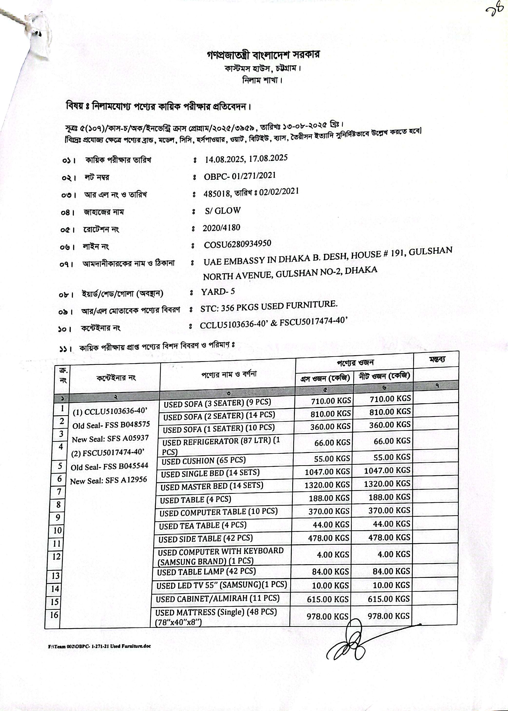 (1) Used Sofa (3-Seater 9Pcs) 710 Kgs; (2) Used Sofa (2-Seater 14Pcs) 810 Kgs; (3) Used Sofa (1 Seater 10Pcs) 360 Kgs; (4) Used Refrigerator (87 Ltr 1Pcs) 66 Kgs; (5) Used Cushion (65Pcs) 55 Kgs; (6) Used Single Bed (14 Sets) 1320 Kgs; (7) Used Master Bed (14 Sets) 1320 Kgs; (8) Used Table (4Pcs) 188 Kgs; (9) Used Computer Table (10Pcs) 370 Kgs; (10) Used Tea Table (4Pcs) 44 Kgs; (11) Used Side Table (42Pcs) 478 Kgs; (12) Used Computer With Keyboard (Samsung Brand) (1Pcs) 4 Kgs; (13) Used Table Lamp (42Pcs) 84 Kgs; (14) Used LED TV 55” (Samsung) (1 Pcs) 10 Kgs; (15) Used Cabinet/Almirah (11Pcs) 615 Kgs; (16) Used Mattress (Single) (48Pcs) (78 X 40X 8) 978 Kgs; (17) Metal Frame (18Pcs) 275 Kgs; (18) Used Scanner (2Pcs) 16 Kgs; (19) Used Toaster (2Pcs) 2 Kgs; (20) Used Chair (Many Kind) (91Pcs) 530 Kgs; (21) Used Water Filter (1Pcs) 8 Kgs; (22) Steel Cabinet (1Pcs) 25 Kgs. |