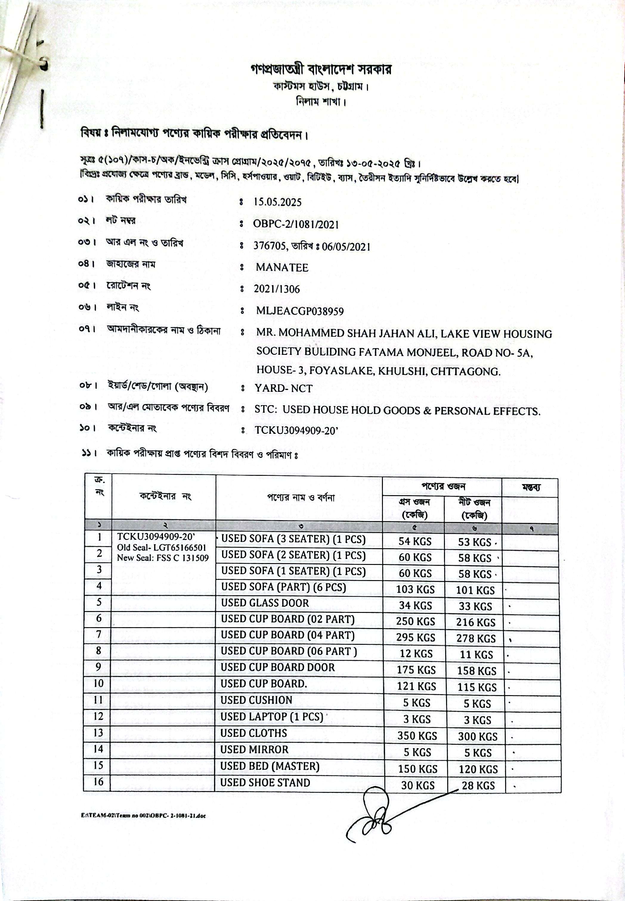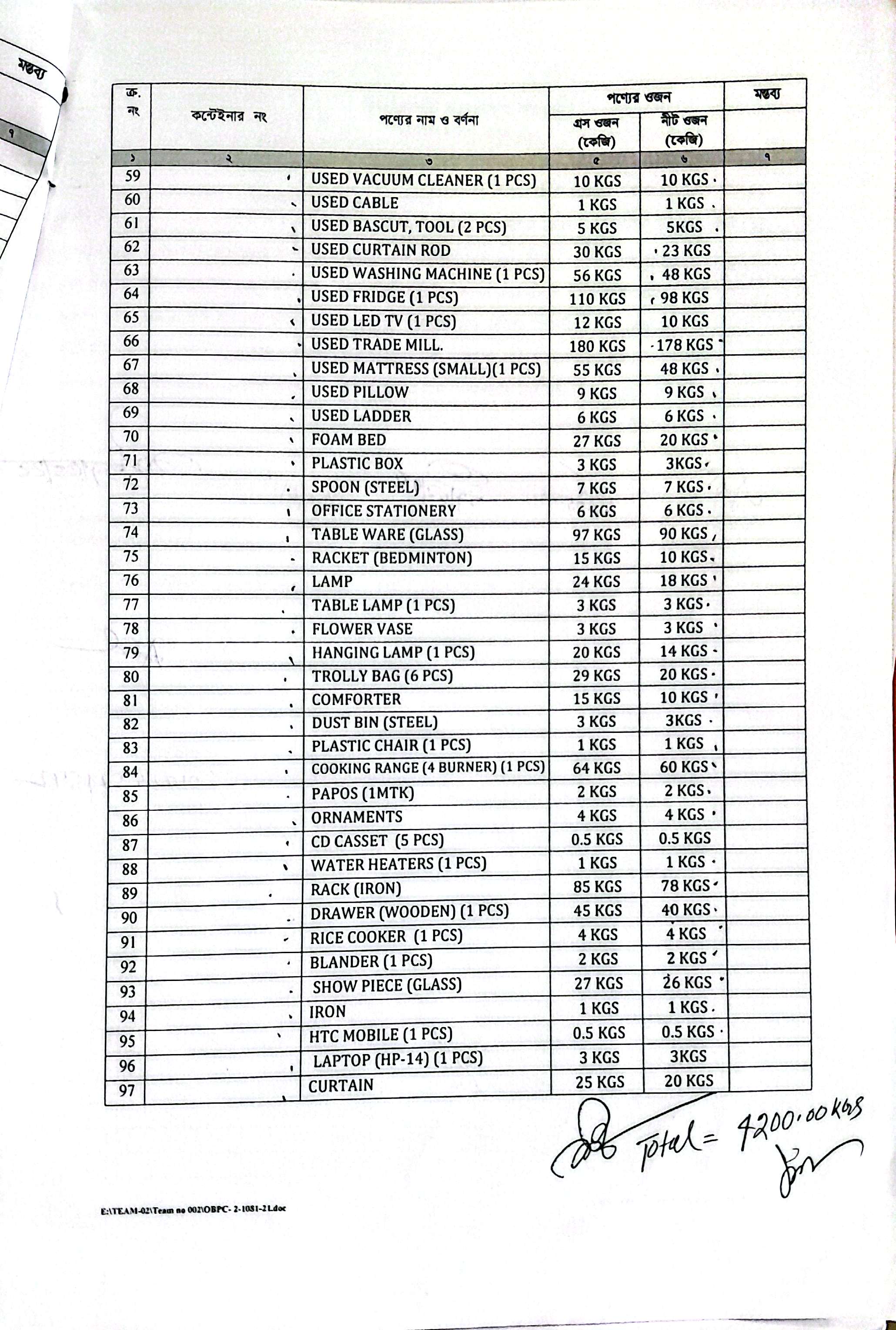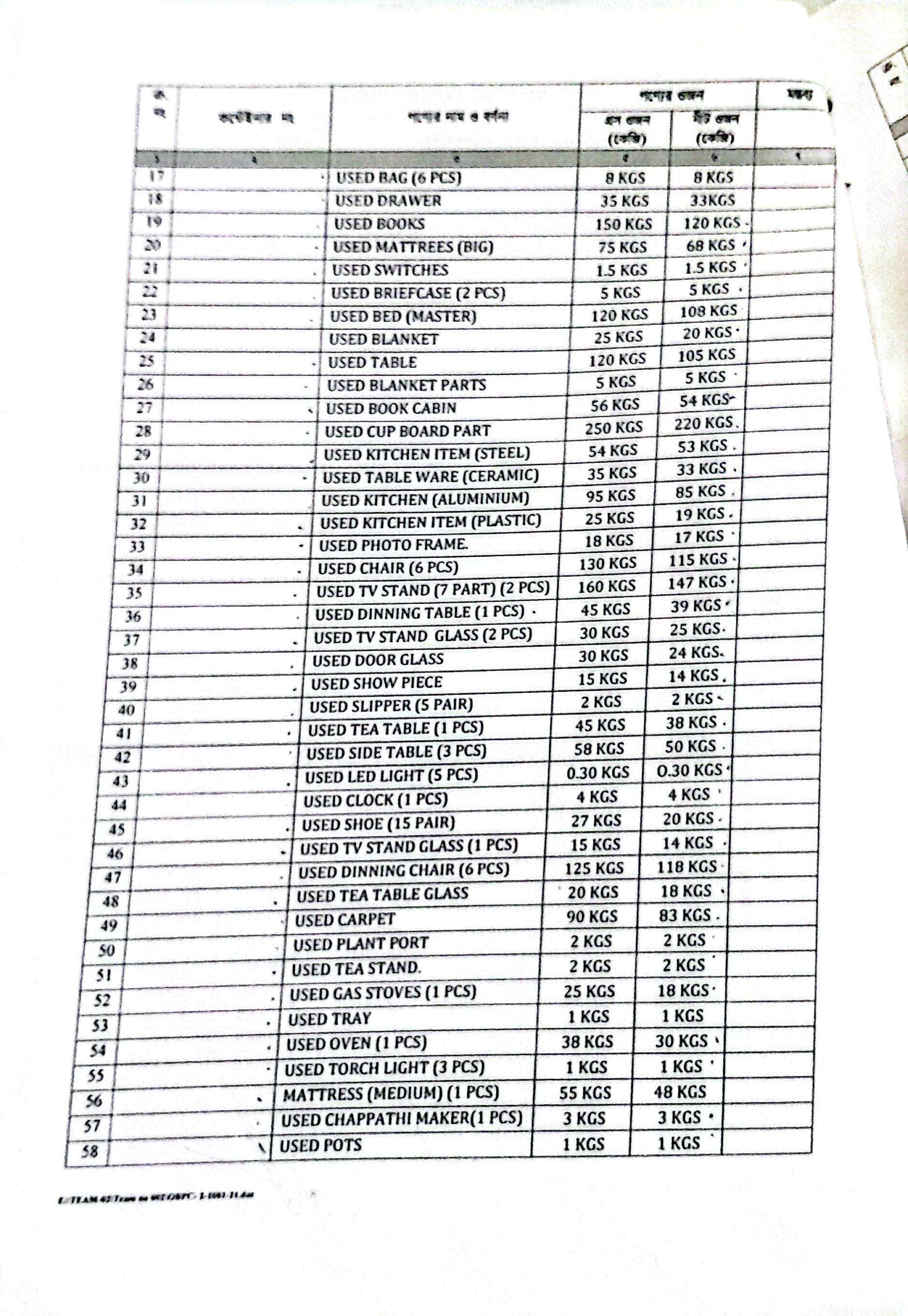 (1) Used Sofa (3-Seater) (1 Pcs)= 53 Kgs; (2) Used Sofa (2-Seater) (1 Pcs)= 58 Kgs; (3) Used Sofa (1 Seater) (1 Pcs)= 58 Kgs; (4) Used Sofa (Part) (6 Pcs)= 101 Kgs; (5) Used Glass Door= 33 Kgs; (6) Used Cup Board (02 Part)= 216 Kgs; (7) Used Cup Board (04 Part)= 278 Kgs; (8) Used Cup Board (06 Part)= 11 Kgs; (9) Used Cup Board Door= 158 Kgs; (10) Used Cup Board= 115 Kgs; (11) Used Cushion= 5 Kgs; (12) Used Laptop (1 Pcs)= 3 Kgs; (13) Used Cloths= 300 Kgs; (14) Used Mirror= 5 Kgs; (15) Used Bed (Master)= 120 Kgs; (16) Used Shoe Stand= 28 Kgs; (17) Used Bag (6 Pcs)= 8 Kgs; (18) Used Drawer= 33 Kgs; (19) Used Books= 120 Kgs; (20) Used Mattress (Big)= 68 Kgs; (21) Used Switches= 1.50 Kgs; (22) Used Briefcase (2 Pcs)= 5 Kgs; (23) Used Bed (Master)= 108 Kgs; (24) Used Blanket= 20 Kgs; (25) Used Table=105 Kgs; (26) Used Blanket Parts= 5 Kgs; (27) Used Book Cabin= 54 Kgs; (28) Used Cup Board Part= 220 Kgs; (29) Used Kitchen Item (Steel)= 53 Kgs; (30) Used Table Ware (Ceramic)= 33 Kgs; (31) Used Kitchen (Aluminium)= 85 Kgs; (32) Used Kitchen Item (Plastic)= 19 Kgs; (33) Used Photo Frame= 17 Kgs; (34) Used Chair (6 Pcs)= 115 Kgs; (35) Used TV Stand (7 Part) (2 Pcs)= 147 Kgs; (36) Used Dinning Table (1 Pcs)= 39 Kgs; (37) Used TV Stand Glass (2 Pcs)= 25 Kgs; (38) Used Door Glass= 24 Kgs; (39) Used Show Piece= 14 Kgs; (40) Used Slipper (5 Pair)= 2 Kgs; (41) Used Tea Table (1 Pcs)= 38 Kgs; (42) Used Side Table (3 Pcs)= 50 Kgs; (43) Used Led Light (5 Pcs)= 0.30 Kgs; (44) Used Clock (1 Pcs)= 4 Kgs; (45) Used Shoe (15 Pair)= 20 Kgs; (46) Used TV Stand Glass (1 Pcs)= 14 Kgs; (47) Used Dinning Chair (6 Pcs)= 118 Kgs; (48) Used Tea Table Glass= 18 Kgs; (49) Used Carpet=83 Kgs; (50) Used Plant Port= 2 Kgs; (51) Used Tea Stand=2 Kgs; (52) Used Gas Stoves (1 Pcs) = 18 Kgs; (53) Used Tray= 1 Kgs; (54) Used Oven (1 Pcs)= 30 Kgs; (55) Used Torch Light(3 Pcs)= 1 Kgs; (56) Mattress (Medium) (1 Pcs)= 48 Kgs; (57) Used Chapati Maker(1 Pcs)= 3 Kgs; (58) Used Pots=1 Kgs; (59) Used Vacuum Cleaner (1 Pcs)= 10 Kgs; (60) Used Cable= 1 Kgs; (61) Used Biscuit Tool (2 Pcs)= 5 Kgs; (62) Used Curtain Rod= 23 Kgs; (63) Used Washing Machine (1 Pcs)= 48 Kgs; (64) Used Fridge (1 Pcs)=98 Kgs; (65) Used LED TV (1 Pcs)=10 Kgs; (66) Used Trade Mill=178 Kgs; (67) Used Mattress (Small)(1 Pcs)= 48 Kgs; (68) Used Pillow= 9 Kgs; (69) Used Ladder= 6 Kgs; (70) Foam Bed= 20 Kgs; (71) Plastic Box= 3 Kgs; (72) Spoon (Steel)= 7 Kgs; (73) Office Stationery=6 Kgs; (74) Table Ware (Glass)= 90 Kgs; (75) Racket (Badminton)= 10 Kgs; (76) Lamp= 18 Kgs; (77) Table Lamp (1 Pcs)=3 Kgs; (78) Flower Vase=3 Kgs; (79) Hanging Lamp (1 Pcs)=14 Kgs; (80) Trolly Bag (6 Pcs)=20 Kgs; (81) Comforter=10 Kgs; (82) Dust Bin (Steel)=3 Kgs; (83) Plastic Chair (1 Pcs)=1 Kgs; (84) Cooking Range (4 Burner) (1 Pcs)=60 Kgs; (85) Papos (1 Mtk)=2 Kgs; (86) Ornaments= 4 Kgs; (87) CD Casset (5 Pcs)= 0.50 Kgs; (88) Water Heaters (1 Pcs)=1 Kgs; (89) Rack (Iron)= 78 Kgs; (90) Drawer (Wooden) (1 Pcs)=40 Kgs; (91) Rice Cooker (1 Pcs)= 4 Kgs; (92) Blander (1 Pcs)=2 Kgs; (93) Show Piece (Glass)= 26 Kgs; (94) Iron= 1 Kgs; (95) HTC Mobile (1 Pcs)=0.50 Kgs; (96) Laptop (HP-14) (1 Pcs)=3 Kgs; (97) Curtain=97 Kgs. |