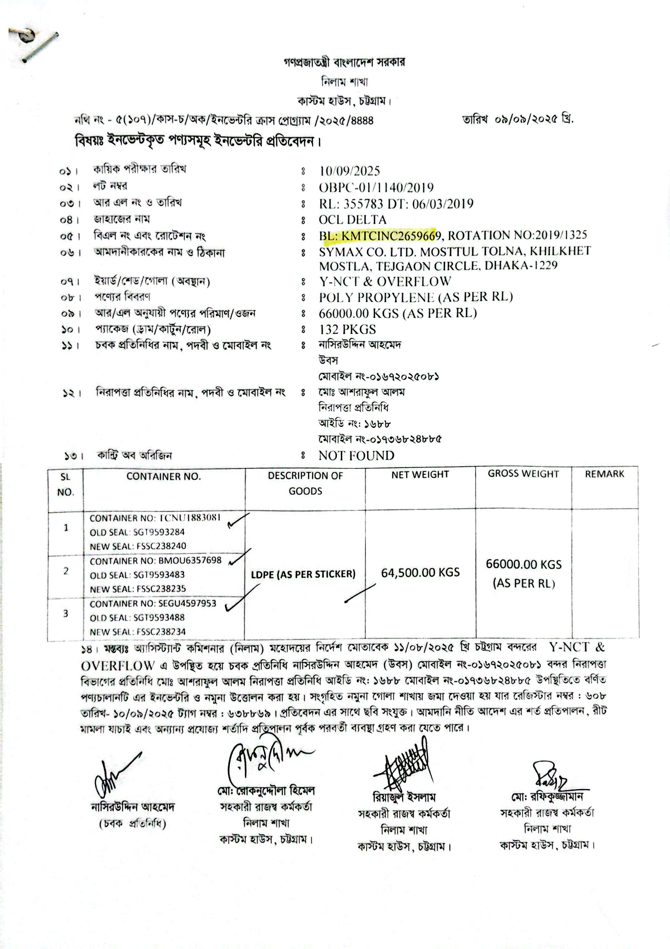 Terms & condition : আমদানি নীতি আদেশ এবং বিদ্যমান অন্যান্য আইন ও বিধি-বিধানের প্রযোজ্য সকল শর্ত পরিপালন এবং প্রযোজ্য ক্ষেত্রে রাসায়নিক পরীক্ষায় পণ্যের সঠিকতা ও ব্যবহার উপযোগিতা থাকা সাপেক্ষে খালাসকালে পণ্যের বর্ণনা এবং ওজন নিশ্চিত করে পণ্য ছাড়যোগ্য হবে। কোন লটভুক্ত পণ্যচালানে মেয়াদ উত্তীর্ণ/ধ্বসংযোগ্য পণ্য অন্তর্ভুক্ত থাকলে, উক্ত পণ্যচালানের ক্ষেত্রে মেয়াদ উত্তীর্ণ/ধ্বসংযোগ্য পণ্য ব্যতীত (প্রযোজ্য ক্ষেত্রে) কেবল মেয়াদযুক্ত/নিলামযোগ্য পণ্যসমূহ বিদ্যমান ও প্রযোজ্য আইন ও বিধি-বিধানের প্রযোজ্য সকল শর্ত পরিপালন সাপেক্ষে পণ্য ছাড়যোগ্য হবে। সার্ভার জটিলতা এড়ানোর জন্য আগ্রহী নিলাম ক্রেতাগণকে সরেজমিন পণ্য দেখে নিলামের নির্ধারিত শেষ তারিখ ও সময়ের (২৪/১২/২০২৫ খ্রি. তারিখ দুপুর ০২.০০ টা) পূর্বেই বিশেষ ই-নিলামে অংশগ্রহণ করার জন্য অনুরোধ করা যাচ্ছে। কোনরূপ কারণ দর্শানো ব্যতিরেকে কর্তৃপক্ষ যে কোন সময় ও পর্যায়ে যে কোন লট বা সকল লটের নিলাম আংশিক বা সম্পূর্ণ স্থগিত বা বাতিলের অধিকার সংরক্ষণ করেন।