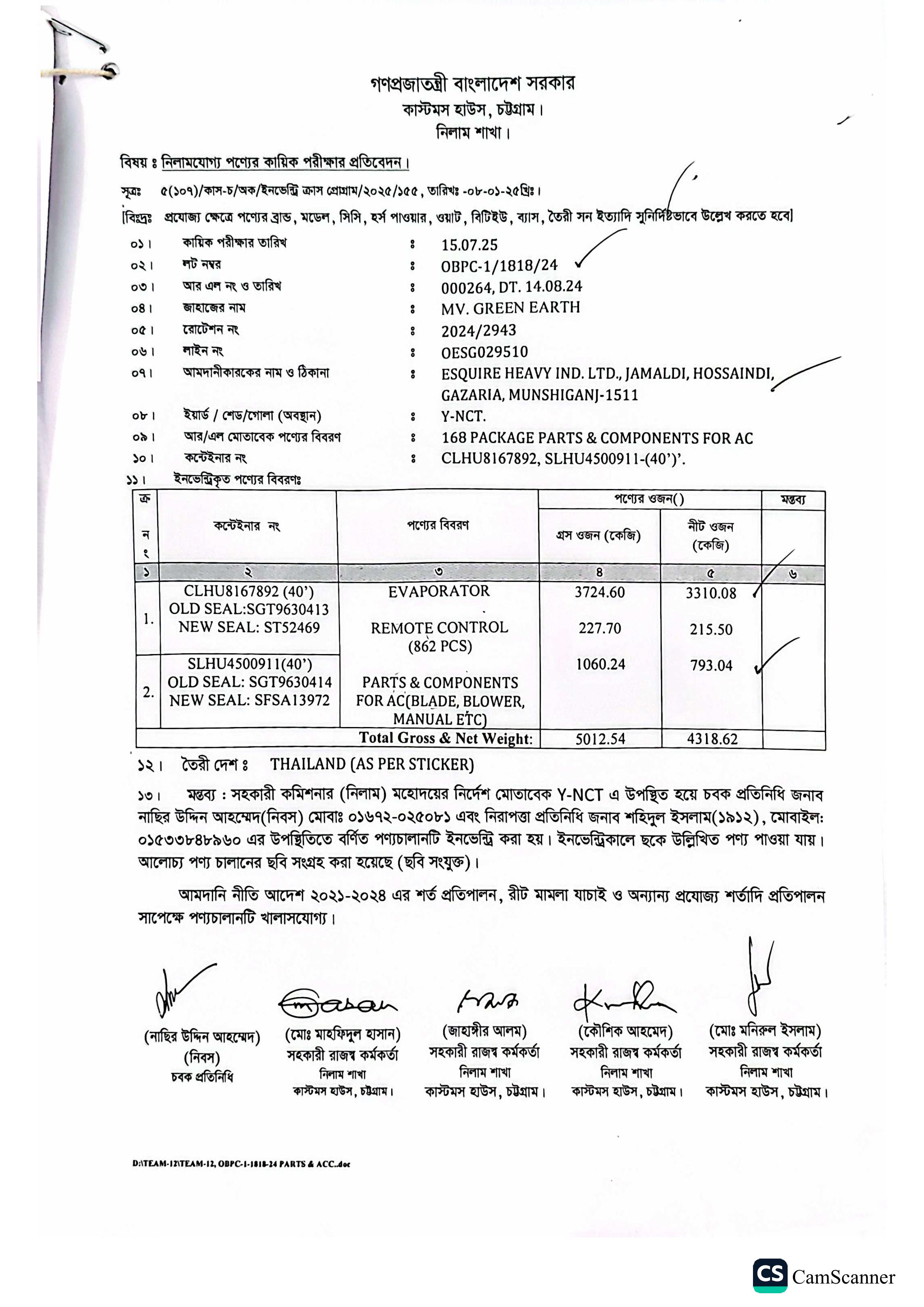 Terms & condition : আমদানি নীতি আদেশ এবং বিদ্যমান অন্যান্য আইন ও বিধি-বিধানের প্রযোজ্য সকল শর্ত পরিপালন এবং প্রযোজ্য ক্ষেত্রে রাসায়নিক পরীক্ষায় পণ্যের সঠিকতা ও ব্যবহার উপযোগিতা থাকা সাপেক্ষে খালাসকালে পণ্যের বর্ণনা এবং ওজন নিশ্চিত করে পণ্য ছাড়যোগ্য হবে। কোন লটভুক্ত পণ্যচালানে মেয়াদ উত্তীর্ণ/ধ্বসংযোগ্য পণ্য অন্তর্ভুক্ত থাকলে, উক্ত পণ্যচালানের ক্ষেত্রে মেয়াদ উত্তীর্ণ/ধ্বসংযোগ্য পণ্য ব্যতীত (প্রযোজ্য ক্ষেত্রে) কেবল মেয়াদযুক্ত/নিলামযোগ্য পণ্যসমূহ বিদ্যমান ও প্রযোজ্য আইন ও বিধি-বিধানের প্রযোজ্য সকল শর্ত পরিপালন সাপেক্ষে পণ্য ছাড়যোগ্য হবে। সার্ভার জটিলতা এড়ানোর জন্য আগ্রহী নিলাম ক্রেতাগণকে সরেজমিন পণ্য দেখে নিলামের নির্ধারিত শেষ তারিখ ও সময়ের পূর্বেই ই-নিলামে অংশগ্রহণ করার জন্য অনুরোধ করা যাচ্ছে। কোনরূপ কারণ দর্শানো ব্যতিরেকে কর্তৃপক্ষ যে কোন সময় ও পর্যায়ে যে কোন লট বা সকল লটের নিলাম আংশিক বা সম্পূর্ণ স্থগিত বা বাতিলের অধিকার সংরক্ষণ করেন।