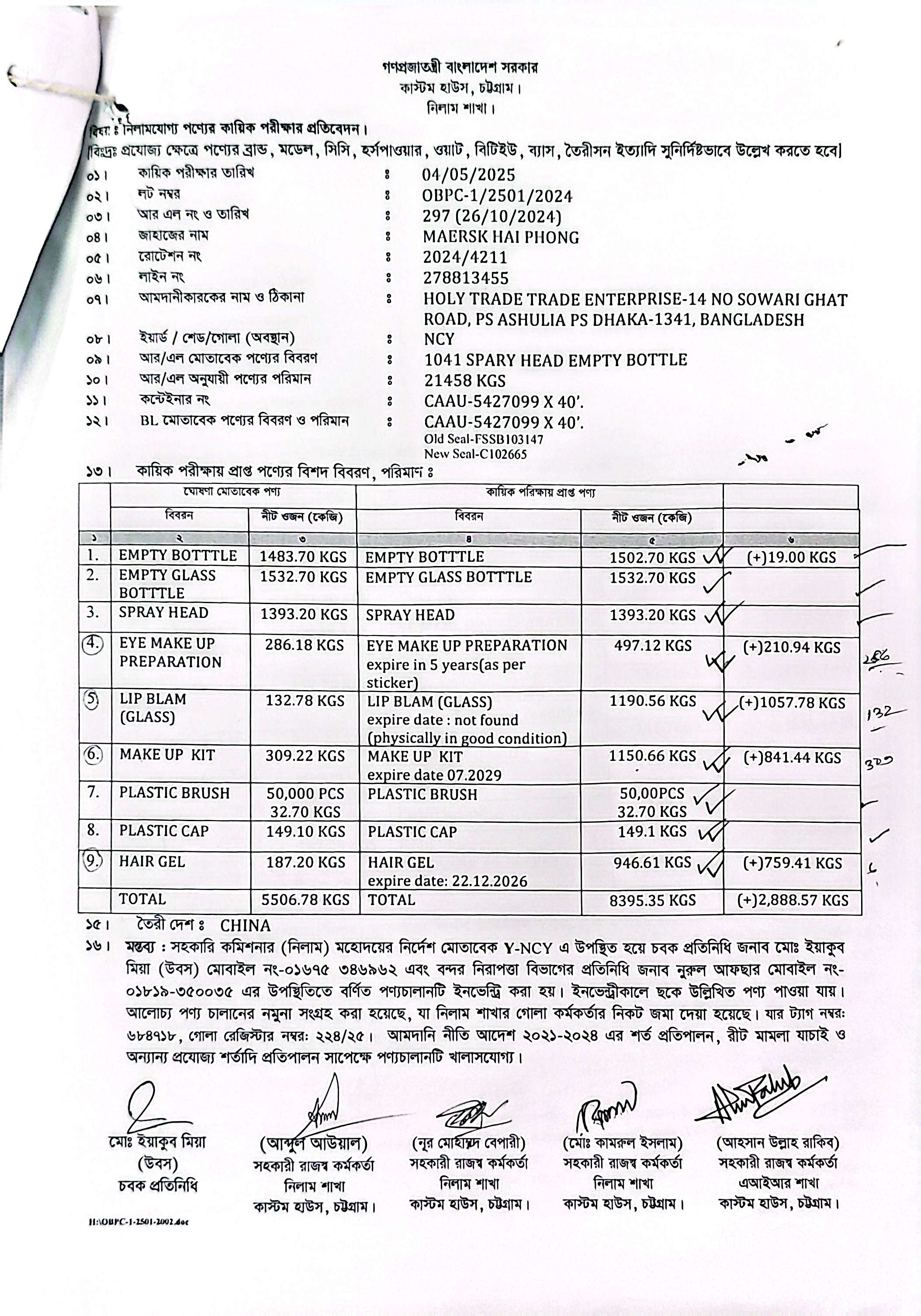 লটের শিরোনাম :EMPTY BOTTLE - 1502.70 KG, EMPTY GLASS BOTTLE - 1532.70 KG, SPRAY HEAD - 1393.20 KG, EYE MAKE UP PREPARATION - 497.12 KG, LIP PREPERATION - 1190.56 KG, MAKE UP KIT - 1150.66 KG, PLASTIC BRUSH 32.70 ( (Previous Bid: 0 TK)