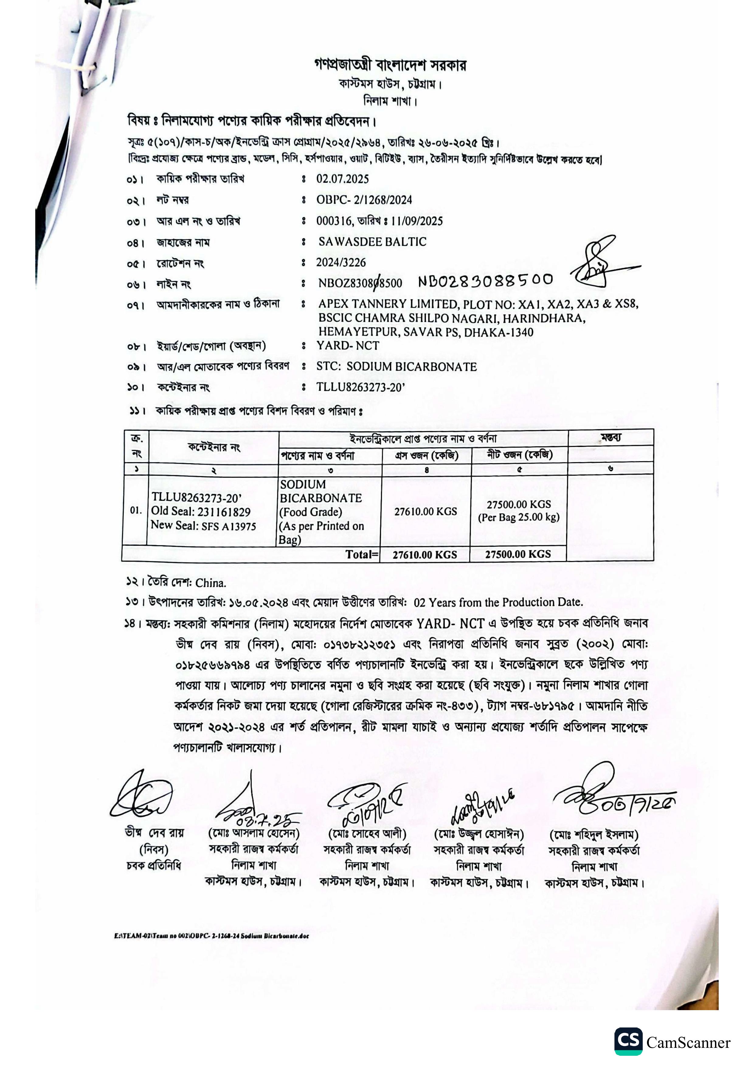 Terms & condition : আমদানি নীতি আদেশ এবং বিদ্যমান অন্যান্য আইন ও বিধি-বিধানের প্রযোজ্য সকল শর্ত পরিপালন এবং প্রযোজ্য ক্ষেত্রে রাসায়নিক পরীক্ষায় পণ্যের সঠিকতা ও ব্যবহার উপযোগিতা থাকা সাপেক্ষে খালাসকালে পণ্যের বর্ণনা এবং ওজন নিশ্চিত করে পণ্য ছাড়যোগ্য হবে। কোন লটভুক্ত পণ্যচালানে মেয়াদ উত্তীর্ণ/ধ্বসংযোগ্য পণ্য অন্তর্ভুক্ত থাকলে, উক্ত পণ্যচালানের ক্ষেত্রে মেয়াদ উত্তীর্ণ/ধ্বসংযোগ্য পণ্য ব্যতীত (প্রযোজ্য ক্ষেত্রে) কেবল মেয়াদযুক্ত/নিলামযোগ্য পণ্যসমূহ বিদ্যমান ও প্রযোজ্য আইন ও বিধি-বিধানের প্রযোজ্য সকল শর্ত পরিপালন সাপেক্ষে পণ্য ছাড়যোগ্য হবে। সার্ভার জটিলতা এড়ানোর জন্য আগ্রহী নিলাম ক্রেতাগণকে সরেজমিন পণ্য দেখে নিলামের নির্ধারিত শেষ তারিখ ও সময়ের পূর্বেই ই-নিলামে অংশগ্রহণ করার জন্য অনুরোধ করা যাচ্ছে। কোনরূপ কারণ দর্শানো ব্যতিরেকে কর্তৃপক্ষ যে কোন সময় ও পর্যায়ে যে কোন লট বা সকল লটের নিলাম আংশিক বা সম্পূর্ণ স্থগিত বা বাতিলের অধিকার সংরক্ষণ করেন।