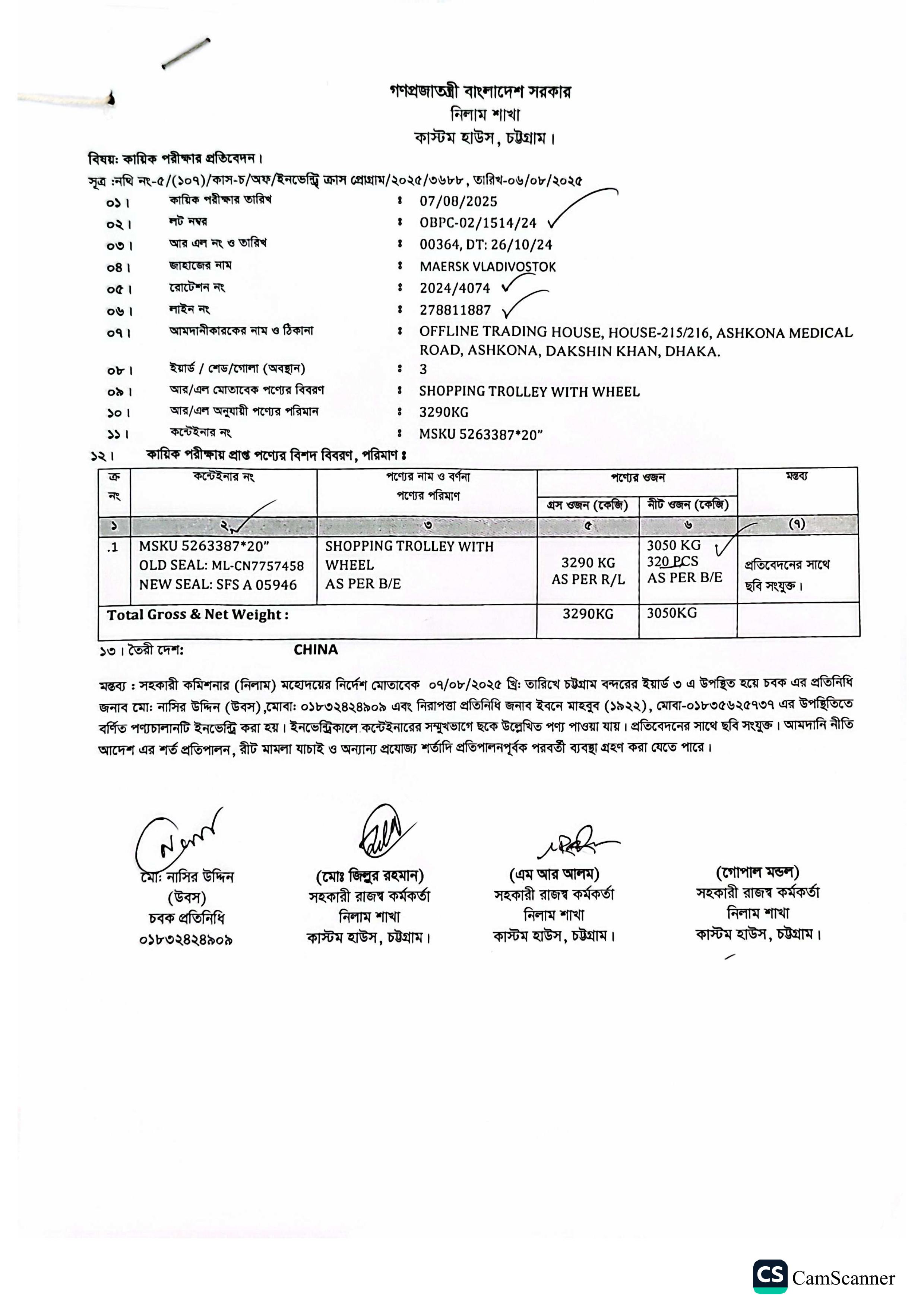Terms & condition : আমদানি নীতি আদেশ এবং বিদ্যমান অন্যান্য আইন ও বিধি-বিধানের প্রযোজ্য সকল শর্ত পরিপালন এবং প্রযোজ্য ক্ষেত্রে রাসায়নিক পরীক্ষায় পণ্যের সঠিকতা ও ব্যবহার উপযোগিতা থাকা সাপেক্ষে খালাসকালে পণ্যের বর্ণনা এবং ওজন নিশ্চিত করে পণ্য ছাড়যোগ্য হবে। কোন লটভুক্ত পণ্যচালানে মেয়াদ উত্তীর্ণ/ধ্বসংযোগ্য পণ্য অন্তর্ভুক্ত থাকলে, উক্ত পণ্যচালানের ক্ষেত্রে মেয়াদ উত্তীর্ণ/ধ্বসংযোগ্য পণ্য ব্যতীত (প্রযোজ্য ক্ষেত্রে) কেবল মেয়াদযুক্ত/নিলামযোগ্য পণ্যসমূহ বিদ্যমান ও প্রযোজ্য আইন ও বিধি-বিধানের প্রযোজ্য সকল শর্ত পরিপালন সাপেক্ষে পণ্য ছাড়যোগ্য হবে। সার্ভার জটিলতা এড়ানোর জন্য আগ্রহী নিলাম ক্রেতাগণকে সরেজমিন পণ্য দেখে নিলামের নির্ধারিত শেষ তারিখ ও সময়ের পূর্বেই ই-নিলামে অংশগ্রহণ করার জন্য অনুরোধ করা যাচ্ছে। কোনরূপ কারণ দর্শানো ব্যতিরেকে কর্তৃপক্ষ যে কোন সময় ও পর্যায়ে যে কোন লট বা সকল লটের নিলাম আংশিক বা সম্পূর্ণ স্থগিত বা বাতিলের অধিকার সংরক্ষণ করেন।