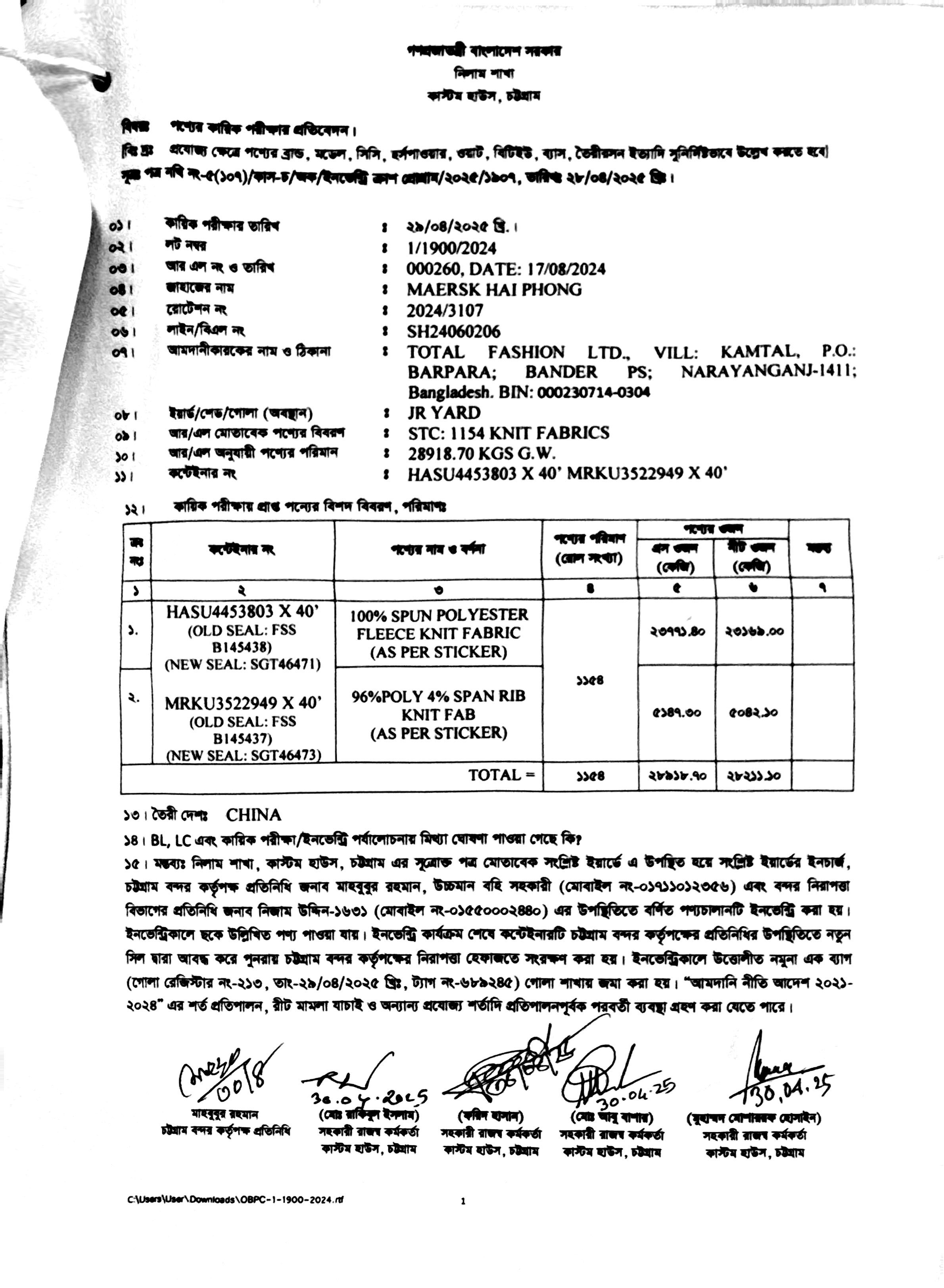 লটের শিরোনাম :100% Spun Polyester Fleece Knit Fabrics= 23,169.00 & 96% Poly 4% Span RIB Knit Fab= 5,042.10(Previous Bid: 0 TK)