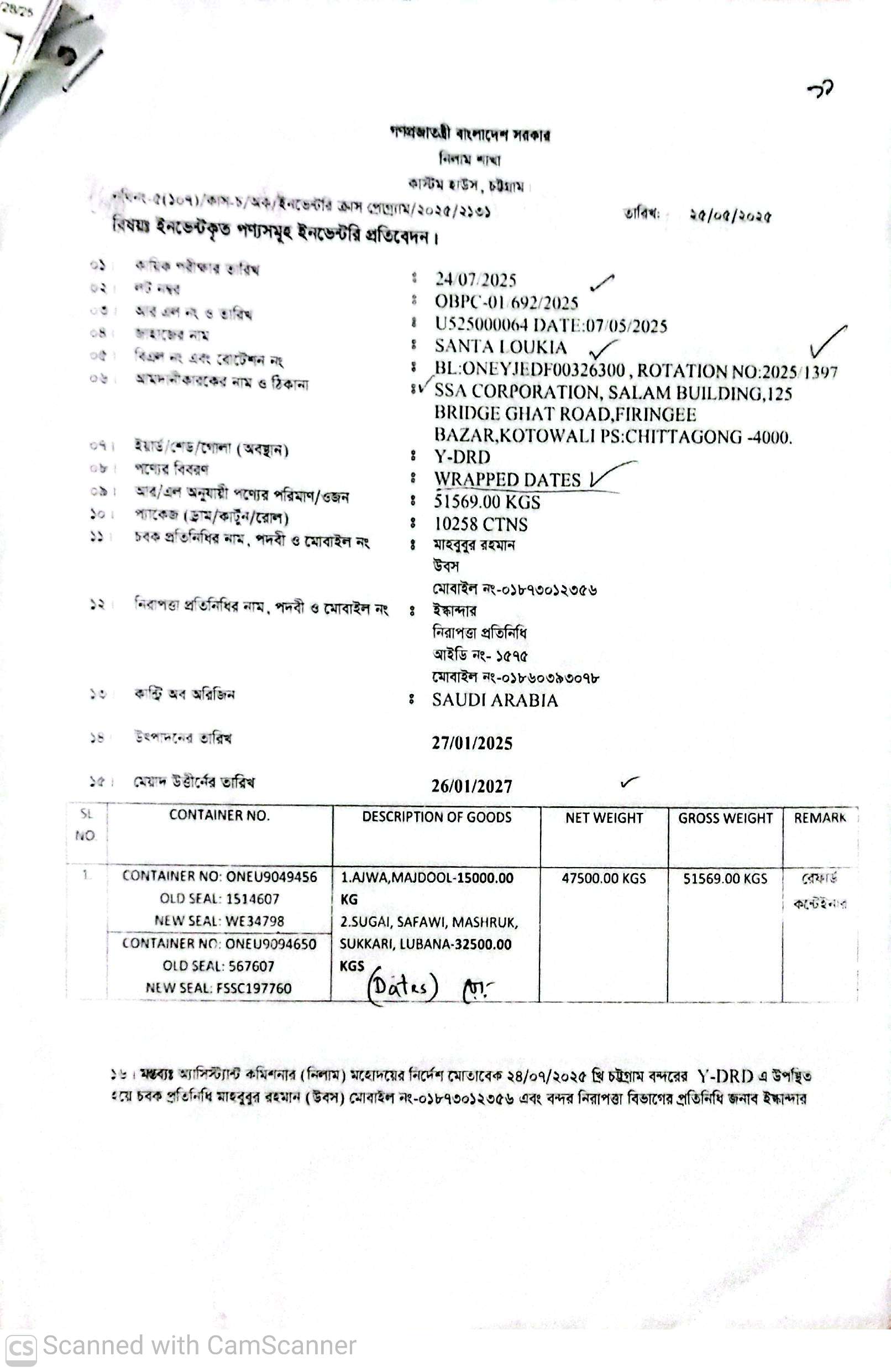 | কন্টেনার/জি আর নং |