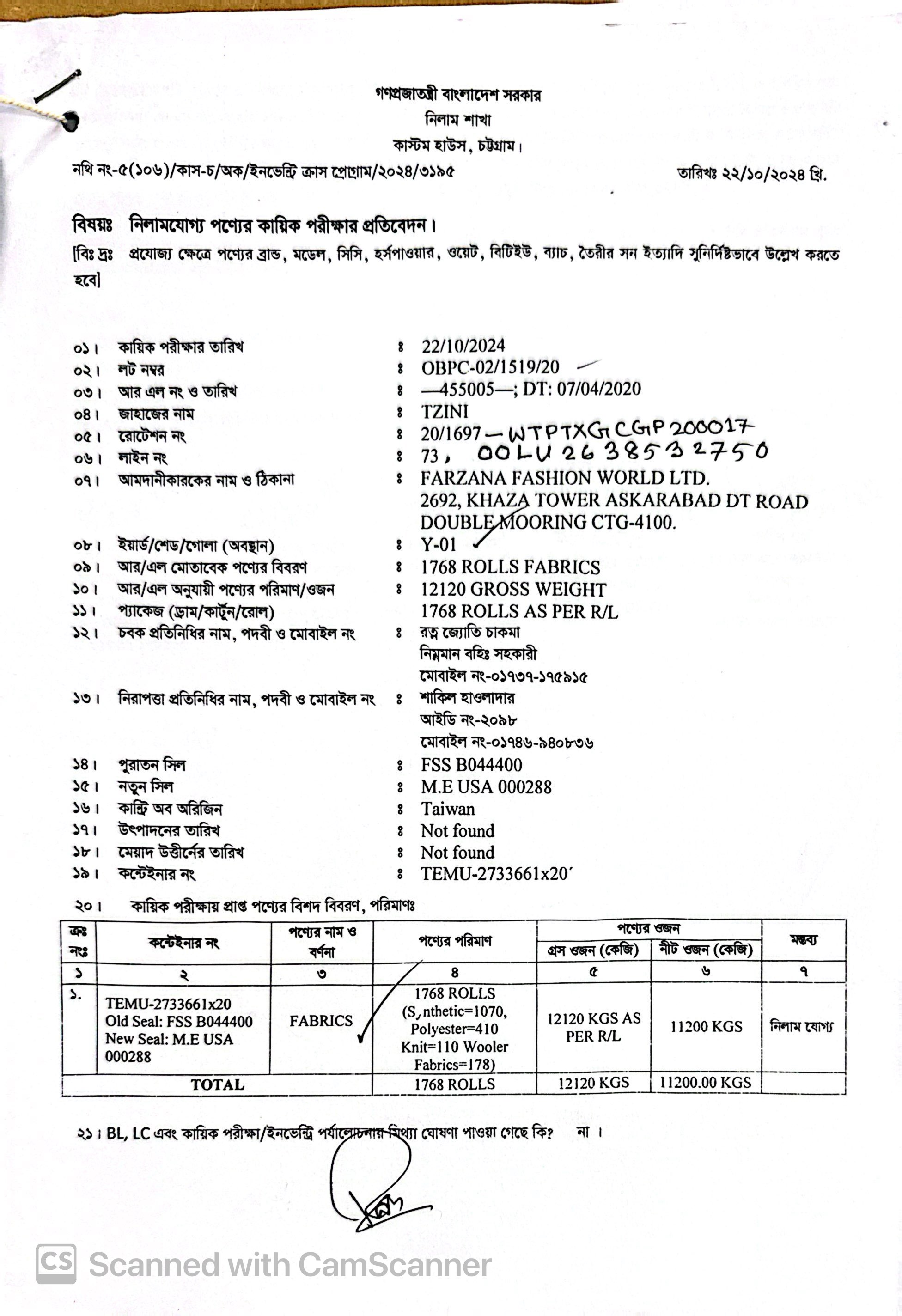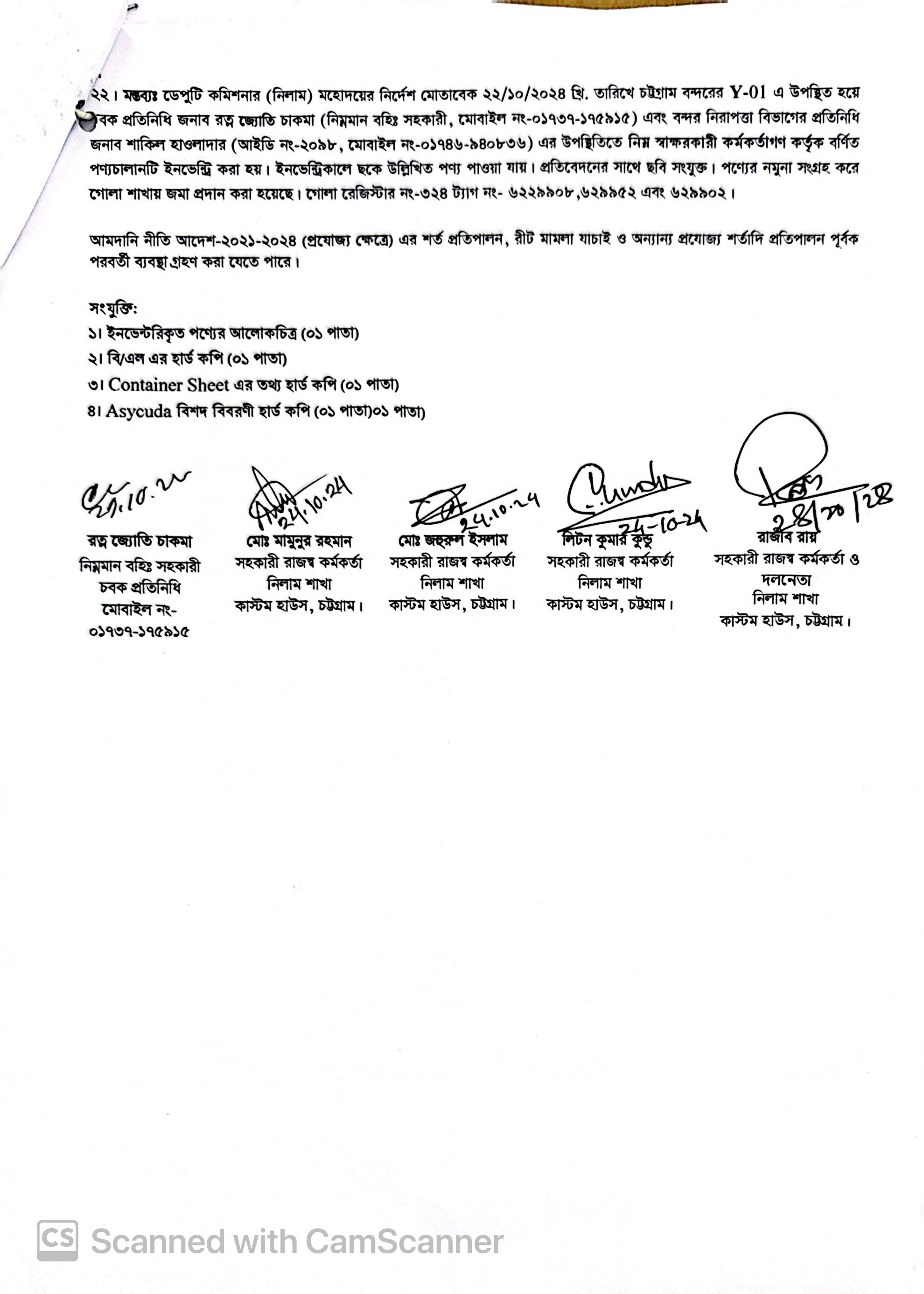 Terms & condition : আমদানি নীতি আদেশ এবং বিদ্যমান অন্যান্য আইন ও বিধি-বিধানের প্রযোজ্য সকল শর্ত পরিপালন এবং প্রযোজ্য ক্ষেত্রে রাসায়নিক পরীক্ষায় পণ্যের সঠিকতা ও ব্যবহার উপযোগিতা থাকা সাপেক্ষে খালাসকালে পণ্যের বর্ণনা এবং ওজন নিশ্চিত করে পণ্য ছাড়যোগ্য হবে। কোন লটভুক্ত পণ্যচালানে মেয়াদ উত্তীর্ণ/ধ্বসংযোগ্য পণ্য অন্তর্ভুক্ত থাকলে, উক্ত পণ্যচালানের ক্ষেত্রে মেয়াদ উত্তীর্ণ/ধ্বসংযোগ্য পণ্য ব্যতীত (প্রযোজ্য ক্ষেত্রে) কেবল মেয়াদযুক্ত/নিলামযোগ্য পণ্যসমূহ বিদ্যমান ও প্রযোজ্য আইন ও বিধি-বিধানের প্রযোজ্য সকল শর্ত পরিপালন সাপেক্ষে পণ্য ছাড়যোগ্য হবে। সার্ভার জটিলতা এড়ানোর জন্য আগ্রহী নিলাম ক্রেতাগণকে সরেজমিন পণ্য দেখে নিলামের নির্ধারিত শেষ তারিখ ও সময়ের (২৪/১২/২০২৫ খ্রি. তারিখ দুপুর ০২.০০ টা) পূর্বেই বিশেষ ই-নিলামে অংশগ্রহণ করার জন্য অনুরোধ করা যাচ্ছে। কোনরূপ কারণ দর্শানো ব্যতিরেকে কর্তৃপক্ষ যে কোন সময় ও পর্যায়ে যে কোন লট বা সকল লটের নিলাম আংশিক বা সম্পূর্ণ স্থগিত বা বাতিলের অধিকার সংরক্ষণ করেন।