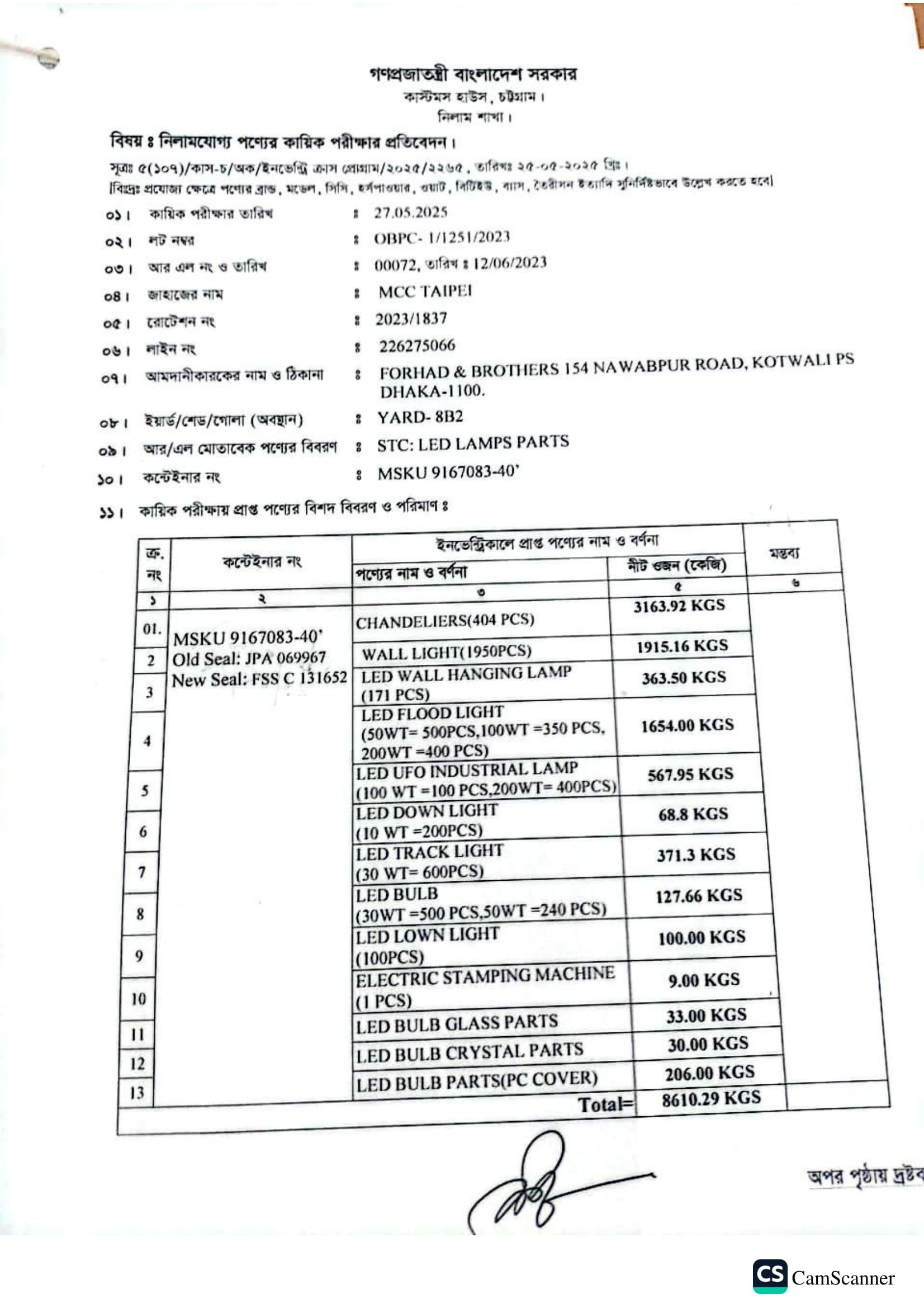 Chandeliers (404 Pcs)=3163.92 Kg; Wall Light (1950 Pcs)=1915.16 Kg; Led Wall Hanging Lamp (171 Pcs)=363.50 Kg; Led Flood Light=(50wt = 500 Pcs, 100wt = 350 Pcs 200wt = 400 pcs=1654.00 Kg; Led UFO Industrial Lamp 100wt = 100 pcs, 200wt = 400 pcs=567.95 Kg; Led Down Light (10wt = 200pcs)=68.80 Kg; Led Track Light (30wt = 600pcs)=371.30 Kg; Led Bulb (30wt = 500 pcs, 50wt = 240 pcs=127.66 Kg; Led Lown Light (100 Pcs)=100.00 Kg; Electric Stamping Machine (1 Pcs)=9.00 Kg; Led Bulb Glass Parts=33.00 Kg; Led Bulb Crystal Parts=30.00 Kg; Led Bulb Parts (PC Cover)=206.00 Kg; |