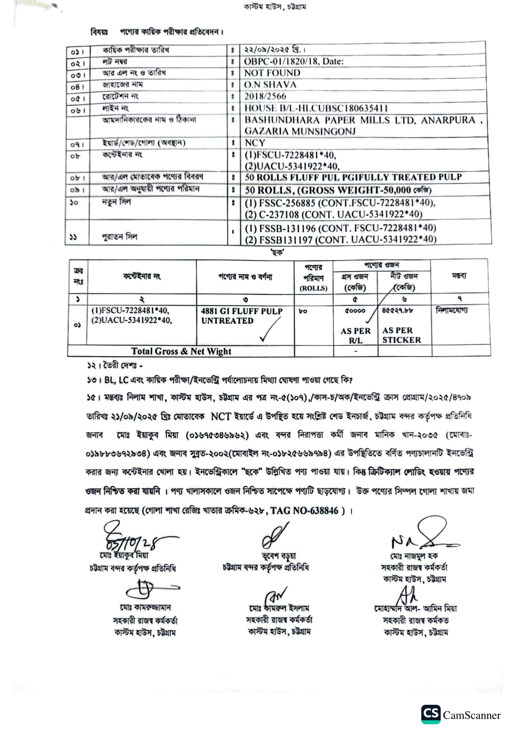 Terms & condition : আমদানি নীতি আদেশ এবং বিদ্যমান অন্যান্য আইন ও বিধি-বিধানের প্রযোজ্য সকল শর্ত পরিপালন এবং প্রযোজ্য ক্ষেত্রে রাসায়নিক পরীক্ষায় পণ্যের সঠিকতা ও ব্যবহার উপযোগিতা থাকা সাপেক্ষে খালাসকালে পণ্যের বর্ণনা এবং ওজন নিশ্চিত করে পণ্য ছাড়যোগ্য হবে। কোন লটভুক্ত পণ্যচালানে মেয়াদ উত্তীর্ণ/ধ্বসংযোগ্য পণ্য অন্তর্ভুক্ত থাকলে, উক্ত পণ্যচালানের ক্ষেত্রে মেয়াদ উত্তীর্ণ/ধ্বসংযোগ্য পণ্য ব্যতীত (প্রযোজ্য ক্ষেত্রে) কেবল মেয়াদযুক্ত/নিলামযোগ্য পণ্যসমূহ বিদ্যমান ও প্রযোজ্য আইন ও বিধি-বিধানের প্রযোজ্য সকল শর্ত পরিপালন সাপেক্ষে পণ্য ছাড়যোগ্য হবে। সার্ভার জটিলতা এড়ানোর জন্য আগ্রহী নিলাম ক্রেতাগণকে সরেজমিন পণ্য দেখে নিলামের নির্ধারিত শেষ তারিখ ও সময়ের (২৪/১২/২০২৫ খ্রি. তারিখ দুপুর ০২.০০ টা) পূর্বেই বিশেষ ই-নিলামে অংশগ্রহণ করার জন্য অনুরোধ করা যাচ্ছে। কোনরূপ কারণ দর্শানো ব্যতিরেকে কর্তৃপক্ষ যে কোন সময় ও পর্যায়ে যে কোন লট বা সকল লটের নিলাম আংশিক বা সম্পূর্ণ স্থগিত বা বাতিলের অধিকার সংরক্ষণ করেন।