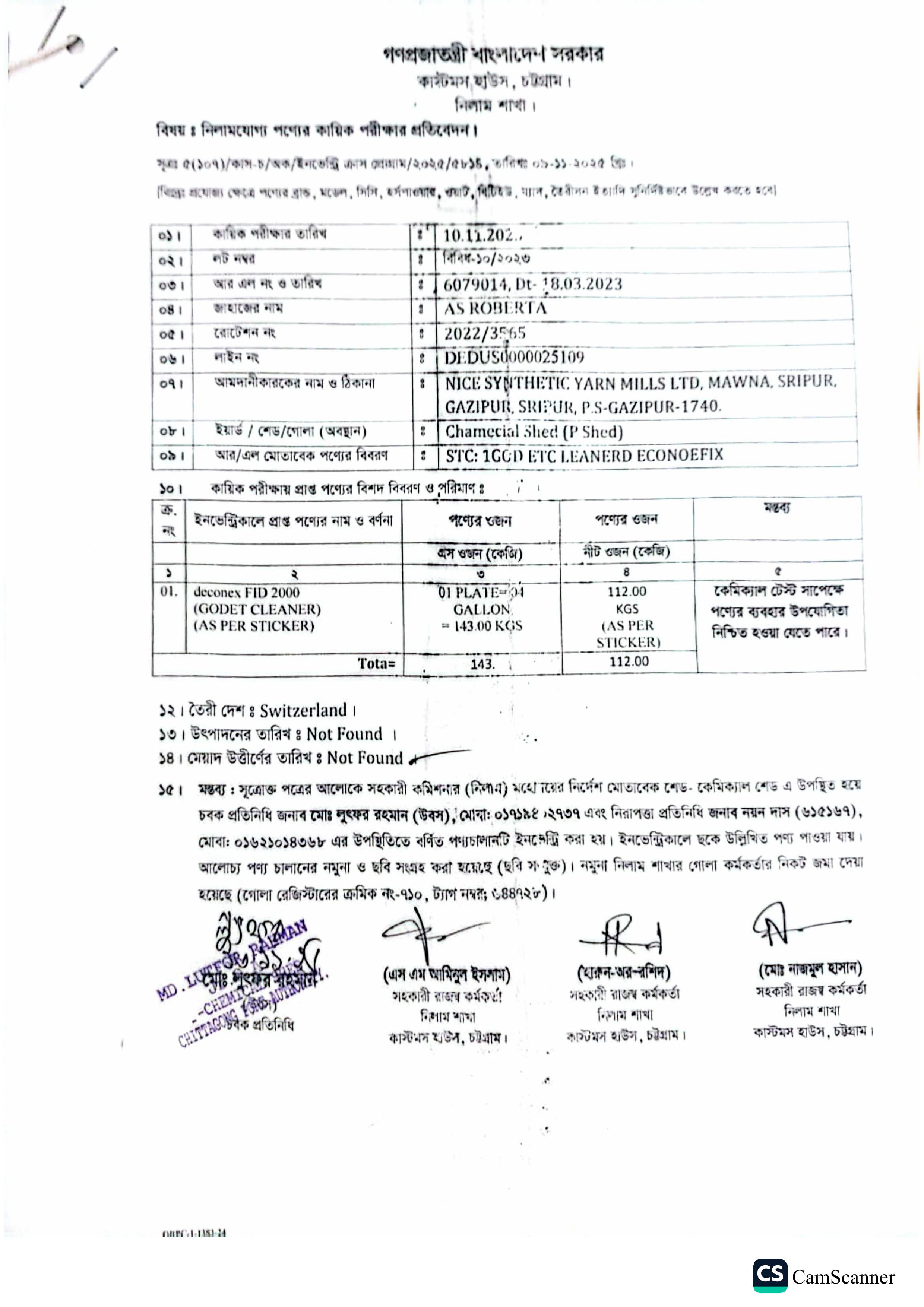 Terms & condition : আমদানি নীতি আদেশ এবং বিদ্যমান অন্যান্য আইন ও বিধি-বিধানের প্রযোজ্য সকল শর্ত পরিপালন এবং প্রযোজ্য ক্ষেত্রে রাসায়নিক পরীক্ষায় পণ্যের সঠিকতা ও ব্যবহার উপযোগিতা থাকা সাপেক্ষে খালাসকালে পণ্যের বর্ণনা এবং ওজন নিশ্চিত করে পণ্য ছাড়যোগ্য হবে। কোন লটভুক্ত পণ্যচালানে মেয়াদ উত্তীর্ণ/ধ্বসংযোগ্য পণ্য অন্তর্ভুক্ত থাকলে, উক্ত পণ্যচালানের ক্ষেত্রে মেয়াদ উত্তীর্ণ/ধ্বসংযোগ্য পণ্য ব্যতীত (প্রযোজ্য ক্ষেত্রে) কেবল মেয়াদযুক্ত/নিলামযোগ্য পণ্যসমূহ বিদ্যমান ও প্রযোজ্য আইন ও বিধি-বিধানের প্রযোজ্য সকল শর্ত পরিপালন সাপেক্ষে পণ্য ছাড়যোগ্য হবে। সার্ভার জটিলতা এড়ানোর জন্য আগ্রহী নিলাম ক্রেতাগণকে সরেজমিন পণ্য দেখে নিলামের নির্ধারিত শেষ তারিখ ও সময়ের (২৪/১২/২০২৫ খ্রি. তারিখ দুপুর ০২.০০ টা) পূর্বেই বিশেষ ই-নিলামে অংশগ্রহণ করার জন্য অনুরোধ করা যাচ্ছে। কোনরূপ কারণ দর্শানো ব্যতিরেকে কর্তৃপক্ষ যে কোন সময় ও পর্যায়ে যে কোন লট বা সকল লটের নিলাম আংশিক বা সম্পূর্ণ স্থগিত বা বাতিলের অধিকার সংরক্ষণ করেন।