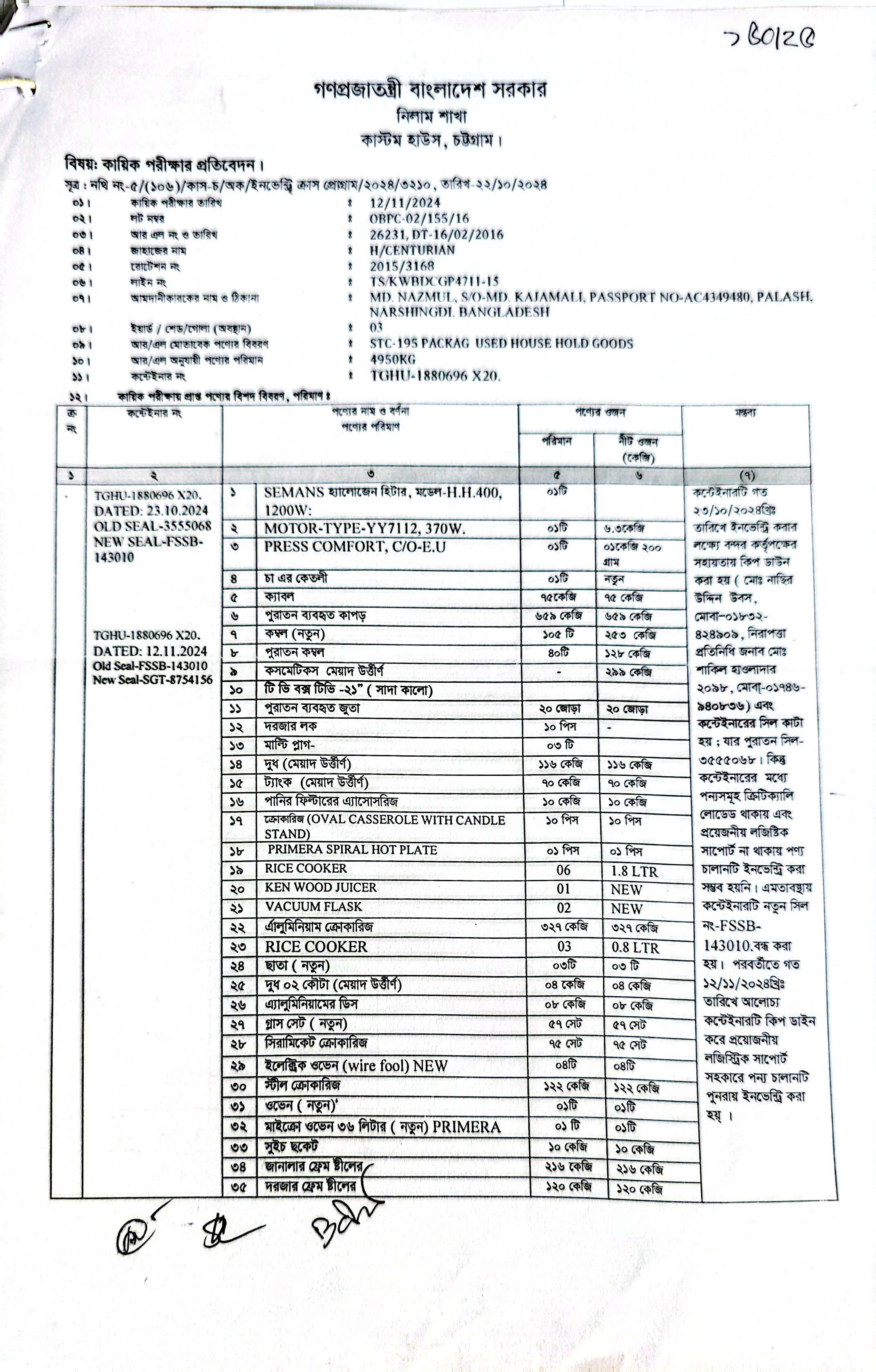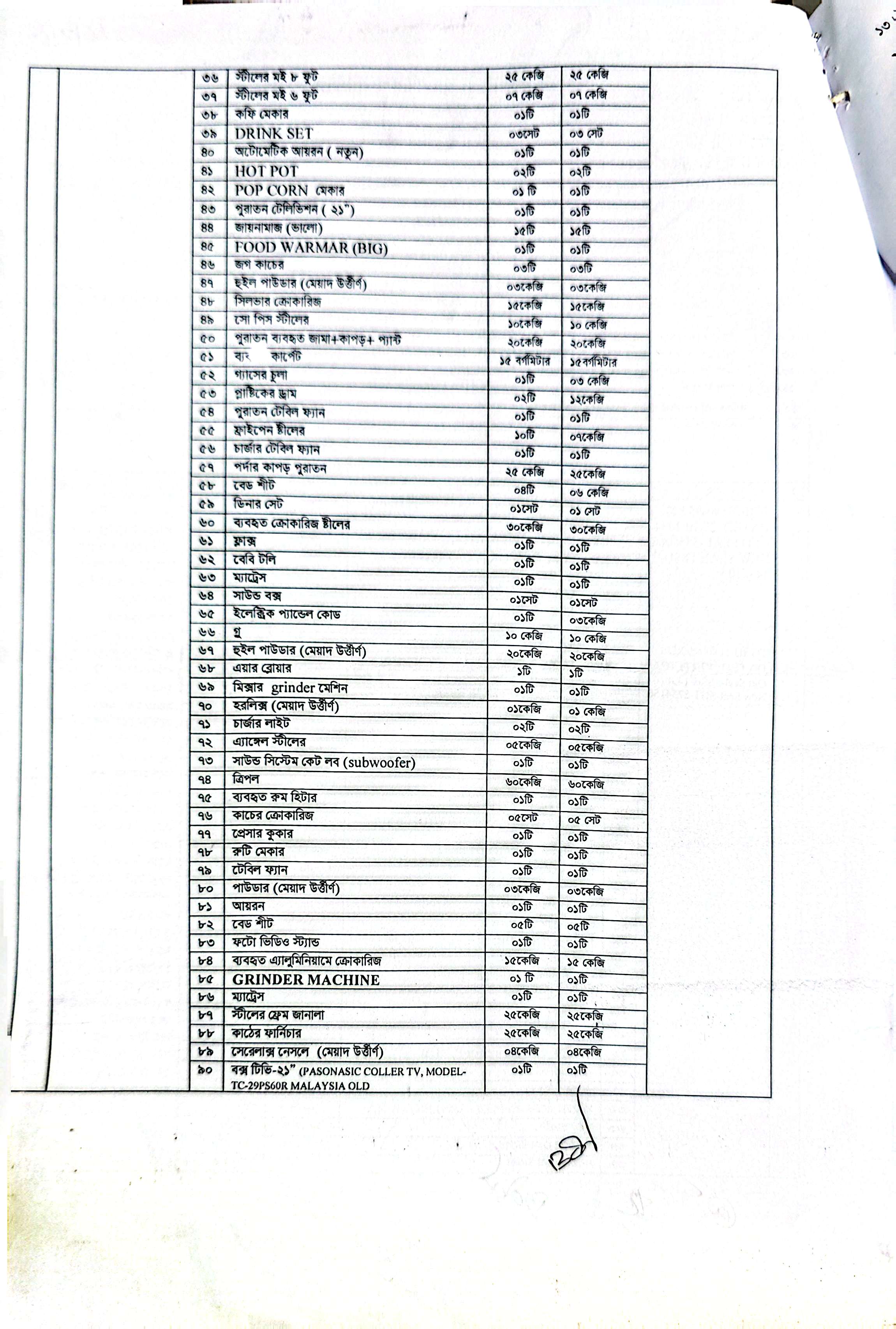 (1) Semans হ্যালোজেন হিটার, মডেল-H.H.400, 1200W (2) Motor- Type-YY7112, 370W= 6.3 kg; (3) Press Comfort, C/O-E.U; (4) চা এর কেতলী, ১টি (5) ক্যাবল ১ টি, নতুন (6) পুরাতন ব্যবহৃত কাপড়=৬৫৯ কেজি; (7) কম্বল নতুন, ১০৫ টি=২৫৩ কেজি (8) পুরাতন কম্বল=১২৮ কেজি; (9) কসমেটিকস মেয়াদ উত্তীর্ণ= ২৯৯ কেজি; (10) টিভি বক্স টিভি-২১” (সাদা কালো); (11) পুরাতন ব্যবহৃত জুতা-২০ জোড়া; (12) দরজার লক-১০ পিস; (13) মাল্টি প্লাগ-০৩ টি; (14) দুধ (মেয়াদ উত্তীর্ণ)= ১১৬ কেজি; (15) ট্যাংক (মেয়াদ উত্তীর্ণ)= ৭০ কেজি; (16) পানির ফিল্টারের এ্যাসোসরিজ= ১০ কেজি; (17) ক্রোকারিজ (Oval Casserole with Candle Stand)= ১০ পিস; (18) Primera Spiral Hotplate=০১ পিস; (19) Rice Cooker 1.8 Ltr; (20) Ken Wood Juicer (21) এ্যালুমিনিয়াম ক্রোকারিজ= ৩২৭ কেজি; (23) Rice Cooker 0.8 Ltr; (24) ছাতা (নতুন) ৩টি; (25) দুধ ০২ কৌটা (মেয়াদ উত্তীর্ণ)= ৪ কেজি (26) এ্যালুমিনিয়ামের ডিস= ৮ কেজি; (27) গ্লাস সেট (নতুন) ৫৭ সেট; (28) সিরামিক ক্রোকারিজ ৭৫ সেট; (29) ইলেট্রিক ওভেন (Wire Fool New) ৪টি; (30) স্টীল ক্রোকারিজ= ১২২ কেজি; (31) ওভেন (নতুন) ১ টি; (32) মাইক্রো ওভেন, ৩৬ লিটার (নতুন) ১ টি Primera; (33) সুইচ সকেট= ১০ কেজি; (34) জানালার ফ্রেম স্টীলের= ২১৬ কেজি; (35) দরজার ফ্রেম স্টীলের= ১২০ কেজি; (36) স্টীলের মই ৮ ফুট= ৮ কেজি; (37) স্টীলের মই ৬ ফুট= ৭ কেজি; (38) কফি মেকার ১ টি; (39) Drink Set, ৩ সেট; (40) অটোমেটিক আয়রন (নতুন) ১টি; (41) Hot Pot, ২টি (42) Pop Corn মেকার ১টি; (43) পুরাতন টেলিভিশন ২১” ১টি; (44) জায়নামাজ (ভালো) ১৫টি; (45) Food Marmar (BIG) ১টি; (46) জগ কাচের ৩টি; (47) হুইল পাউডার (মেয়াদ উত্তীর্ণ) ৩ কেজি; (48) সিলবার ক্রোকারিজ ১৫ কেজি (49) সো পিস স্টীলের ১০ কেজি; (50) পুরাতন ব্যবহৃত জামা+কাপড়+প্যান্ট ২০ কেজি (51) ব্যববহৃত কার্পেট ১৫ বর্গমিটার (52) গ্যাসের চুলা ১ টি (53) প্লাস্টিকের ড্রাম ১টি (54) পুরাতন টেবিল ফ্যান ১টি (55) ফ্লাইপেন স্টীলের ১০ টি (56) চার্জার টেবিল ফ্যান ১টি (57) পর্দার কাপড় পুরাতন ২৫ কেজি (58) বেড শীটে ৪ টি (59) ডিনার সেট ২৫ কেজি (60) ব্যবহৃত ক্রোকারিজ স্টীলের ৩০ কেজি (61) ফ্লাস্ক ১টি (62) বেবি টলি ১টি (63) ম্যাট্রেস ১টি (64) সাউন্ড বক্স ১টি (65) ইলেকট্রিক প্যান্ডেল কোড ১টি (66) গ্লু ১০ কেজি (67) হুইল পাউডার (মেয়াদ উত্তীর্ণ) ২০ কেজি (68) এয়ার ব্লোয়ার ১টি (69) মিক্সার গ্রিন্ডার মেশিন ১ টি (70) হরলিক্স (মেয়াদ উত্তীর্ণ) ১ কেজি (71) চার্জার লাইট ২টি; (72) এঙ্গেল স্টীলের ৫ কেজি; (73) সাউন্ড সিস্টেম কেট লব ১টি; (74) ত্রিপল ৬০ কেজি; (75) ব্যবহৃত রুম হিটার ১টি; (76) কাচের ক্রোকারিজ ৫সেট; (77) প্রেসার কুকার ১টি; (78) রুটি মেকার ১টি; (79) টেবিল ফ্যান ১টি; (80) পাওডার মেয়াদ উত্তীর্ণ ৩কেজি; আয়রন ১টি; (81) আয়কর ০১ টি, (82) বেড শীট ৫টি; (83) ফটো ভিডিও স্ট্যান্ড ১টি; (84) ব্যবহৃত এলুমিনিয়ামের ক্রোকারিজ ১৫ কেজি (85) গ্রিন্ডার মেশিন ১ টি; (86) ম্যাট্রেস ১টি; (87) স্টীলের ফ্রেম জানালা ২৫ কেজি; (88) কাঠের ফার্নিচার ২৫ কেজি; (89) সেরেলাক্স নেসলে মেয়াদ উত্তীর্ণ ৪ কেজি; (90) বক্স টিভি ২১” (Pasonasic Coller TV, Model-TC-29PS60R Malaysia Old) |